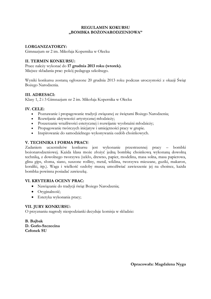 REGULAMIN KOKURSU „BOMBKA BOŻONARODZENIOWA” I.ORGANIZATORZY: Gimnazjum nr 2 im. Mikołaja Kopernika w Olecku II. TERMIN KONKURSU: Prace należy wykonać do 17 grudnia 2013 roku (wtorek). Miejsce składania prac: pokój pedagoga szkolnego. Wyniki konkursu zostaną ogłoszone 20 grudnia 2013 roku podczas uroczystości z okazji Świąt Bożego Narodzenia. III. ADRESACI: Klasy 1, 2 i 3 Gimnazjum nr 2 im. Mikołaja Kopernika w Olecku IV. CELE: Poznawanie i propagowanie tradycji związanej ze świętami Bożego Narodzenia; Rozwijanie aktywności artystycznej młodzieży; Poszerzanie wrażliwości estetycznej i rozwijanie wyobraźni młodzieży; Propagowanie twórczych inicjatyw i umiejętności pracy w grupie. Inspirowanie do samodzielnego wykonywania ozdób choinkowych. V. TECHNIKA I FORMA PRACY: Zadaniem uczestników konkursu jest wykonanie przestrzennej pracy – bombki bożonarodzeniowej. Każda klasa może złożyć jedną bombkę choinkową wykonaną dowolną techniką, z dowolnego tworzywa (szkło, drewno, papier, modelina, masa solna, masa papierowa, glina gips, słoma, siano, suszone rośliny, metal, wiklina, tworzywa mieszane, guziki, makaron, koraliki, itp.). Waga i wielkość ozdoby muszą umożliwiać zawieszenie jej na choince, każda bombka powinna posiadać zawieszkę. VI. KRYTERIA OCENY PRAC: Nawiązanie do tradycji świąt Bożego Narodzenia; Oryginalność; Estetyka wykonania pracy; VII. JURY KONKURSU: O przyznaniu nagrody niespodzianki decyduje komisja w składzie: B. Bajbak D. Gorlo-Szczecina Członek SU Opracowała: Magdalena Nyga