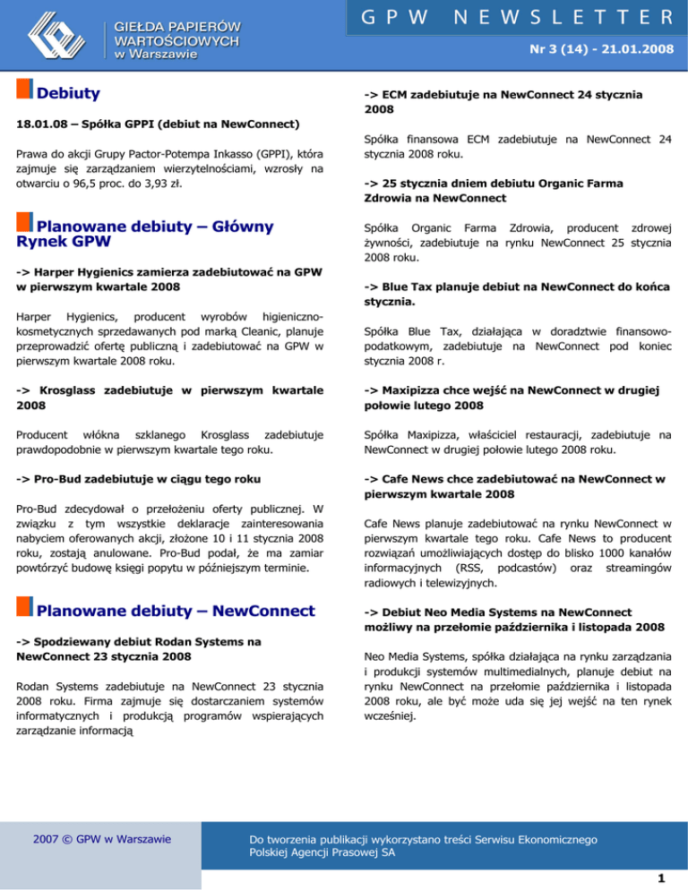 Nr 3 (14) - 21.01.2008 Debiuty -> ECM zadebiutuje na NewConnect 24 stycznia 2008 18.01.08 – Spółka GPPI (debiut na NewConnect) Prawa do akcji Grupy Pactor-Potempa Inkasso (GPPI), która zajmuje się zarządzaniem wierzytelnościami, wzrosły na otwarciu o 96,5 proc. do 3,93 zł. Planowane debiuty – Główny Rynek GPW -> Harper Hygienics zamierza zadebiutować na GPW w pierwszym kwartale 2008 Spółka finansowa ECM zadebiutuje na NewConnect 24 stycznia 2008 roku. -> 25 stycznia dniem debiutu Organic Farma Zdrowia na NewConnect Spółka Organic Farma Zdrowia, producent zdrowej Ŝywności, zadebiutuje na rynku NewConnect 25 stycznia 2008 roku. -> Blue Tax planuje debiut na NewConnect do końca stycznia. Harper Hygienics, producent wyrobów higienicznokosmetycznych sprzedawanych pod marką Cleanic, planuje przeprowadzić ofertę publiczną i zadebiutować na GPW w pierwszym kwartale 2008 roku. Spółka Blue Tax, działająca w doradztwie finansowopodatkowym, zadebiutuje na NewConnect pod koniec stycznia 2008 r. -> Krosglass zadebiutuje w pierwszym kwartale 2008 -> Maxipizza chce wejść na NewConnect w drugiej połowie lutego 2008 Producent włókna szklanego Krosglass zadebiutuje prawdopodobnie w pierwszym kwartale tego roku. Spółka Maxipizza, właściciel restauracji, zadebiutuje na NewConnect w drugiej połowie lutego 2008 roku. -> Pro-Bud zadebiutuje w ciągu tego roku -> Cafe News chce zadebiutować na NewConnect w pierwszym kwartale 2008 Pro-Bud zdecydował o przełoŜeniu oferty publicznej. W związku z tym wszystkie deklaracje zainteresowania nabyciem oferowanych akcji, złoŜone 10 i 11 stycznia 2008 roku, zostają anulowane. Pro-Bud podał, Ŝe ma zamiar powtórzyć budowę księgi popytu w późniejszym terminie. Planowane debiuty – NewConnect -> Spodziewany debiut Rodan Systems na NewConnect 23 stycznia 2008 Rodan Systems zadebiutuje na NewConnect 23 stycznia 2008 roku. Firma zajmuje się dostarczaniem systemów informatycznych i produkcją programów wspierających zarządzanie informacją 2007 © GPW w Warszawie Cafe News planuje zadebiutować na rynku NewConnect w pierwszym kwartale tego roku. Cafe News to producent rozwiązań umoŜliwiających dostęp do blisko 1000 kanałów informacyjnych (RSS, podcastów) oraz streamingów radiowych i telewizyjnych. -> Debiut Neo Media Systems na NewConnect moŜliwy na przełomie października i listopada 2008 Neo Media Systems, spółka działająca na rynku zarządzania i produkcji systemów multimedialnych, planuje debiut na rynku NewConnect na przełomie października i listopada 2008 roku, ale być moŜe uda się jej wejść na ten rynek wcześniej. Do tworzenia publikacji wykorzystano treści Serwisu Ekonomicznego Polskiej Agencji Prasowej SA 1 Nr 3 (14) - 21.01.2008 Tydzień na rynku Wszystkie branŜe zanotowały ujemną stopę zwrotu w minionym tygodniu. Najlepiej wypadły spółki z sektora medialnego (spadek o 2,41%), najgorzej zaś spółki z branŜy paliwowej (spadek o 11,24%). W tygodniu 14.01-18.01.2008 indeksy: • • • • • • • • • • WIG20 osiągnął na koniec tygodnia poziom 3.000,56 pkt (spadek w porównaniu z poprzednim tygodniem o 6,54 proc.); średnia wartość obrotów (na sesję) wyniosła 1.660 mln zł; zawarto przeciętnie (na sesję) 23.447 transakcji - średnia wartość 1 transakcji to 35.391 zł; mWIG40 osiągnął na koniec tygodnia poziom 3.193,51 pkt (spadek w porównaniu z poprzednim tygodniem o 6,66 proc.); średnia wartość obrotów (na sesję) wyniosła 378 mln zł; zawarto przeciętnie (na sesję) 10.883 transakcji – średnia wartość 1 transakcji to 17.361 zł; sWIG80 osiągnął na koniec tygodnia poziom 13.318,58 pkt (spadek w porównaniu z poprzednim tygodniem o 6,14 proc.); średnia wartość obrotów (na sesję) wyniosła 246 mln zł; zawarto przeciętnie (na sesję) 16.596 transakcji – średnia wartość 1 transakcji to 7.412 zł; NCIndex osiągnął na koniec tygodnia 115,67 pkt (spadek w porównaniu z poprzednim tygodniem o 2,40 proc.) w porównaniu do wartości 118,52 pkt na zamknięcie poprzedniego tygodnia NajwyŜsze tygodniowe zmiany kursów : Kurs z Kurs z Akcje 11-01-08 18-01-08 ATLANTIS 1,28 2,16 EUROFAKTR 6,70 7,70 śURAWIE 16,70 18,48 PROCHEM 34,49 38,11 JAGO 2,90 3,20 2007 © GPW w Warszawie Członkowie GPW 16.01.08 – HSBC BANK chce działać na Giełdzie w charakterze Członka Giełdy HSBC BANK plc złoŜył 16 stycznia 2008 roku wniosek o dopuszczenie do działania na Giełdzie w charakterze członka giełdy. Proponowany zakres działania to obrót wszystkimi papierami wartościowymi na rachunek własny oraz na rachunek klienta. HSBC BANK plc działa juŜ jako członek giełdy na London Stock Exchange, Deutsche Borse, Euronext, OMX i Borsa Italiana 16.01.08 – X-TB rozpoczyna działalność NewConnect w charakterze członka rynku na X-TRADE BROKERS DOM MAKLERSKI S.A rozpoczął 16 stycznia 2008 roku działanie na NewConnect w charakterze członka rynku. Zakres działania to obrót na własny rachunek oraz na rachunek klienta wszystkimi instrumentami finansowymi notowanymi na tym rynku. XTB jest 23 członkiem rynku. GPW Zmiana (%) 68,75 14,93 10,66 10,50 10,34 -> WSEInfoEngine S.A. przeprowadza 2 transmisje internetowe Między 15 a 21 stycznia WSEInfoEngine przeprowadziła 2 transmisje internetowe S.A. Do tworzenia publikacji wykorzystano treści Serwisu Ekonomicznego Polskiej Agencji Prasowej SA 2 Nr 3 (14) - 21.01.2008 Informacje o transmisjach: Data Nazwa spółki transmisji zlecającej transmisje 18-01-2008 21-01-2008 Grupa Pactor Potempa Inkasso S.A. Millennium Bank S.A. Temat transmisji Debiut na NewConnect Prezentacja wyników finansowych -> WSEInfoEngine S.A. przeprowadzi 4 transmisje internetową WSEInfoEngine S.A. planuje przeprowadzić 4 transmisje internetową. ABN AMRO, Societe Generale, Citibank International PLC, Bayerische Hypo- Und Vereinsbank AG, Rabobank, Erstebank, Volksbanken, Banco Millennium BCP). 15.01.08 – Pierwsze tegor