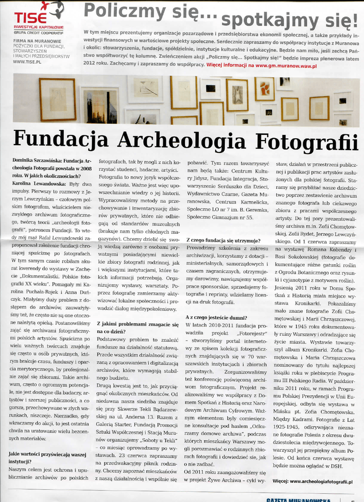Policzmy si«?...spotkajmy sU», INWgSTYCJe KAPITAt.OWe GRUPA CREDIT COOPERATIF W tym miejscu prezentujemy organizacje pozarzadowe i przedsiebiorstwa ekonomii spotecznej, a takze przyktady in- FIRM A NA MURANOWIE westycji finansowych w wartosciowe projekty spoteczne. Serdecznie zapraszamy do wspotpracy instytucje z Muranowa POZYCZK! DL.A FUNDACJf, STOWARZYSZEN I MALYCH PRZEDSI^BIORSTW i okolic: stowarzyszenia, fundacje, spotdzielnie, instytucje kulturafne i edukacyjne. B^dzie nam mito, jesii zechca Pari- WWW.TISE.PL 2012 roku. Zachecamy i zapraszamy do wspotpracy. Wie.cej informacji na www.gm.muranow.waw.pl stwo wspottworzyc t$ kolumne. Zwienczeniem akcji ,,Policzmy si^... Spotkajmy sie.!" b^dzie impreza pfenerowa iatem 1A- Fimdacja Archeologia Fotografii Dominika Szczawinska: Fundacja Archeologia Fotografii powstala w 2008 roku. Wjakich okolicznosciach? fotografach, tak by mogli z nich korzystac studenci, badacze, artysci. Fotografia to nowy jQzyk wspolcze- Karolina Lewandowska: Byly dwa impulsy. Pierwszy to rozmowy z Je- snego swiata. Wazne jest wie. c upowszechnianie wiedzy o jej historii. Wypracowalismy metody na prze- rzym Lewczyhskim - czofowym polskim fotografem, wlascicielem niezwyktego archiwum fotograficznego, tworca teorii ,,archeologii fotografii", patronem Fundacji. To wtedy mdj maz _Rafal Lewandowski zaproponowal zalozenie fundacji chroniacej spuscizne; po fotografach. W tym samym czasie robilam akurat kwerendy do wystawy w ZachQcie ,,Dokumentalistki. Polskie fotografki XX wieku". Pomagaly mi Karolina Puchala-Rojek i Anna Duriczyk. Miah/smy duzy problem z dostQpem do archiwow, zauwazyhysmy tez, ze czesto nie sa one otoczone nalezyta opieka. Postanowiiisray zajac sie; archiwami fotograficznymi polskich artystow. Spuscizna po wielu waznych tworcach znajduje SIQ czQsto u osob prywatnych, ktorym brakuje czasu, funduszy i oparcia merytorycznego, by profesjonalnie zaj^c si? zbiorami. Takie archiwum, czQsto o ogromnym potencjale, nie jest dost^pne dla badaczy, artystow i szerszej publicznosci, a co gorsza, przechowywane w zlych warunkach, niszczeje. Nierzadko, gdy wkraczamy do akcji, to jest ostatnia chwila na uratowanie wielu bezcennych materialow. Jakie wartosci przyswiecaja waszej instytucji? Naszym celem jest ochrona i upublicznianie archiwow po polskich chowywanie i inwentaryzacj^ zbiorow prywatnych, ktore nie odbiegaja od standardow muzealnych (brakuje nam tylko chlodnych magazynow). Chcemy dzielic si? swoja wiedza zarowno z osobami prywatnymi posiadajacymi niewielkie zbiory fotografn rodzinnej, jak i wi^kszymi instytucjami, ktore takich informacji potrzebuja. Organizujemy wystawy, warsztaty. Poprzez fotografi? zamierzamy aktywizowac lokalne spolecznosci i pro- pobawic. Tym razem towarzyszyc nam b^dq takze: Centrum Kulturyjidysz, Fundacja Integracja, Stowarzyszenie Serduszko dla Dzieci, Wydawnictwo Czarne, Gazeta Muranowska. Centrum Karmelicka, Spoieczne LO nr 7 im. B. Geremka, Spoleczne Gimnazjum nr 55. archiwizacji, korzystamy z dotacji ministerialnych, samorzadowych i czasem zagranicznych, otrzymujemy darowizny nawiazujemy wspol- staw, dzialah w przestrzeni pubhcznej i publikacji prac artystow zashizonych dla polskiej fotografii, Staramy si? przyblizac nasze dziedzictwo poprzez zestawienie archiwum znanego fotografa lub ciekawego zbioru z pracami wspolczesnego artysty. Do tej pory prezentowalismy archiwa m.in. Zofii Chom^towskiej, Zofii Rydet, Jerzego Lewczyhskiego. Od 1 czerwca zapraszamy na wystawe. Romana Kobendzy i Basi Sokolowskiej (fotografie dokumentujace rozne gatunki roslm z Ogrodu Botanicznego oraz rysunki i cyjanotypie z niotywem rosliii). prace sponsorskie, sprzedajemy fotografie i reprinty udzielamy licencji na druk fotografii. Jesienia 2011 roku w Domu Spotkaii z Historia miafa miejsce wystawa Kronikarki. Pokazalismy Z czego fundacja si^ utrzymuje? Prowadzirny szkolenia z zakresu wadzic dialog miedzypokoleniowy. Z jakinii problemami zniagacie si^ na co dzien? Podstawowy problem to znalezc fundusze na dzialalnosc statutowa. Przede wszystkim dzialalnosc zwiazana z opracowaniem i digitalizacja archiwow, ktore wymagajq stabilnego budzetu. Druga kwestia^ jest to, jak przyciagnac okolicznych mieszkahcow. Od niedawna nasza siedziba znajduje si^ przy Skwerze Tekli Badarzewskiej na ul. Andersa 13. Razem 2 Galeria Starter, Fundacja Promocji Sztuki Wspolczesnej i Stacja Muranow organizujemy ,,Soboty u Tekli" - co miesiac oprowadzamy po wystawach, 23 czerwca zapraszamy na przedwakacyjny piknik rodzinny. Chcemy zapoznac mieszkahcow z nasza dzialalnoscia i wspohiie si^ A z czego jestescie dumni? W latach 2010-2011 fundacja prowadzila projekt ,,Fotorejestr" - stworzylismy portal internetowy ze spisem kolekcji fotograficznych znajdujacych si^ w 70 warszawskJch instytucjach i zbiorach prywatnych. Zorganizowalismy tez konferencj^ poswi^cona archiwom fotograflcznyni. Projekt realizowalismy we wspolpracy z Domem Spotkaii z Historia oraz Narodo^vym Archiwum Cyfrowym. Waznym elementem byhy comiesi^czne konsultacje pod haslem ,,Odkurzamy domowe archiwa", podczas ktorych mieszkahcy Warszawy mogli porozmawiac o rodzmnych zbiorach fotografii i dowiedziec sie, jak o nie zadbac. Od 2011 roku zaangazowalismy siQ w projekt Zywe Archiwa - cykl wy- male znane fotografie Zofii ChoniQtowskiej i Marii Chrzaszczowej, ktore w 1945 roku dokumentowary ruiny Warszawy i odradzajace siQ zycie miasta. Wystawie towarzyszyl album Kronikarki. Zofia Chometowska i Maria Chrzaszczowa nominowany do tytuhi najlepszej ksiazki roku w plebiscycie Programu III Polskiego Radia. W pazdzierniku 2011 roku, w rarnach Programu Polskiej Prezydencji w Unh" Europejskiej, odbyla SIQ wystawa w Mirisku pt. Zofia ChomQtowska. Mie.dzy Kadrami. Fotografie z Lat 1925-1945, odkrywajaca nieznane fotografie Polesia z okresu dwudziestolecia mie.dzywojennego. Towarzyszyl jej przepi^kny album Polesie. Od korica czerwca b^dzie mozna ogladac w DSH. j: www.archeologiafotografli.pl CflTCTA