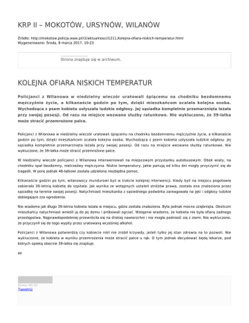 KRP II – MOKOTÓW, URSYNÓW, WILANÓW Źródło: http://mokotow.policja.waw.pl/r2/aktualnosci/1211,Kolejna-ofiara-niskich-temperatur.html Wygenerowano: Środa, 8 marca 2017, 10:23 Strona znajduje się w archiwum. KOLEJNA OFIARA NISKICH TEMPERATUR Policjanci z Wilanowa w niedzielny wieczór uratowali śpiącemu na chodniku bezdomnemu mężczyźnie życie, a kilkanaście godzin po tym, dzięki mieszkańcom ocalała kolejna osoba. Wychodząca z psem kobieta usłyszała ludzkie odgłosy. Jej sąsiadka kompletnie przemarznięta leżała przy swojej posesji. Od razu na miejsce wezwano służby ratunkowe. Nie wykluczone, że 39-latka może stracić przemrożone palce. Policjanci z Wilanowa w niedzielny wieczór uratowali śpiącemu na chodniku bezdomnemu mężczyźnie życie, a kilkanaście godzin po tym, dzięki mieszkańcom ocalała kolejna osoba. Wychodząca z psem kobieta usłyszała ludzkie odgłosy. Jej sąsiadka kompletnie przemarznięta leżała przy swojej posesji. Od razu na miejsce wezwano służby ratunkowe. Nie wykluczone, że 39-latka może stracić przemrożone palce. W niedzielny wieczór policjanci z Wilanowa interweniowali na miejscowym przystanku autobusowym. Obok wiaty, na chodniku spał bezdomny, nietrzeźwy mężczyzna. Niskie temperatury, jakie panują od kilku dni mogły przyczynić się do tragedii. W porę jednak 46-latkowi została udzielona niezbędna pomoc. Kilkanaście godzin po tym, wilanowscy mundurowi byli w trakcie kolejnej interwencji. Kiedy byli na miejscu pogotowie zabierało 39-letnią kobietę do szpitala. Jak wynika ze wstępnych ustaleń stróżów prawa, została ona znaleziona przez sąsiadkę na terenie swojej posesji. Natychmiast mieszkanka z sąsiedniego podwórka zareagowała na jęki i odgłosy ludzkie dobiegające zza ogrodzenia. Nie wiadomo jak długo 39-letnia kobieta leżała w miejscu, gdzie została znaleziona. Była jednak mocno zziębnięta. Okoliczni mieszkańcy natychmiast wnieśli ją do jej domu i próbowali ogrzać. Wstępnie wiadomo, że kobieta nie była ofiarą żadnego przestępstwa. Najprawdopodobniej przewróciła się na śliskiej nawierzchni i nie mogła podnieść się z ziemi. Nie wykluczone, że przyczynił się do tego wypity przez uratowaną wcześniej alkohol. Policjanci z Wilanowa potwierdzą czy kobiecie nikt nie zrobił krzywdy, jeżeli tylko jej stan zdrowia na to pozwoli. Nie wykluczone, że kobieta w wyniku przemrożenia może stracić palce u rąk. O tym jednak decydować będą lekarze, pod których opieką obecnie 39-latka się znajduje. ao Ocena: 0/5 (0) Tweetnij