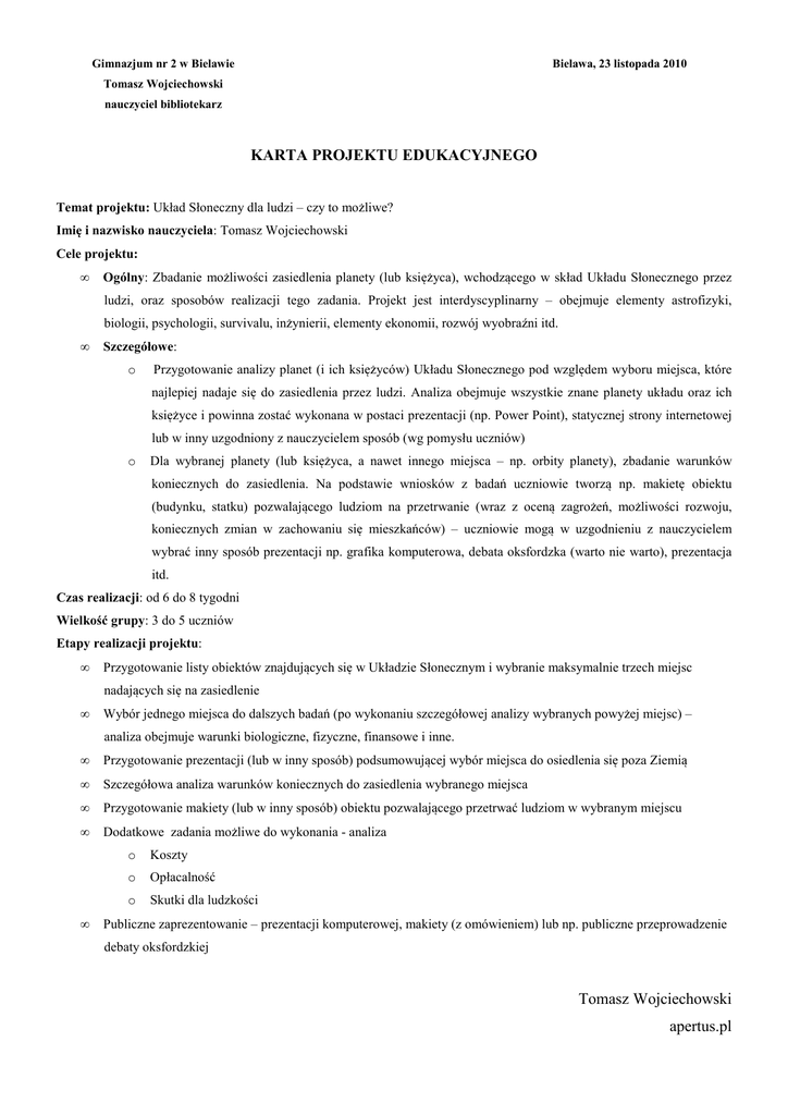 Gimnazjum nr 2 w Bielawie Bielawa, 23 listopada 2010 Tomasz Wojciechowski nauczyciel bibliotekarz KARTA PROJEKTU EDUKACYJNEGO Temat projektu: Układ Słoneczny dla ludzi – czy to możliwe? Imię i nazwisko nauczyciela: Tomasz Wojciechowski Cele projektu: • Ogólny: Zbadanie możliwości zasiedlenia planety (lub księżyca), wchodzącego w skład Układu Słonecznego przez ludzi, oraz sposobów realizacji tego zadania. Projekt jest interdyscyplinarny – obejmuje elementy astrofizyki, biologii, psychologii, survivalu, inżynierii, elementy ekonomii, rozwój wyobraźni itd. • Szczegółowe: o Przygotowanie analizy planet (i ich księżyców) Układu Słonecznego pod względem wyboru miejsca, które najlepiej nadaje się do zasiedlenia przez ludzi. Analiza obejmuje wszystkie znane planety układu oraz ich księżyce i powinna zostać wykonana w postaci prezentacji (np. Power Point), statycznej strony internetowej lub w inny uzgodniony z nauczycielem sposób (wg pomysłu uczniów) o Dla wybranej planety (lub księżyca, a nawet innego miejsca – np. orbity planety), zbadanie warunków koniecznych do zasiedlenia. Na podstawie wniosków z badań uczniowie tworzą np. makietę obiektu (budynku, statku) pozwalającego ludziom na przetrwanie (wraz z oceną zagrożeń, możliwości rozwoju, koniecznych zmian w zachowaniu się mieszkańców) – uczniowie mogą w uzgodnieniu z nauczycielem wybrać inny sposób prezentacji np. grafika komputerowa, debata oksfordzka (warto nie warto), prezentacja itd. Czas realizacji: od 6 do 8 tygodni Wielkość grupy: 3 do 5 uczniów Etapy realizacji projektu: • Przygotowanie listy obiektów znajdujących się w Układzie Słonecznym i wybranie maksymalnie trzech miejsc nadających się na zasiedlenie • Wybór jednego miejsca do dalszych badań (po wykonaniu szczegółowej analizy wybranych powyżej miejsc) – analiza obejmuje warunki biologiczne, fizyczne, finansowe i inne. • Przygotowanie prezentacji (lub w inny sposób) podsumowującej wybór miejsca do osiedlenia się poza Ziemią • Szczegółowa analiza warunków koniecznych do zasiedlenia wybranego miejsca • Przygotowanie makiety (lub w inny sposób) obiektu pozwalającego przetrwać ludziom w wybranym miejscu • Dodatkowe zadania możliwe do wykonania - analiza • o Koszty o Opłacalność o Skutki dla ludzkości Publiczne zaprezentowanie – prezentacji komputerowej, makiety (z omówieniem) lub np. publiczne przeprowadzenie debaty oksfordzkiej Tomasz Wojciechowski apertus.pl