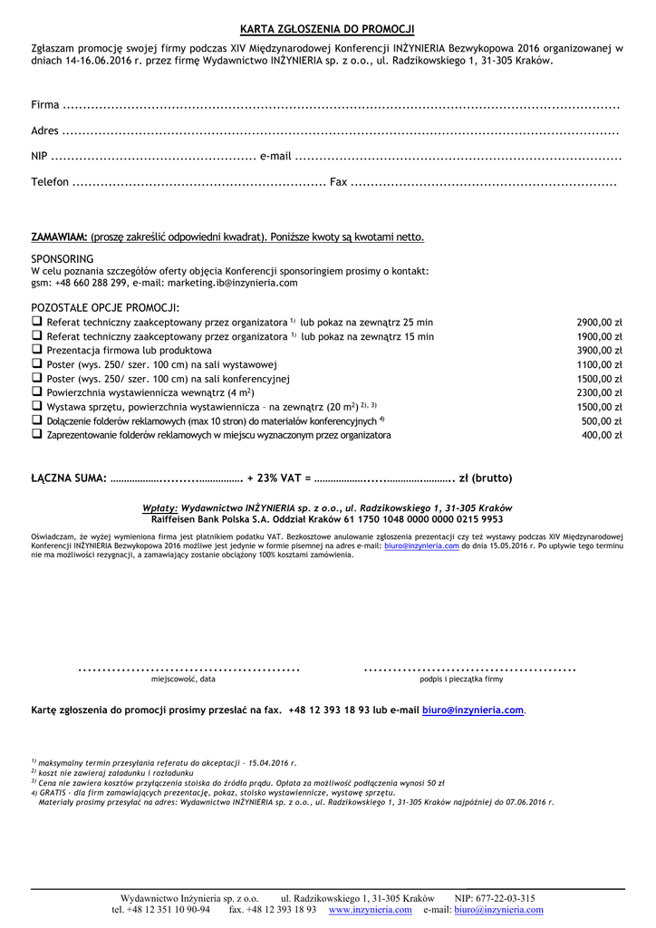 KARTA ZGŁOSZENIA DO PROMOCJI Zgłaszam promocję swojej firmy podczas XIV Międzynarodowej Konferencji INŻYNIERIA Bezwykopowa 2016 organizowanej w dniach 14-16.06.2016 r. przez firmę Wydawnictwo INŻYNIERIA sp. z o.o., ul. Radzikowskiego 1, 31-305 Kraków. Firma .......................................................................................................................................... Adres .......................................................................................................................................... NIP ................................................... e-mail ................................................................................. Telefon ............................................................... Fax .................................................................. ZAMAWIAM: (proszę zakreślić odpowiedni kwadrat). Poniższe kwoty są kwotami netto. SPONSORING W celu poznania szczegółów oferty objęcia Konferencji sponsoringiem prosimy o kontakt: gsm: +48 660 288 299, e-mail: [email protected] POZOSTAŁE OPCJE PROMOCJI: Referat techniczny zaakceptowany przez organizatora 1) lub pokaz na zewnątrz 25 min Referat techniczny zaakceptowany przez organizatora 1) lub pokaz na zewnątrz 15 min Prezentacja firmowa lub produktowa Poster (wys. 250/ szer. 100 cm) na sali wystawowej Poster (wys. 250/ szer. 100 cm) na sali konferencyjnej Powierzchnia wystawiennicza wewnątrz (4 m2) Wystawa sprzętu, powierzchnia wystawiennicza – na zewnątrz (20 m2) 2), 3) Dołączenie folderów reklamowych (max 10 stron) do materiałów konferencyjnych 4) Zaprezentowanie folderów reklamowych w miejscu wyznaczonym przez organizatora 2900,00 zł 1900,00 zł 3900,00 zł 1100,00 zł 1500,00 zł 2300,00 zł 1500,00 zł 500,00 zł 400,00 zł ŁĄCZNA SUMA: ………………..........……………. + 23% VAT = ………………......………….……….. zł (brutto) Wpłaty: Wydawnictwo INŻYNIERIA sp. z o.o., ul. Radzikowskiego 1, 31-305 Kraków Raiffeisen Bank Polska S.A. Oddział Kraków 61 1750 1048 0000 0000 0215 9953 Oświadczam, że wyżej wymieniona firma jest płatnikiem podatku VAT. Bezkosztowe anulowanie zgłoszenia prezentacji czy też wystawy podczas XIV Międzynarodowej Konferencji INŻYNIERIA Bezwykopowa 2016 możliwe jest jedynie w formie pisemnej na adres e-mail: [email protected] do dnia 15.05.2016 r. Po upływie tego terminu nie ma możliwości rezygnacji, a zamawiający zostanie obciążony 100% kosztami zamówienia. .............................................. miejscowość, data ............................................ podpis i pieczątka firmy Kartę zgłoszenia do promocji prosimy przesłać na fax. +48 12 393 18 93 lub e-mail [email protected]. 1) maksymalny termin przesyłania referatu do akceptacji – 15.04.2016 r. koszt nie zawieraj załadunku i rozładunku 3) Cena nie zawiera kosztów przyłączenia stoiska do źródła prądu. Opłata za możliwość podłączenia wynosi 50 zł 4) GRATIS - dla firm zamawiających prezentację, pokaz, stoisko wystawiennicze, wystawę sprzętu. Materiały prosimy przesyłać na adres: Wydawnictwo INŻYNIERIA sp. z o.o., ul. Radzikowskiego 1, 31-305 Kraków najpóźniej do 07.06.2016 r. 2) Wydawnictwo Inżynieria sp. z o.o. ul. Radzikowskiego 1, 31-305 Kraków NIP: 677-22-03-315 tel. +48 12 351 10 90-94 fax. +48 12 393 18 93 www.inzynieria.com e-mail: [email protected]