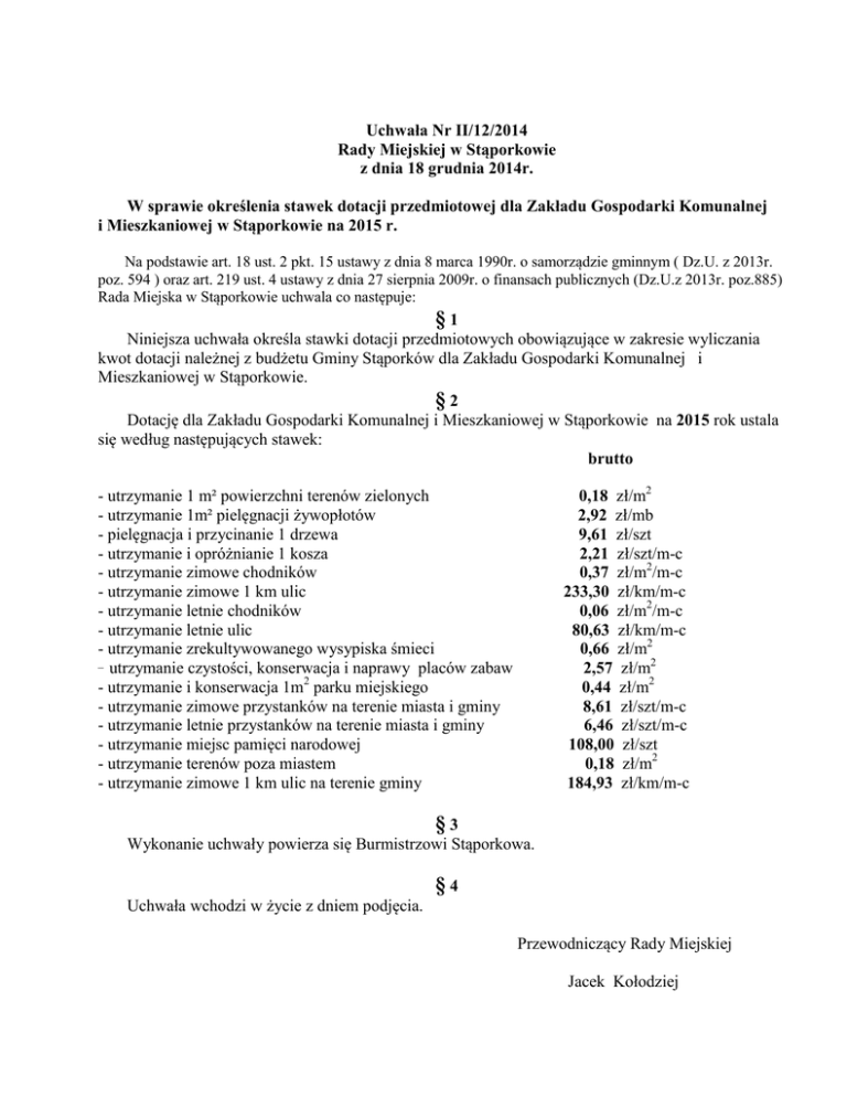 Uchwała Nr II/12/2014 Rady Miejskiej w Stąporkowie z dnia 18 grudnia 2014r. W sprawie określenia stawek dotacji przedmiotowej dla Zakładu Gospodarki Komunalnej i Mieszkaniowej w Stąporkowie na 2015 r. Na podstawie art. 18 ust. 2 pkt. 15 ustawy z dnia 8 marca 1990r. o samorządzie gminnym ( Dz.U. z 2013r. poz. 594 ) oraz art. 219 ust. 4 ustawy z dnia 27 sierpnia 2009r. o finansach publicznych (Dz.U.z 2013r. poz.885) Rada Miejska w Stąporkowie uchwala co następuje: §1 Niniejsza uchwała określa stawki dotacji przedmiotowych obowiązujące w zakresie wyliczania kwot dotacji należnej z budżetu Gminy Stąporków dla Zakładu Gospodarki Komunalnej i Mieszkaniowej w Stąporkowie. §2 Dotację dla Zakładu Gospodarki Komunalnej i Mieszkaniowej w Stąporkowie na 2015 rok ustala się według następujących stawek: brutto 0,18 zł/m2 2,92 zł/mb 9,61 zł/szt 2,21 zł/szt/m-c 0,37 zł/m2/m-c 233,30 zł/km/m-c 0,06 zł/m2/m-c 80,63 zł/km/m-c 0,66 zł/m2 2,57 zł/m2 0,44 zł/m2 8,61 zł/szt/m-c 6,46 zł/szt/m-c 108,00 zł/szt 0,18 zł/m2 184,93 zł/km/m-c - utrzymanie 1 m² powierzchni terenów zielonych - utrzymanie 1m² pielęgnacji żywopłotów - pielęgnacja i przycinanie 1 drzewa - utrzymanie i opróżnianie 1 kosza - utrzymanie zimowe chodników - utrzymanie zimowe 1 km ulic - utrzymanie letnie chodników - utrzymanie letnie ulic - utrzymanie zrekultywowanego wysypiska śmieci _ utrzymanie czystości, konserwacja i naprawy placów zabaw - utrzymanie i konserwacja 1m2 parku miejskiego - utrzymanie zimowe przystanków na terenie miasta i gminy - utrzymanie letnie przystanków na terenie miasta i gminy - utrzymanie miejsc pamięci narodowej - utrzymanie terenów poza miastem - utrzymanie zimowe 1 km ulic na terenie gminy §3 Wykonanie uchwały powierza się Burmistrzowi Stąporkowa. §4 Uchwała wchodzi w życie z dniem podjęcia. Przewodniczący Rady Miejskiej Jacek Kołodziej Uzasadnienie Zgodnie z postanowieniem art. 219 Ust. z dn. 27.08.2009r o Finansach Publicznych z budżetu Gminy mogą być udzielone dotacje przedmiotowe dla Zakładów Budżetowych, kalkulowane w/g stawek jednostkowych ustalonych przez organ stanowiący jednostki Samorządu Terytorialnego. Proponowane w projekcie uchwały stawki jednostkowe dotacji przedmiotowej zostały skalkulowane na podstawie planowanego zakresu robót, wykazu terenów i powierzchni do oczyszczania stanowiących własność gminy Stąporków, jak również kosztów robocizny i sprzętu. Poniżej przedstawiamy kalkulacje cen jednostkowych: 1. Trzykrotne koszenie, grabienie i wywóz traw oraz liści z terenów gminnych w mieście. Robocizna: 850,00 r-g x 19,50 zł/godz. = 16 575,00 zł Praca sprzętu: Ciągnik „Zetor” 23 mtg/m-c x 70,00 zł/mtg = 1 610,00 zł - VW LT-45 80,00 godz. x 30,00 zł/godz. = 2 400,00 zł Jednokrotne koszenie: 20 585,00 zł : 119 405 m² = 0,17 zł/m² + 8% VAT – 0,01 zł = 0,18 zł/m2 RAZEM trzykrotne koszenie: 20 585,00 zł x 2 razy = 41 170,00 zł 2. Pielęgnacja żywopłotu. Robocizna 60,5 r-g x 19,50 zł/godz. = 1 179,75 zł Praca sprzętu: - VW LT-45 16,00 godz. x 30,00 zł/godz. = 480,00 zł RAZEM: 1 659,75 zł : 614,5 mb = 2,70 zł/mb + 8%VAT – 0,22 zł = 2,92 zł/mb 3. Przycinanie drzew i usuwanie gałęzi i powalonych drzew. Robocizna 60 r-g x 19,50 zł/godz. = 1 170,00 zł Praca sprzętu: - VW LT-45 50,00 godz. x 30,00 zł/godz. = 1 500,00 zł RAZEM: 2 670 zł : 300 szt = 8,90 zł/szt + 8% VAT – 0,71 zł = 9,61 zł/szt 4. Zbieranie śmieci, opróżnianie koszy ulicznych na terenie miasta i utylizacja odpadów. Robocizna 18 r-g/m-c x 19,50 zł/godz. x 12 m-cy = 4 212,00 zł Praca sprzętu: -VW LT-45 5 godz./m-c x 30,00 zł/godz. x 12 m-cy = 1 800,00 zł 48 km/m-c x 5,00 zł/km x 12 m-cy = 2 880,00 zł Odbiór nieczystości stałych: - 12,0 m3/m-c x 48,00 zł x 12 m-cy = 6 912,00zł RAZEM: 15 804 zł :107 szt. : 6 : 12 m-cy = 2,05 zł/m-c + 8%VAT – 0,16 zł = 2,21 zł/szt./m-c 5. Utrzymanie zimowe nawierzchni chodników na terenie miasta - 30 500,00 m2. Robocizna 400 r-g/m-c x 19,50 zł/godz. x 3,5 m-ca = 27 300,00 zł Praca sprzętu: - Ciągnik Zetor – odśnieżanie: 30 mtg/m-c x 75,00 zł x 3,5 m-ca = 7 875,00 zł - Dowóz piasku z solą do skrzyń: 350,00 zł/m-c x 3,5 m-ca = 1 225,00 zł RAZEM: 36 400,00 zł :30 500,00 m2 : 3,5 m-ca = 0,34 zł/m2/m-c+ 8%VAT–0,03 zł = 0,37 zł/m2/m-c 6. Utrzymanie zimowe 1 km ulic na terenie miasta – 16,04 km. Praca sprzętu: - odśnieżanie koparko – ładowarką JCB: 8,5 mtg/m-c x 80,0 zł/mtg x 3,5 m-ca = 2 380,00 zł - piaskowanie pługo-piaskarką MAN: 5 piaskarek/m-c x 350,0 zł x 3,5 m-ca = 6 125,00 zł - odśnieżanie ciągnikiem Zetor: 9 mtg/m-c x 75,00 zł/mtg x 3,5 m-ca = 2 362,50 zł - piaskowanie ciągnikiem Pronar: 1,5 piaskarki/m-c x 240,00 zł x 3,5 m-ca = 1 260,00 zł RAZEM: 12 127,50 zł :16,04 km :3,5 m-ca = 216,02 zł/m-c + 8%VAT–17,28 zł = 233,30 zł/km/m-c 7. Utrzymanie letnie nawierzchni chodników na terenie miasta – 30 500,00 m2 Robocizna 52,00 r-g/m-c x 19,50 zł/godz. x 8,5 m-ca = 8,619 zł Praca sprzętu. - VW LT – 45 20,00 godz./m-c x 30,00 zł/godz. x 8,5 m-ca = 5 100,00 zł 71,00 km/m-c x 5,00 zł x 8,5 m-ca = 3 017,50 zł RAZEM: 16 736,50 zł :30 500,00 m2:8,5 m-ca = 0,06 zł/m2/m-c + 8%VAT– 0,00 zł = 0,06 zł/m2/m-c 8. Utrzymanie letnie nawierzchni ulic na terenie miasta – 16,04 km. Robocizna 15 r-g/m-c x 19,50 zł/godz. x 8,5 m-ca = 2 486,25 zł Praca sprzętu. - zamiatanie ciągnikiem Pronar: 7,0 godz./m-c x 80,00zł/godz. x 8,5 m-ca = 4 760,00 zł - VW LT – 45 7,5 godz./m-c x 30,0 zł/godz x 8,5 m-ca = 1 912,50 zł 24,0 km/m-c x 5,00 zł/km x 8,5 m-ca = 1 020,00 zł RAZEM: 10 178,75 zł:16,04 km:8,5 m-ca = 74,66 zł/km/m-c+ 8% VAT–5,97 zł = 80,63 zł/km/m-c 9. Utrzymanie zrekultywowanego wysypiska śmieci – 18 042 m2 Robocizna – jednokrotne koszenie trawy i drobne naprawy. 110 r/g x 19,50 zł = 2 145,00 zł Wykonanie monitoringu (badań) - 6 424,50 zł Praca sprzętu. - VW LT – 45 8,0 godz. x 3