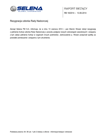 RB 18/2014 – 13.06.2014 Rezygnacja członka Rady Nadzorczej Zarząd Selena FM S.A. informuje, że w dniu 13 czerwca 2014 r. pan Marcin Wower złożył rezygnację z pełnienia funkcji członka Rady Nadzorczej z powodu podjęcia nowych zobowiązań zawodowych i związany z tym zakaz pełnienia funkcji w organach innych podmiotów. Jednocześnie p. Wower przeprosił spółkę za powstałe zamieszanie i związane z tym utrudnienia. Podstawa prawna: Art. 56 ust. 1 pkt 2 Ustawy o ofercie - informacje bieżące i okresowe