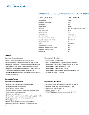 Mercedes CLS 250 CDI BlueEFFICIENCY 204KM Standa Cena (brutto): 287 500 zł Typ nadwozia coupe Pojemność silnika (ccm) 2143 Moc silnika 204 Rodzaj paliwa diesel Typ silnika 250 CDI BlueEFFICIENCY 204KM Masa własna (kg.) 1785 Ładowność (kg.) 485 Klasa/segment luksusowe Typ skrzyni biegów automatyczna Prędkość maksymalna (km/h) 242 Częstotliwość przeglądu (km.) Brak danych Przyspieszenie (s.) 7 Opony 245/45 R17 Zużycie paliwa (l/100km.) 5.1 Pojemność zbiornika paliwa (litry) 59 Pojemność bagażnika (litry) 520 Liczba drzwi 4 Komfort Wyposażenie standardowe Wyposażenie dodatkowe ✓ Isofix - mocowanie fotelika dziecięcego z tyłu ✕ Dywaniki welurowe 508 PLN ✓ Kierunkowskazy z komf. przełącznikiem impulsowym ✕ EASY-PACK pojemnik w bagażniku pojazdu 932 PLN ✓ Komputer pokładowy z wyświetlaczem wielofunkcyjnym ✕ Komfortowa klimatyzacja THERMOTRONIC 4178 PLN ✓ Ogrzewanie szyby tylnej z przełącznikiem czasowym ✕ Podgrzewane fotele przednie 2117 PLN ✓ Regulacja kolumny kierownicy w dwóch płaszczyznach ✕ Podgrzewane fotele tylne 2117 PLN ✓ Tempomat z systemem ograniczania prędkości ✕ Podgrzewane i wentylowane przednie fotele 6097 PLN ✓ Wycieraczki SPEEDTRONIC przedniej szyby sterowane automatycznie z ✕ Schowek na okulary 141 PLN czujnikiem deszczu Bezpieczeństwo Wyposażenie standardowe Wyposażenie dodatkowe ✓ ABS - System zapobiegający blokowaniu kół ✕ ILS - Inteligentne reflektory bi-ksenonowe 8412 PLN ✓ Adaptacyjne światła hamowania ✕ Kontrola ciśnienia w oponach (RDK) 1722 PLN ✓ ASR - system kontroli trakcji ✕ Opony typu run-flat 1694 PLN ✓ Attention Assist - asystent wspomagania koncentracji ✕ Osłona silnika 734 PLN ✓ Awaryjne otwieranie przy kolizji ✕ PARKTRONIC z asystentem parkowania 4121 PLN ✓ Blokada drzwi tylnych\n ✓ Elektroniczny system kontroli stabilności toru jazdy - ESP\n ✓ Kurtyny powietrzne dla kierowcy i pasażera\n ✓ Montaż gaśnicy\n ✓ Napinacze pasów bezpieczeństwa z przodu\n ✓ Poduszka powietrzna chroniąca kolana pasażera\n ✓ 1 Poduszka powietrzna dla kierowcy i pasażera\n 2 ✓ PRE-SAFE\n ✓ Sygnalizacja niezapiętych pasów bezpieczeństwa dla wszystkich miejsc\n ✓ System wspomagający gwałtowne hamowanie (BAS)\n ✓ Trójkąt ostrzegawczy\n ✓ Wskaźnik zapięcia pasów na tylnych fotelach\n ✓ Wzmocnienia boczne\n ✓ Zabezpieczenie wnętrza pojazdu\n Dodatki Wyposażenie standardowe Wyposażenie dodatkowe ✓ 3-pkt. pasy bezpieczeństwa (x4) ✕ AIRMATIC 9597 PLN ✓ 43,2 cm (17") Alufelgi 10-szpr. ✕ Aktywne wielokonturowe fotele przednie 7226 PLN ✓ 7-biegowa automatyczna skrzynia biegów ✕ Asystent ograniczeń prędkości 1665 PLN ✓ ADAPTIVE BRAKE z funkcją HOLD ✕ Audio 50 APS 7113 PLN ✓ Aktywne zagłówki NECK-PRO z przodu ✕ Audio 50 APS ze zmieniarką DVD i Linguatronic 9371 PLN ✓ Alarm antywłamaniowy (EDW) ✕ COMAND APS 14791 PLN ✓ Analogowy zegar umieszczony w tablicy rozdzielczej ✕ COMAND APS ze zmieniarką DVD 16485 PLN ✓ Apteczka ✕ Dach szklany sterowany elektrycznie 6549 PLN ✓ ASSYST PLUS – system aktywnego serwisowania ✕ EASY-PACK - elektrycznie sterowana tylna klapa 2456 PLN ✓ Atrapa chłodnicy z dwoma lamelami ✕ Elektrycznie sterowana roleta tylnej szyby 2174 PLN ✓ Automat. oświetlenie wnętrza po odryglowaniu zamka ✕ INCar Hotspot 4121 PLN ✓ Blokada szyb jednym przyciskiem ✕ Kamera cofania 2258 PLN ✓ Ciśnieniowe spryskiwacze reflektorów ✕ KEYLESS-GO 5024 PLN ✓ Czujnik kolizji ✕ Kierownica w drewnie i skórze 3331 PLN ✓ Dźwignia zmiany biegów w skórze ✕ Komfortowe zamykanie klapy bagażnika 2964 PLN ✓ Filtr cząstek stałych ✕ Listwy progowe z podświetlanym logo Mercedes-Benz 3218 ✓ Fotel kierowcy regulowany elektrycznie z pamięcią ✕ Mocowanie podstawowe do bagażników dachowych 903 PLN PLN ustawienia ✓ Funkcja ECO start/stop ✕ Moduł telefoniczny Bluetooth 1976 PLN ✓ Gniazdo 12V w schowku tablicy rozdzielczej z tyłu pojazdu ✕ Nightview Assist Plus - system jazdy nocnej 7057 PLN oraz w bagażniku ✓ Immobilizer z centralnym zamkiem sterowany pilotem ✕ Obręcze kół AMG ze stopów metali lekkich, 48,3 cm (19") 14396 PLN ✓ Interfejs Bluetooth z funkcją wolnych rąk ✕ Obręcze kół z metali lekkich, 45,7 cm (18") 6210 PLN ✓ Kieszenie podróżne w oparciach kierowcy i pasaż. ✕ Obręcze kół z metali lekkich. 48,3 cm (19") 11009 PLN ✓ Klamka wewn. chromowana i podświetlana ✕ Ogrzewanie postojowe 7734 PLN ✓ klimatyzacja THERMATIC ✕ Opony zimowe ( zamiast letnich) 1101 PLN ✓ Kluczyk z elementami chromowanymi ✕ Oświetlenie AMBIENTE 1609 PLN ✓ Kolorowy wyświetlacz w technologii TFT ✕ Podgrzewane dysze spryskiwaczy szyby przedniej 960 PLN ✓ Koło dojazdowe (minispare) ✕ Pojemnik na napoje z przodu oraz pojemnik na butelki z ✓ Listwy progowe ze stali szlachetnej, napis MB ✕ Przygotowanie do montażu telefonu komórkowego 2202 PLN ✓ Lusterka zewnętrzne ze zintegrowanym oświetleniem ✕ Radio Audio 20 ze zmieniarką 1694 PLN przodu i z tyłu pojazdu 367 PLN bocznym ✓ Napinacze pasów bezpieczeństwa z tyłu ✕ Światła do jazdy dziennej LED 1665 PLN ✓ 3 Obrotomierz ✕ 4 System dźwiękowy Harman/Kardon Logic7 4742 PLN 5 ✓ Optyczny sygnał o zamknięciu ✕ System rozpoznawania fotelika dziecięcego (AKSE) 282 PLN ✓ Oświetlenie dolnej przestrzeni wnętrza ✕ Wielofunkcyjne podgrzewane koło kierownicy 1468 PLN ✓ Oświetlenie wnętrza ze światłem do czytania ✕ Wielokonturowe fotele przednie 2936 PLN ✓ Osłony przeciwsłoneczne z lusterkami ✕ Wykończenie wnętrza - lakier fortepianowy 1411 PLN ✓ Poduszka powietrzna chroniąca kolana kierowcy ✕ Zbiornik paliwa o pojemności 80l 565 PLN ✓ Podwójne ramie wycieraczki przedniej szyby - typ Aero ✕ Zdalne otwieranie drzwi garażowych 1270 PLN ✓ Podłokiet. tylny ze schowkiem i miejscem na kubek ✕ Złącze multimedialne 1242 PLN ✓ Podłokietnik na tyln