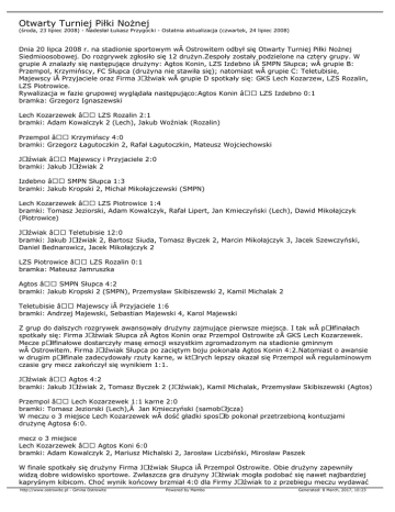 Otwarty Turniej Piłki Nożnej (środa, 23 lipiec 2008) - Nadesłał Łukasz Przygocki - Ostatnia aktualizacja (czwartek, 24 lipiec 2008) Dnia 20 lipca 2008 r. na stadionie sportowym w Ostrowitem odbył się Otwarty Turniej Piłki Nożnej Siedmioosobowej. Do rozgrywek zgłosiło się 12 drużyn.Zespoły zostały podzielone na cztery grupy. W grupie A znalazły się następujące drużyny: Agtos Konin, LZS Izdebno i SMPN Słupca; w grupie B: Przempol, Krzymińscy, FC Słupca (drużyna nie stawiła się); natomiast w grupie C: Teletubisie, Majewscy i Przyjaciele oraz Firma JÃłźwiak w grupie D spotkały się: GKS Lech Kozarzew, LZS Rozalin, LZS Piotrowice. Rywalizacja w fazie grupowej wyglądała następująco:Agtos Konin – LZS Izdebno 0:1 bramka: Grzegorz Ignaszewski Lech Kozarzewek – LZS Rozalin 2:1 bramki: Adam Kowalczyk 2 (Lech), Jakub Woźniak (Rozalin) Przempol – Krzymińscy 4:0 bramki: Grzegorz Łagutoczkin 2, Rafał Łagutoczkin, Mateusz Wojciechowski JÃłźwiak – Majewscy i Przyjaciele 2:0 bramki: Jakub JÃłźwiak 2 Izdebno – SMPN Słupca 1:3 bramki: Jakub Kropski 2, Michał Mikołajczewski (SMPN) Lech Kozarzewek – LZS Piotrowice 1:4 bramki: Tomasz Jeziorski, Adam Kowalczyk, Rafał Lipert, Jan Kmieczyński (Lech), Dawid Mikołajczyk (Piotrowice) JÃłźwiak – Teletubisie 12:0 bramki: Jakub JÃłźwiak 2, Bartosz Siuda, Tomasz Byczek 2, Marcin Mikołajczyk 3, Jacek Szewczyński, Daniel Bednarowicz, Jacek Mikołajczyk 2 LZS Piotrowice – LZS Rozalin 0:1 bramka: Mateusz Jamruszka Agtos – SMPN Słupca 4:2 bramki: Jakub Kropski 2 (SMPN), Przemysław Skibiszewski 2, Kamil Michalak 2 Teletubisie – Majewscy i Przyjaciele 1:6 bramki: Andrzej Majewski, Sebastian Majewski 4, Karol Majewski Z grup do dalszych rozgrywek awansowały drużyny zajmujące pierwsze miejsca. I tak w pÃłłfinałach spotkały się: Firma JÃłźwiak Słupca z Agtos Konin oraz Przempol Ostrowite z GKS Lech Kozarzewek. Mecze pÃłłfinałowe dostarczyły masę emocji wszystkim zgromadzonym na stadionie gminnym w Ostrowitem. Firma JÃłźwiak Słupca po zaciętym boju pokonała Agtos Konin 4:2.Natomiast o awansie w drugim pÃłłfinale zadecydowały rzuty karne, w ktÃłrych lepszy okazał się Przempol w regulaminowym czasie gry mecz zakończył się wynikiem 1:1. JÃłźwiak – Agtos 4:2 bramki: Jakub JÃłźwiak 2, Tomasz Byczek 2 (JÃłźwiak), Kamil Michalak, Przemysław Skibiszewski (Agtos) Przempol – Lech Kozarzewek 1:1 karne 2:0 bramki: Tomasz Jeziorski (Lech), Jan Kmieczyński (samobÃłjcza) W meczu o 3 miejsce Lech Kozarzewek w dość gładki sposÃłb pokonał przetrzebioną kontuzjami drużynę Agtosa 6:0. mecz o 3 miejsce Lech Kozarzewek – Agtos Koni 6:0 bramki: Adam Kowalczyk 2, Mariusz Michalski 2, Jarosław Liczbiński, Mirosław Paszek W finale spotkały się drużyny Firma JÃłźwiak Słupca i Przempol Ostrowite. Obie drużyny zapewniły widzą dobre widowisko sportowe. Zwłaszcza gra drużyny JÃłźwiak mogła podobać się nawet najbardziej kapryśnym kibicom. Choć wynik końcowy brzmiał 4:0 dla Firmy JÃłźwiak to z przebiegu meczu wydawać http://www.ostrowite.pl - Gmina Ostrowite Powered by Mambo Generated: 8 March, 2017, 10:23 mogłoby się, że Przempol zasłużył na uzyskanie choćby honorowego trafienia. Finał JÃłźwiak – Przempol 4:0 Jakub JÃłźwiak 2, Bartosz Siuda, Tomasz ByczekOstateczna kolejność:1 miejsce: Firma JÃłźwiak Słupca2 miejsce: Przempol Ostrowite3 miejsce: GKS Lech Kozarzewek4 miejsce: Agtos Konin Nagrody: KrÃłl strzelcÃłw: Jakub JÃłźwiak (Firma JÃłźwiak) Najlepszy perspektywiczny zawodnik: Rafał Łagutoczkin (Przempol Ostrowite) Najlepszy zawodnik: Mateusz Nowakowski (Majewscy i przyjaciele) Najlepszy zagraniczny zawodnik: Daniel Kaczmarek (Przempol Ostrowite) - Francja Najstarszy zawodnik turnieju: Jan Kmieczyński (GKS Lech Kozarzewek) Organizatorzy składają podziękowania: Firmie „WaLLak― z Ostrowitego, Firmie „Przempol― z Ostrowitego, Firmie „Kamena― z Polanowa, Państwu K.J. Sikorskim, Państwu D.S. Wojciechowskim, Panu Tomaszowi Pradelskiemu, Panu Piotrowi Wiatrowskiemu, KGW Ostrowite, MOSiR Słupca, Szkole Podstawowej im. Ludwiki Jakubowicz w Ostrowitem, Gimnazjum im. Polskich OlimpijczykÃłw w Ostrowitem, Panu Jerzemu Siepielskiemu, Panu Krzysztofowi Bartosikowi, Panu Ryszardowi Przygockiemu, Panu Włodzimierzowi Dunajowi, Panu Przemysławowi Skibiszewskiemu.  http://www.ostrowite.pl - Gmina Ostrowite Powered by Mambo Generated: 8 March, 2017, 10:23