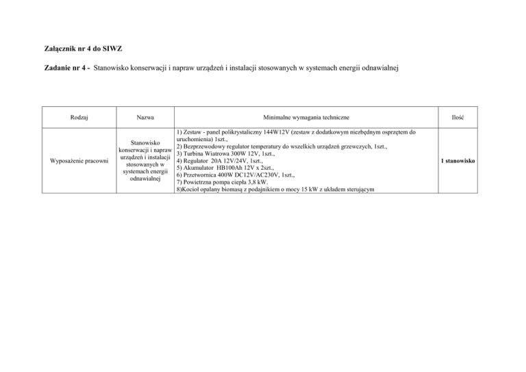 Załącznik nr 4 do SIWZ Zadanie nr 4 - Stanowisko konserwacji i napraw urządzeń i instalacji stosowanych w systemach energii odnawialnej Rodzaj Wyposażenie pracowni Nazwa Minimalne wymagania techniczne 1) Zestaw - panel polikrystaliczny 144W12V (zestaw z dodatkowym niezbędnym osprzętem do uruchomienia) 1szt., Stanowisko 2) Bezprzewodowy regulator temperatury do wszelkich urządzeń grzewczych, 1szt., konserwacji i napraw 3) Turbina Wiatrowa 300W 12V, 1szt., urządzeń i instalacji 4) Regulator 20A 12V/24V, 1szt., stosowanych w 5) Akumulator HB100Ah 12V x 2szt., systemach energii 6) Przetwornica 400W DC12V/AC230V, 1szt., odnawialnej 7) Powietrzna pompa ciepła 3,8 kW. 8)Kocioł opalany biomasą z podajnikiem o mocy 15 kW z układem sterującym Ilość 1 stanowisko FORMULARZ RZECZOWO – CENOWY Dostawa wyposażenia pracowni Technika urządzeń i systemów energii odnawialnej dla Centrum Kształcenia Zawodowego w Puławach lp. nazwa przedmiotu 2 4 5 6 7 8 producent i model Cena jm ilość jednostkowa brutto Wartość brutto (ilość x cena jedn. brutto) Zestaw - panel polikrystaliczny 144W12V (zestaw z dodatkowym niezbędnym osprzętem do uruchomienia) Bezprzewodowy regulator temperatury do wszelkich urządzeń grzewczych 1 3 opis przedmiotu Stanowisko konserwacji i napraw urządzeń i instalacji stosowanych w systemach energii odnawialnej Turbina Wiatrowa 300W 12V, St. 1 Regulator 20A 12V/24V, Akumulator HB100Ah 12V x 2szt., Przetwornica 400W DC12V/AC230V Powietrzna pompa ciepła 3,8 kW. Kocioł opalany biomasą z podajnikiem o mocy 15 kW z układem sterującym Razem wartość brutto poz. 1-8 Razem wartość brutto słownie złotych: ……………………………………………………………….. Miejscowość, data ………………………………………………………….. Podpis Wykonawcy