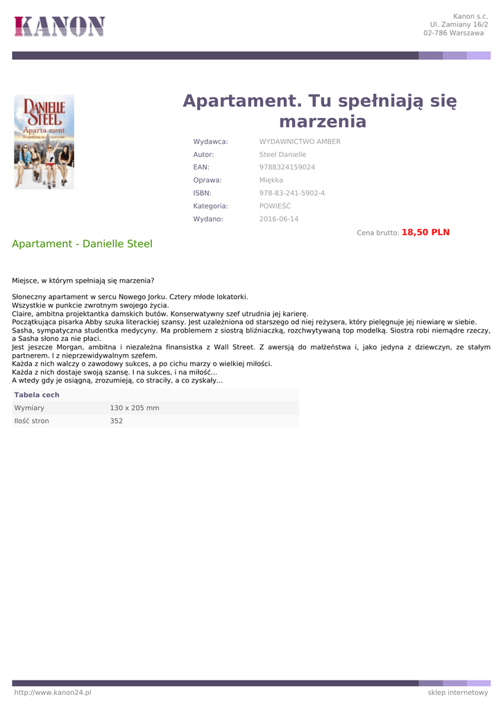 Kanon s.c. Ul. Zamiany 16/2 02-786 Warszawa Apartament. Tu spełniają się marzenia Wydawca: WYDAWNICTWO AMBER Autor: Steel Danielle EAN: 9788324159024 Oprawa: Miękka ISBN: 978-83-241-5902-4 Kategoria: POWIEŚĆ Wydano: 2016-06-14 Cena brutto: 18,50 PLN Apartament - Danielle Steel Miejsce, w którym spełniają się marzenia? Słoneczny apartament w sercu Nowego Jorku. Cztery młode lokatorki. Wszystkie w punkcie zwrotnym swojego życia. Claire, ambitna projektantka damskich butów. Konserwatywny szef utrudnia jej karierę. Początkująca pisarka Abby szuka literackiej szansy. Jest uzależniona od starszego od niej reżysera, który pielęgnuje jej niewiarę w siebie. Sasha, sympatyczna studentka medycyny. Ma problemem z siostrą bliźniaczką, rozchwytywaną top modelką. Siostra robi niemądre rzeczy, a Sasha słono za nie płaci. Jest jeszcze Morgan, ambitna i niezależna finansistka z Wall Street. Z awersją do małżeństwa i, jako jedyna z dziewczyn, ze stałym partnerem. I z nieprzewidywalnym szefem. Każda z nich walczy o zawodowy sukces, a po cichu marzy o wielkiej miłości. Każda z nich dostaje swoją szansę. I na sukces, i na miłość... A wtedy gdy je osiągną, zrozumieją, co straciły, a co zyskały... Tabela cech Wymiary 130 x 205 mm Ilość stron 352 http://www.kanon24.pl sklep internetowy