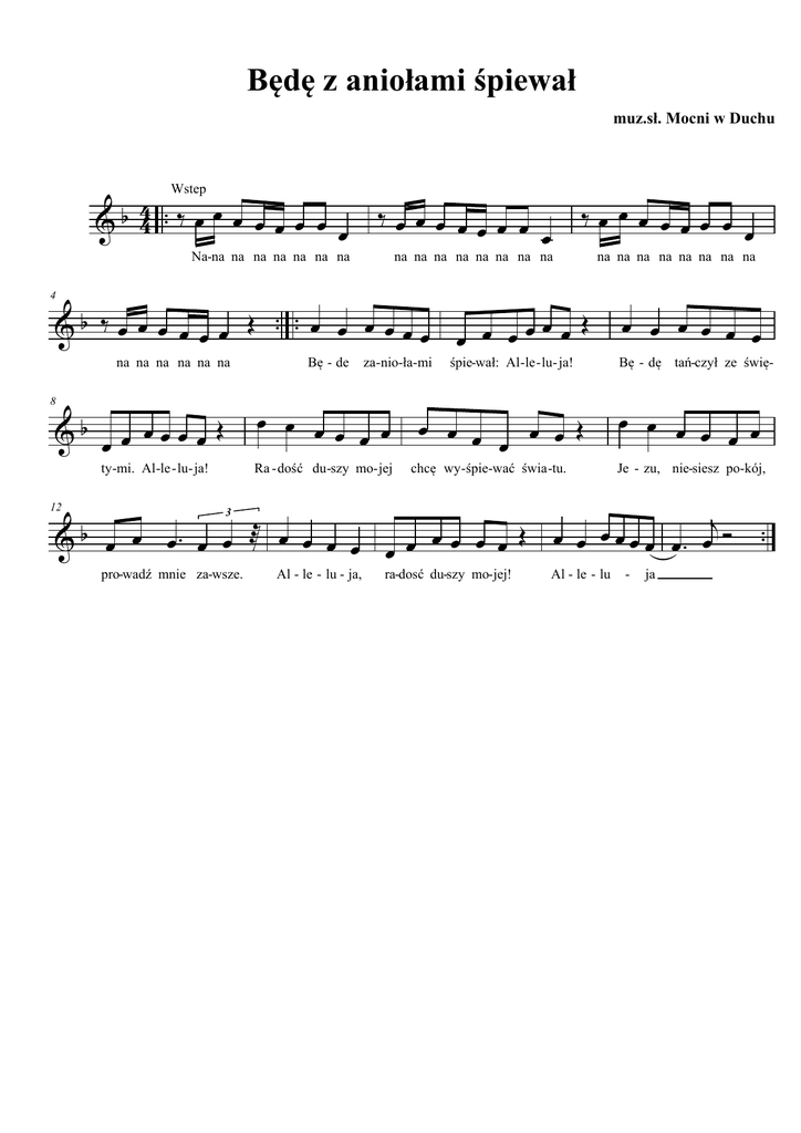 Będę z aniołami śpiewał muz.sł. Mocni w Duchu 4 & b 4 .. ‰ œ œ œ œ œ œ œ œ Wstep Na-na na na na na na na ‰œœœ œ œ œ œ œ na na na na na na na na ‰œœœ œœœ œ œ na na na na na na na na & b ‰ œ œ œ œ œ œ Œ .. .. œ œ œ œ œ œ œ œ œ œ œ œ Œ 4 na na na na na na Bę - de za-nio-ła-mi œ œ œ œ œ œ 8 &b œ œ œœœ œ Œ ty-mi. Al-le - lu- ja! Ra - dość du-szy mo- jej śpie-wał: Al -le - lu- ja! œ œ œ Œ œ œ œ chcę wy- śpie-wać świa -tu. œ œ œ œ œ œ Bę - dę tań-czył ze świę- œ œ œ œ œ œ Je - zu, nie-siesz po-kój, jÓ b ® œ Œ œ œ œ œ œ . & œ œ œ œ œ œ œ œ œ œ œ œ œ œ œ œ. œ 12 3 pro-wadź mnie za-wsze. Al - le - lu - ja, ra-dosć du-szy mo- jej! Al - le - lu - ja ..