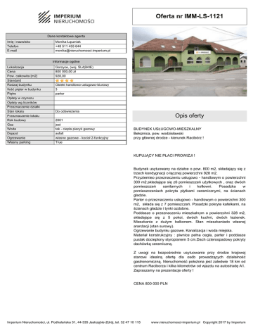Oferta nr IMM-LS-1121 Dane kontaktowe agenta Imię i nazwisko Telefon E-mail Monika Łączniak +48 511 455 644 [email protected] Informacje ogólne Lokalizacja Cena Pow. całkowita [m2] Standard Rodzaj budynku Ilość pięter w budynku Piętro Opłaty w czynszu Opłaty wg liczników Przeznaczenie działki Stan lokalu Przeznaczenie lokalu Rok budowy Gaz Woda Dojazd Ogrzewanie Własny parking Gorzyce, (woj. ŚLĄSKIE) 800 000,00 zł 928,00 Obiekt handlowo-usługowo-biurowy 3 parter Do odświeżenia 2001 jest tak - ciepła piecyk gazowy asfalt własne gazowe - kocioł 2-funkcyjny True Opis oferty BUDYNEK USŁUGOWO-MIESZKALNY Bełsznica, pow. wodzisławski przy głównej drodze - kierunek Racibórz ! KUPUJĄCY NIE PŁACI PROWIZJI ! Budynek usytuowany na działce o pow. 800 m2, składający się z trzech kondygnacji o łącznej powierzchni 928 m2. Przyziemieo przeznaczeniu usługowo - handlowym o powierzchni 300 m2,składające się z6 pomieszczeń użytkowych , oraz dwóch pomieszczeń sanitarnych i kotłowni. Posadzka w pomieszczeniach pokryta płytkami ceramicznymi, na ścianach gładzie. Parter o przeznaczeniu usługowo - handlowym o powierzchni 300 m2, składa się z 7 pomieszczeń. Posadzki pokryte kafelkami, na ścianach gładzie i tynki ozdobne. Poddasze o przeznaczeniu mieszkalnym o powierzchni 328 m2, składające się z 5 pokoi, dwóch kuchni, dwóch łazienek. Mieszkanie z dużym balkonem. Stan mieszkaniado własnej aranżacji (stan surowy). Ogrzewanie budynku gazowe. Kanalizacja i woda miejska. Materiał konstrukcyjny : piwnice pełna cegła, parter i poddasze pustak docieplony styropianem 5 cm.Dach czterospadowy pokryty dachówką ceramiczną. Z uwagi na bezpośrednie usytuowanie przy drodze krajowej stanowi idealną ofertę dla osób prowadzących działalność gastronomiczną. Nieruchomość położona jest zaledwie 18 km od centrum Raciborza i kilka kilometrów od wjazdu na autostradę A1. Zapraszamy na prezentacje oferty ! CENA 800 000 PLN Imperium Nieruchomości, ul. Podhalańska 31, 44-335 Jastrzębie-Zdrój, tel. 32 47 10 115 www.nieruchomosci-imperium.pl Copyright 2017 by Imperium