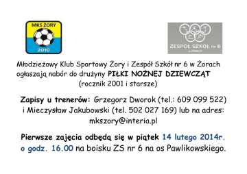 Młodzieżowy Klub Sportowy Żory i Zespół Szkół nr 6 w Żorach ogłaszają nabór do drużyny PIŁKI NOŻNEJ DZIEWCZĄT (rocznik 2001 i starsze) Zapisy u trenerów: Grzegorz Dworok (tel.: 609 099 522) i Mieczysław Jakubowski (tel. 502 027 169) lub na adres: [email protected] Pierwsze zajęcia odbędą się w piątek 14 lutego 2014r. o godz. 16.00 na boisku ZS nr 6 na os Pawlikowskiego.