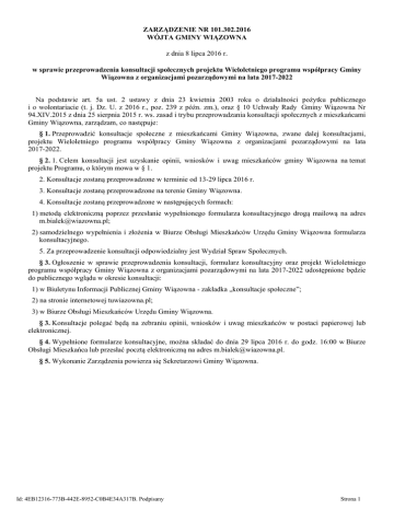 ZARZĄDZENIE NR 101.302.2016 WÓJTA GMINY WIĄZOWNA z dnia 8 lipca 2016 r. w sprawie przeprowadzenia konsultacji społecznych projektu Wieloletniego programu współpracy Gminy Wiązowna z organizacjami pozarządowymi na lata 2017-2022 Na podstawie art. 5a ust. 2 ustawy z dnia 23 kwietnia 2003 roku o działalności pożytku publicznego i o wolontariacie (t. j. Dz. U. z 2016 r., poz. 239 z późn. zm.), oraz § 10 Uchwały Rady Gminy Wiązowna Nr 94.XIV.2015 z dnia 25 sierpnia 2015 r. ws. zasad i trybu przeprowadzania konsultacji społecznych z mieszkańcami Gminy Wiązowna, zarządzam, co następuje: § 1. Przeprowadzić konsultacje społeczne z mieszkańcami Gminy Wiązowna, zwane dalej konsultacjami, projektu Wieloletniego programu współpracy Gminy Wiązowna z organizacjami pozarządowymi na lata 2017-2022. § 2. 1. Celem konsultacji jest uzyskanie opinii, wniosków i uwag mieszkańców gminy Wiązowna na temat projektu Programu, o którym mowa w § 1. 2. Konsultacje zostaną przeprowadzone w terminie od 13-29 lipca 2016 r. 3. Konsultacje zostaną przeprowadzone na terenie Gminy Wiązowna. 4. Konsultacje zostaną przeprowadzone w następujących formach: 1) metodą elektroniczną poprzez przesłanie wypełnionego formularza konsultacyjnego drogą mailową na adres [email protected]; 2) samodzielnego wypełnienia i złożenia w Biurze Obsługi Mieszkańców Urzędu Gminy Wiązowna formularza konsultacyjnego. 5. Za przeprowadzenie konsultacji odpowiedzialny jest Wydział Spraw Społecznych. § 3. Ogłoszenie w sprawie przeprowadzenia konsultacji, formularz konsultacyjny oraz projekt Wieloletniego programu współpracy Gminy Wiązowna z organizacjami pozarządowymi na lata 2017-2022 udostępnione będzie do publicznego wglądu w okresie konsultacji: 1) w Biuletynu Informacji Publicznej Gminy Wiązowna - zakładka „konsultacje społeczne”; 2) na stronie internetowej tuwiazowna.pl; 3) w Biurze Obsługi Mieszkańców Urzędu Gminy Wiązowna. § 3. Konsultacje polegać będą na zebraniu opinii, wniosków i uwag mieszkańców w postaci papierowej lub elektronicznej. § 4. Wypełnione formularze konsultacyjne, można składać do dnia 29 lipca 2016 r. do godz. 16:00 w Biurze Obsługi Mieszkańca lub przesłać pocztą elektroniczną na adres [email protected]. § 5. Wykonanie Zarządzenia powierza się Sekretarzowi Gminy Wiązowna. Id: 4EB12316-773B-442E-8952-C0B4E34A317B. Podpisany Strona 1 § 6. Zarządzenie wchodzi w życie z dniem podjęcia. Wójt Gminy Wiązowna Janusz Budny Id: 4EB12316-773B-442E-8952-C0B4E34A317B. Podpisany Strona 2