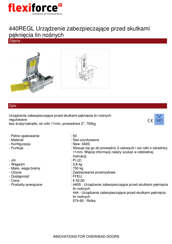 440REGL Urządzenie zabezpieczające przed skutkami pęknięcia lin nośnych Zdjęcia : Opis : Urządzenie zabezpieczające przed skutkami pęknięcia lin nośnych regulowane bez śruby/nakrętki, oś rolki 11mm, prowadnice 2", 750kg - Pełne opakowanie - Materiał - Konfiguracja - Funkcja - Jm - Waga/jm - Maks. waga bramy - Użycie - Dostępność - Cena - Produkty powiązane : 50 : Stal ocynkowana : New: 440S : Stosuje się go do prowadnic 2-calowych i osi rolki o ośrednicy 11mm. Więcej informacji należy szukać w oddzielnej instrukcji. : Pr.(2) : 3,8 kg : 750 kg : Zastosowania przemysłowe : FFEU : € 52,00 : 440S - Urządzenie zabezpieczające przed skutkami pęknięcia lin nośnych 444 - Urządzenie zabezpieczające przed skutkami pęknięcia lin nośnych 574-60 - Rolka INNOVATIONS FOR OVERHEAD DOORS