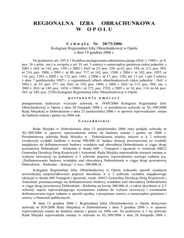 REGIONALNA IZBA W OBRACHUNKOWA OPOLU U c h w a ł a Nr 20/73/2006 Kolegium Regionalnej Izby Obrachunkowej w Opolu z dnia 19 grudnia 2006 r. Na podstawie art. 105 § 1 Kodeksu postępowania administracyjnego (DzU z 1980 r. nr 9, poz. 26 z późn. zm.) w związku z art. 91 ust. 5 ustawy o samorządzie gminnym (tekst jednolity z 2001 r. DzU nr 142, poz. 1591; z 2002 r. DzU nr 23, poz. 220, nr 62, poz. 558, nr 113, poz. 984, nr 214, poz. 1806; z 2003 r. nr 80, poz. 717, nr 162, poz. 1568; z 2004 r. nr 102, poz. 1055, nr 116, poz. 1203; z 2005 r. nr 172, poz. 1441; z 2006 r. nr 17, poz. 128), art. 11 ust. 1 pkt 2 ustawy z dnia 7 października 1992 r. o regionalnych izbach obrachunkowych (tekst jednolity - DzU z 2001 r. nr 55, poz. 577, zm. DzU nr 154, poz. 1800; z 2002 r. DzU nr 113, poz. 984; zm. z 2003 r. DzU nr 149, poz. 1454; z 2004 r. nr 273, poz. 2703; z 2005 r. nr 14, poz. 114, nr 64, poz. 565, nr 249, poz. 2104) Kolegium Regionalnej Izby Obrachunkowej w Opolu postanawia umorzyć postępowanie nadzorcze wszczęte uchwałą nr 19/68/2006 Kolegium Regionalnej Izby Obrachunkowej w Opolu z dnia 28 listopada 2006 r. w przedmiocie uchwały nr XL/309/2006 Rady Miejskiej w Dobrodzieniu z dnia 23 października 2006 r. w sprawie wprowadzenia zmian do budżetu miasta i gminy na 2006 rok. Uzasadnienie Rada Miejska w Dobrodzieniu dnia 23 października 2006 roku podjęła uchwałę nr XL/309/2006 w sprawie wprowadzenia zmian do budżetu miasta i gminy na 2006 r. Przedmiotową uchwałą Rada Miejska w Dobrodzieniu między innymi w § 2 uchwały zwiększyła wydatki budżetu o kwotę 300.000 zł. będące dotacją przeznaczoną na wydatki majątkowe na dofinansowanie budowy wiaduktu nad obwodnicą Dobrodzienia w ciągu drogi powiatowej Dobrodzień - Klekotna w dziale 600 – Transport i łączność w rozdziale 60012 Generalna Dyrekcja Dróg Krajowych i Autostrad. Rada Miejska wprowadziła również zmianę w wykazie inwestycji na podstawie § 5 uchwały poprzez wprowadzenie nowego zadania p.n. „Dofinansowanie budowy wiaduktu nad obwodnicą Dobrodzienia w ciągu drogi powiatowej Dobrodzień – Klekotna – dotacja” w wys. 300.000 zł. Kolegium Regionalnej Izby Obrachunkowej w Opolu wskazało sposób usunięcia stwierdzonej nieprawidłowości poprzez skreślenie w § 2 uchwały wydatku majątkowego (dotacji) w dziale 600 Transport i łączność, rozdz. 60012 Generalna Dyrekcja Dróg Krajowych i Autostrad, przeznaczonego na dofinansowanie budowy wiaduktu nad obwodnicą Dobrodzienia w ciągu drogi powiatowej Dobrodzień - Klekotna na kwotę 300.000 zł., a także skreślenie w § 5 uchwały zapisu wprowadzającego wymienione zadanie do wykazu inwestycji i ewentualne dofinansowanie tegoż zadania w sposób zgodny z przepisami ustawy o samorządzie gminnym i ustawy o finansach publicznych. W dniu 13 grudnia 2006 r. Regionalnej Izbie Obrachunkowej w Opolu doręczono uchwałę nr II/9/2006 Rady Miejskiej w Dobrodzieniu z dnia 5 grudnia 2006 r. w sprawie wprowadzenia zmian do budżetu miasta i gminy na 2006 rok. Na podstawie § 1 tej uchwały Rada Miejska wprowadziła zmiany w uchwale nr XL/309/2006 z dnia 28 listopada 2006 r. 2 stosownie do wskazań zawartych w powołanej uchwale Kolegium Regionalnej Izby Obrachunkowej w Opolu nr 19/68/2006 z dnia 28 listopada 2006 r. W tym stanie faktycznym i prawnym, postępowanie w sprawie stwierdzenia nieważności uchwały nr XL/309/2006 z dnia 23 października 2006 r. w sprawie wprowadzenia zmian budżetu miasta i gminy na 2006 rok uznać należało za bezprzedmiotowe. Przewodniczący Kolegium