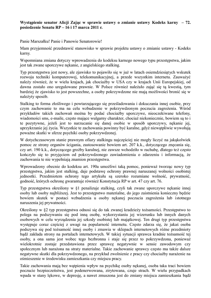 Wystąpienie senator Alicji Zając w sprawie ustawy o zmianie ustawy Kodeks karny – 72. posiedzenie Senatu RP – 16 i 17 marca 2011 r. Panie Marszałku! Panie i Panowie Senatorowie! Mam przyjemność przedstawić stanowisko w sprawie projektu ustawy o zmianie ustawy - Kodeks karny. Wspomniana zmiana dotyczy wprowadzenia do kodeksu karnego nowego typu przestępstwa, jakim jest tak zwane uporczywe nękanie, z angielskiego stalking. Typ przestępstwa jest nowy, ale zjawisko to pojawiło się w już w latach osiemdziesiątych wskutek rozwoju techniki komputerowej, telekomunikacyjnej, a przede wszystkim internetu. Zauważyć należy również, że w wielu krajach, jak chociażby w USA czy w krajach Unii Europejskiej, od dawna zostało ono uregulowane prawnie. W Polsce również należało zająć się tą kwestią, tym bardziej że zjawisko to jest powszechne, a osoby pokrzywdzone nie mają możliwości bronić się w należyty sposób. Stalking to forma złośliwego i powtarzającego się prześladowania i dokuczania innej osobie, przy czym zachowanie to ma na celu wzbudzenie w pokrzywdzonym poczucia zagrożenia. Wśród przykładów takich zachowań można by podać chociażby uporczywe, nieoczekiwane telefony, wiadomości sms, e-maile, często mające wulgarny charakter, chociaż niekoniecznie, bowiem są to i te pozytywne, jeżeli jest to narzucanie się danej osobie w sposób uporczywy, nękanie jej, uprzykrzanie jej życia. Wszystkie te zachowania powinny być karalne, gdyż niewątpliwie wywołują poważne skutki w sferze psychiki osoby pokrzywdzonej. W dotychczasowym stanie prawnym ofiary stalkingu najczęściej nie mogły liczyć na jakąkolwiek pomoc ze strony organów ścigania, zastosowanie bowiem art. 207 k.k., dotyczącego znęcania się, czy art. 190 k.k., dotyczącego groźby karalnej, nie zawsze wchodziło w rachubę, dlatego też często kończyło się to przyjęciem od pokrzywdzonego zawiadomienia o zdarzeniu i informacją, że zachowania te nie wypełniają znamion przestępstwa. Wprowadzony obecnie do kodeksu art. 190a umożliwi taką pomoc, ponieważ tworząc nowy typ przestępstwa, jakim jest stalking, daje podstawę ochrony prawnej naruszanej wolności osobistej jednostki. Przedmiotem ochrony tego artykułu są szeroko rozumiane wolność, prywatność, godność, których ochronę gwarantuje również Konstytucja RP w art. 47 czy art. 76. Typ przestępstwa określony w §1 penalizuje stalking, czyli tak zwane uporczywe nękanie innej osoby lub osoby najbliższej. Jest to przestępstwo materialne, do jego zaistnienia konieczny będzie bowiem skutek w postaci wzbudzenia u osoby nękanej poczucia zagrożenia lub istotnego naruszenia jej prywatności. Określony w §2 typ przestępstwa odnosi się do tak zwanej kradzieży tożsamości. Przestępstwo to polega na podszywaniu się pod inną osobę, wykorzystaniu jej wizerunku lub innych danych osobowych w celu wyrządzenia jej szkody osobistej lub majątkowej. Ten drugi typ przestępstwa występuje coraz częściej z uwagi na popularność internetu. Często zdarza się, że jakaś osoba podszywa się pod tożsamość innej osoby i zmawia w sklepach internetowych różne przedmioty bądź zakłada strony na portalach internetowych. W takiej sytuacji sprawca kradnie tożsamość tej osoby, a ona sama jest wobec tego bezbronna i staje się przez to pokrzywdzona, ponieważ wielokrotnie zostaje przedstawiona przez sprawcę negatywnie w sensie zawodowym czy społecznym lub narażona na straty materialne. Takie zachowanie sprawcy często ma także dalsze negatywne skutki dla pokrzywdzonego, na przykład zwolnienie z pracy czy chociażby narażenie na ośmieszenie w środowisku zamieszkania czy miejscu pracy. Takie zachowania mają bez wątpienia wpływ na psychikę osoby nękanej, osoba taka traci bowiem poczucie bezpieczeństwa, jest podenerwowana, zirytowana, czuje strach. W wielu przypadkach wpada w stany lękowe, w depresję, a nawet zmuszona jest do zmiany miejsca zamieszkania bądź zmiany miejsca pracy. Wszystko to bez wątpienia odbija się na zdrowiu pokrzywdzonego, dlatego penalizacja tych zachowań jest społecznie uzasadniona. Obydwa wskazane przestępstwa mają charakter prywatnoskargowy, a zatem decyzja w sprawie ścigania należy do pokrzywdzonego. Skrajnym skutkiem tych zachowań może być także próba popełnienia samobójstwa przez osobę nękaną - znane są takie przypadki. Dlatego też w §3 wprowadzono typ kwalifikowany tego przestępstwa zagrożony karą pozbawienia wolności do lat dziesięciu w sytuacji, gdy następstwem czynów określonych w art. 190a §1 i §2 jest targnięcie się pokrzywdzonego na własne życie. Efektem wprowadzenia nowych typów przestępstw jest również konieczność wprowadzenia nowego środka karnego do katalogu dotychczas istniejących. Dlatego też zmienia się art. 41 §1 k.k. w tym zakresie. Zostaje w nim wprowadzony zakaz zbliżania się do określonych osób, zakaz opuszczania określonego miejsca pobytu, zakaz kontaktowania się z określonymi osobami, nakaz opuszczenia lokalu zajmowanego wspólnie z pokrzywdzonym i obowiązek powstrzymywania się od przebywania w określonych środowiskach i miejscach. Ze względu na fakt, że reakcja na nowe zjawiska społeczne - w sytuacji, gdy nie są one objęte regulacją prawną, a naruszają dobra konstytucyjnie chronione - jest konieczna, wprowadzenie tych przepisów do kodeksu karnego jest w pełni uzasadnione. Dziękuję.