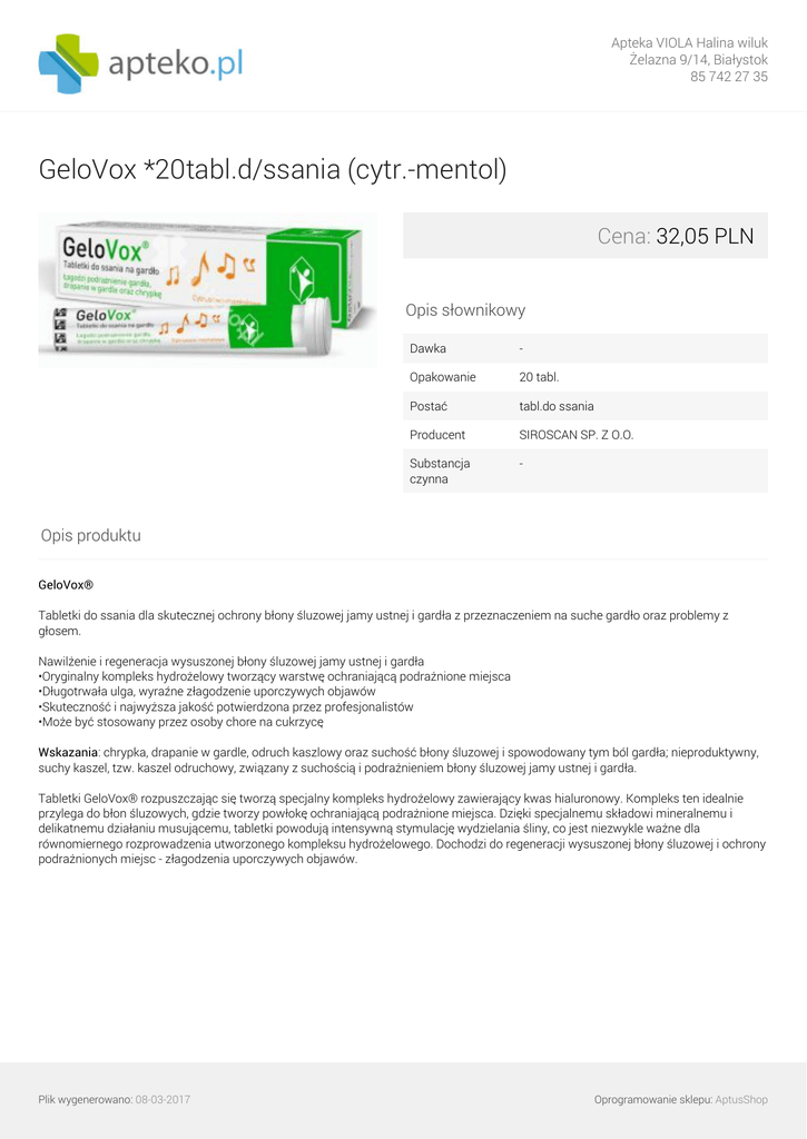 Apteka VIOLA Halina wiluk Żelazna 9/14, Białystok 85 742 27 35 GeloVox *20tabl.d/ssania (cytr.-mentol) Cena: 32,05 PLN Opis słownikowy Dawka - Opakowanie 20 tabl. Postać tabl.do ssania Producent SIROSCAN SP. Z O.O. Substancja czynna - Opis produktu GeloVox® Tabletki do ssania dla skutecznej ochrony błony śluzowej jamy ustnej i gardła z przeznaczeniem na suche gardło oraz problemy z głosem. Nawilżenie i regeneracja wysuszonej błony śluzowej jamy ustnej i gardła •Oryginalny kompleks hydrożelowy tworzący warstwę ochraniającą podrażnione miejsca •Długotrwała ulga, wyraźne złagodzenie uporczywych objawów •Skuteczność i najwyższa jakość potwierdzona przez profesjonalistów •Może być stosowany przez osoby chore na cukrzycę Wskazania: chrypka, drapanie w gardle, odruch kaszlowy oraz suchość błony śluzowej i spowodowany tym ból gardła; nieproduktywny, suchy kaszel, tzw. kaszel odruchowy, związany z suchością i podrażnieniem błony śluzowej jamy ustnej i gardła. Tabletki GeloVox® rozpuszczając się tworzą specjalny kompleks hydrożelowy zawierający kwas hialuronowy. Kompleks ten idealnie przylega do błon śluzowych, gdzie tworzy powłokę ochraniającą podrażnione miejsca. Dzięki specjalnemu składowi mineralnemu i delikatnemu działaniu musującemu, tabletki powodują intensywną stymulację wydzielania śliny, co jest niezwykle ważne dla równomiernego rozprowadzenia utworzonego kompleksu hydrożelowego. Dochodzi do regeneracji wysuszonej błony śluzowej i ochrony podrażnionych miejsc - złagodzenia uporczywych objawów. Plik wygenerowano: 08-03-2017 Powered by TCPDF (www.tcpdf.org) Oprogramowanie sklepu: AptusShop