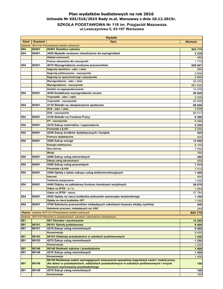 Plan wydatków budżetowych na rok 2016 SZKOŁA PODSTAWOWA