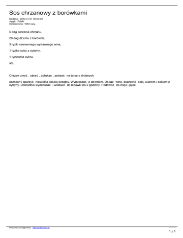 Sos chrzanowy z borówkami Dodano: 2000-01-01 00:00:00 Język: Polski Odwiedzono: 1663 razy. 5 dag korzenia chrzanu, 20 dag dżemu z borówek, 3 łyżki czerwonego wytrawnego wina, 1 łyżka soku z cytryny, 1 łyżeczka cukru, sól, Chrzan umyć, obrać, opłukać, zetrzeć na tarce o drobnych oczkach i sparzyć niewielką ilością wrzątku. Wymieszać z dżemem. Dodać wino, doprawić solą, cukrem i sokiem z cytryny. Dokładnie wymieszać i wstawić do lodówki na 2 godziny. Podawać do mięs i jajek. Wirtualna Kuchni@ Polska - http://kuchnia.now.pl przepis nr 621, plik wygenerowano 2017.03.08 10:24 1z1