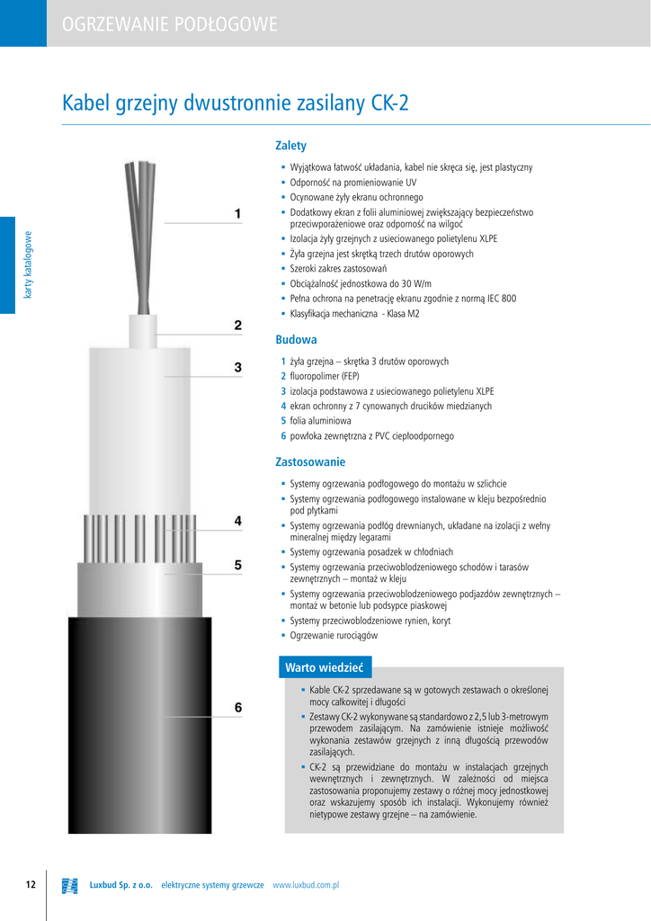 OGRZEWANIE PODŁOGOWE Kabel grzejny dwustronnie zasilany CK-2 Zalety Wyjątkowa łatwość układania, kabel nie skręca się, jest plastyczny Odporność na promieniowanie UV Ocynowane żyły ekranu ochronnego karty katalogowe Dodatkowy ekran z folii aluminiowej zwiększający bezpieczeństwo przeciwporażeniowe oraz odporność na wilgoć Izolacja żyły grzejnych z usieciowanego polietylenu XLPE Żyła grzejna jest skrętką trzech drutów oporowych Szeroki zakres zastosowań Obciążalność jednostkowa do 30 W/m Pełna ochrona na penetrację ekranu zgodnie z normą IEC 800 Klasyfikacja mechaniczna - Klasa M2 Budowa 1 żyła grzejna – skrętka 3 drutów oporowych 2 fluoropolimer (FEP) 3 izolacja podstawowa z usieciowanego polietylenu XLPE 4 ekran ochronny z 7 cynowanych drucików miedzianych 5 folia aluminiowa 6 powłoka zewnętrzna z PVC ciepłoodpornego Zastosowanie Systemy ogrzewania podłogowego do montażu w szlichcie Systemy ogrzewania podłogowego instalowane w kleju bezpośrednio pod płytkami Systemy ogrzewania podłóg drewnianych, układane na izolacji z wełny mineralnej między legarami Systemy ogrzewania posadzek w chłodniach Systemy ogrzewania przeciwoblodzeniowego schodów i tarasów zewnętrznych – montaż w kleju Systemy ogrzewania przeciwoblodzeniowego podjazdów zewnętrznych – montaż w betonie lub podsypce piaskowej Systemy przeciwoblodzeniowe rynien, koryt Ogrzewanie rurociągów Warto wiedzieć Kable CK-2 sprzedawane są w gotowych zestawach o określonej mocy całkowitej i długości Zestawy CK-2 wykonywane są standardowo z 2,5 lub 3-metrowym przewodem zasilającym. Na zamówienie istnieje możliwość wykonania zestawów grzejnych z inną długością przewodów zasilających. CK-2 są przewidziane do montażu w instalacjach grzejnych wewnętrznych i zewnętrznych. W zależności od miejsca zastosowania proponujemy zestawy o różnej mocy jednostkowej oraz wskazujemy sposób ich instalacji. Wykonujemy również nietypowe zestawy grzejne – na zamówienie. 12 Luxbud Sp. z o.o. elektryczne systemy grzewcze www.luxbud.com.pl OGRZEWANIE PODŁOGOWE Dane techniczne Schody, podjazdy Rynny Chłodnie Rurociągi 33,0 W/m 33,0 W/m 33,0 W/m 15,0 W/m 15,0 W/m Napięcie znamionowe 230V AC / 400V AC Max. wytrzymałość temperaturowa od - 20 °C +80°C Stopień ochrony karty katalogowe Max. jednostkowa moc grzejna Ogrzewanie podłogowe IP67 Min. promień gięcia 6 krotna rednica zewnętrzna kabla Min. temp. montażu –5°C Średnica zewnętrzna od 5,1 mm do 5,7 mm od 0,04 Ω/m do 9,0 Ω/m Rezystancja jednostkowa Standardowe zestawy grzejne Zestawy 10 W/m Symbol Zestawy 18 W/m Długość [m] Moc zestawu [W] CK-2-10-240 24 240 CK-2-10-290 28 290 CK-2-10-420 40 CK-2-10-640 61 CK-2-10-740 71 Symbol Długość [m] Moc zestawu [W] CK-2-18-320 18 320 CK-2-18-380 21 380 420 CK-2-18-540 30 540 640 CK-2-18-840 47 840 740 CK-2-18-970 54 970 CK-2-10-970 91 970 CK-2-18-1260 70 1260 CK-2-10-1240 118 1240 CK-2-18-1620 90 1620 CK-2-10-1450 145 1450 CK-2-18-1950 108 1950 CK-2-10-1760 167 1760 CK-2-18-2300 127 2300 CK-2-10-1800 184 1800 CK-2-18-2500 137 2500 CK-2-10-2300 232 2300 CK-2-18-3100 173 3100 CK-2-10-2800 278 2800 CK-2-18-3700 207 3700 CK-2-10-3700 355 3700 CK-2-18-4800 271 4800 Długość [m] Moc zestawu [W] Zestawy 25 W/m Symbol Zestawy 30 W/m Długość [m] Moc zestawu [W] Symbol CK-2-25-380 15 380 CK-2-30-400 14 400 CK-2-25-450 18 450 CK-2-30-500 17 500 CK-2-25-640 26 640 CK-2-30-700 24 700 CK-2-25-990 40 990 CK-2-30-1100 36 1100 CK-2-25-1150 46 1150 CK-2-30-1250 42 1250 CK-2-25-1500 59 1500 CK-2-30-1600 54 1600 CK-2-25-1900 77 1900 CK-2-30-2100 70 2100 CK-2-25-2300 92 2300 CK-2-30-2500 84 2500 CK-2-25-2700 108 2700 CK-2-30-3000 98 3000 CK-2-25-2900 116 2900 CK-2-30-3200 106 3200 CK-2-25-3600 146 3600 CK-2-30-4000 133 4000 CK-2-25-4400 176 4400 CK-2-30-4800 160 4800 CK-2-25-5700 230 5700 CK-2-30-6300 210 6300 www.luxbud.com.pl elektryczne systemy grzewcze Luxbud Sp. z o.o. 13