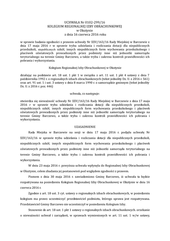 UCHWAŁA Nr 0102-299/16 KOLEGIUM REGIONALNEJ IZBY OBRACHUNKOWEJ w Olsztynie z dnia 16 czerwca 2016 roku w sprawie badania zgodności z prawem uchwały Nr XXV/163/16 Rady Miejskiej w Barczewie z dnia 17 maja 2016 r w sprawie trybu udzielania i rozliczania dotacji dla niepublicznych przedszkoli, niepublicznych szkół, innych niepublicznych form wychowania przedszkolnego i placówek oświatowych prowadzonych przez podmioty inne niż jednostki samorządu terytorialnego na terenie Gminy Barczewo, a także trybu i zakresu kontroli prawidłowości ich pobrania i wykorzystania. Kolegium Regionalnej Izby Obrachunkowej w Olsztynie działając na podstawie art. 18 ust. 1 pkt 1 w związku z art. 11 ust. 1 pkt 4 ustawy z dnia 7 października 1992 r. o regionalnych izbach obrachunkowych (tekst jednolity Dz. U. z 2016 r. 561) oraz art. 91 ust. 1 i ust. 3 ustawy z dnia 8 marca 1990 r. o samorządzie gminnym (tekst jednolity Dz. U. z 2016 r. poz. 446) uchwala, co następuje: stwierdza się nieważność uchwały Nr XXV/163/16 Rady Miejskiej w Barczewie z dnia 17 maja 2016 r w sprawie trybu udzielania i rozliczania dotacji dla niepublicznych przedszkoli, niepublicznych szkół, innych niepublicznych form wychowania przedszkolnego i placówek oświatowych prowadzonych przez podmioty inne niż jednostki samorządu terytorialnego na terenie Gminy Barczewo, a także trybu i zakresu kontroli prawidłowości ich pobrania i wykorzystania. UZASADNIENIE Rada Miejska w Barczewie na sesji w dniu 17 maja 2016 r. podjęła uchwałę Nr XXV/163/16 w sprawie trybu udzielania i rozliczania dotacji dla niepublicznych przedszkoli, niepublicznych szkół, innych niepublicznych form wychowania przedszkolnego i placówek oświatowych prowadzonych przez podmioty inne niż jednostki samorządu terytorialnego na terenie Gminy Barczewo, a także trybu i zakresu kontroli prawidłowości ich pobrania i wykorzystania. W dniu 23 maja 2016 r. powyższa uchwała wpłynęła do Regionalnej Izby Obrachunkowej w Olsztynie, celem zbadania jej postanowień pod względem zgodności z prawem. Pismem z dnia 30 maja 2016 r. zawiadomiono Gminę Barczewo, iż uchwała ta będzie rozpatrywana na posiedzeniu Kolegium Regionalnej Iżby Obrachunkowej w Olsztynie w dniu 16 czerwca 2016 r. Zgodnie z art. 18 ust. 3 cyt. ustawy o regionalnych izbach obrachunkowych, w posiedzeniu kolegium ma prawo uczestniczyć przedstawiciel podmiotu, którego sprawa jest rozpatrywana. Przedstawiciel Gminy Barczewo nie uczestniczył w posiedzeniu Kolegium Izby. Stosownie do art. 18 ust. 1 pkt 1 ustawy o regionalnych izbach obrachunkowych. orzekanie o nieważności uchwał i zarządzeń, w sprawach wymienionych w art. 11 ust. 1 w/w ustawy, zastrzeżono dla kolegium regionalnej izby obrachunkowe. Przepis art. 11 ust. 1 pkt 4 ustawy o regionalnych izbach obrachunkowych stanowi, że właściwość rzeczowa regionalnych izb obrachunkowych obejmuje uchwały i zarządzenia podejmowane przez organy jednostek samorządu terytorialnego w sprawach zasad i zakresu przyznawania dotacji z budżetu jednostki samorządu terytorialnego. Upoważnieniem ustawowym wyznaczającym kompetencje do podjęcia przedmiotowej uchwały jest art. 90 ust. 4 ustawy z dnia 7 września 1991 r. o systemie oświaty (t. j. Dz. U. z 2015 r., poz. 2156 ze zm.) zgodnie, z którym organ stanowiący jednostki samorządu terytorialnego ustala tryb udzielania i rozliczania dotacji, o których mowa w ust. 1a-1c i 2-3b, oraz tryb i zakres kontroli prawidłowości ich pobrania i wykorzystywania, uwzględniając w szczególności podstawę obliczania dotacji, zakres danych, które powinny być zawarte we wniosku o udzielenie dotacji i w rozliczeniu jej wykorzystania, oraz termin i sposób rozliczenia dotacji. Na wstępie Kolegium Izby wskazuje, że w podstawie prawnej przedmiotowej uchwały wskazano zarówno m. in. art. 80 ust. 4 jak i art. 90 ust. 4, które delegują do normowania sprawy dotacji udzielanych dla publicznych (art. 80 ust. 4) jak i niepublicznych (art. 90 ust. 4) odpowiednich jednostek systemu oświaty, podczas gdy z § 1 przedmiotowej uchwały wynika, że ustalono tryb udzielania i rozliczania dotacji z budżetu Gminy Barczewo jedynie dla odpowiednich niepublicznych jednostek systemu oświaty. Upoważnieniem ustawowym wyznaczającym kompetencje do podjęcia przedmiotowej uchwały jest art. 90 ust. 4 ustawy z dnia 7 września 1991 r. o systemie oświaty ( t. j. Dz. U. z 2015 r. poz. 2156 ze zm.) zgodnie, z którym organ stanowiący jednostki samorządu terytorialnego ustala tryb udzielania i rozliczania dotacji, o których mowa w ust. 1a-1c i 2-3b, oraz tryb i zakres kontroli prawidłowości ich pobrania i wykorzystywania, uwzględniając w szczególności podstawę obliczania dotacji, zakres danych, które powinny być zawarte we wniosku o udzielenie dotacji i w rozliczeniu jej wykorzystania, oraz termin i sposób rozliczenia dotacji. Kolegium Izby wskazuje, że przedmiotowa uchwała jest aktem prawa miejscowego (ma charakter generalny i abstrakcyjny), wobec czego powinna normować wszystkie sprawy wynikające z udzielonego upoważnienia ustawowego bez względu na to czy jednostka oświaty danego typu występuje na terenie danej jednostki samorządu terytorialnego – chyba, że upoważnienie takie ma charakter uznaniowy. Kolegium Izby stwierdza, że w § 2 ust. 1 przedmiotowej uchwały Rada Miejska w Barczewie postanowiła, że podstawą obliczania miesięcznej stawki dotacji na jednego ucznia jest uchwała budżetowa Gminy Barczewo wraz z uwzględnieniem zmian wprowadzonych do niej w trakcie roku budżetowego, oraz informacja o sposobie wyliczenia części oświatowej subwencji ogólnej dla Gminy Barczewo, otrzymana od ministra właściwego do spraw oświaty, w wyniku czego Rada Miejska w Barczewie określiła zasady obliczania tych dotacji, co narusza art. 90 ust. 4 ustawy o systemie oświaty, który upoważnia Radę Gminy Barczewo jedynie do określenia trybu udzielania i rozliczania dotacji okreś