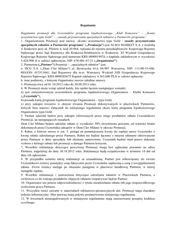 Regulamin Regulamin promocji dla Uczestników programu lojalnościowego „Klub Konesera” – „Konto uczestnictwa typu Gold” – „zasady przyznawania specjalnych rabatów u Partnerów programu” 1. Organizatorem Promocji pod nazwą: „Konto uczestnictwa typu Gold - zasady przyznawania specjalnych rabatów u Partnerów programu” („Promocja”) jest ALMA MARKET S.A. z siedzibą w Krakowie przy ul. Pilotów 6, kod 30-964, wpisana do rejestru przedsiębiorców Krajowego Rejestru Sadowego przez Sąd Rejonowy dla Krakowa-Śródmieścia w Krakowie, XI Wydział Gospodarczy Krajowego Rejestru Sądowego pod numerem KRS 0000019474, o kapitale zakładowym w wysokości 5.428.990 zł w całości opłaconym, NIP: 676-001-67-31 („Organizator”). 2. Partnerem („Partner”) Promocji – „specjalnych rabatów” jest: a. DCG S.A. („Deni Cler Milano”) ul. Bystrzycka 81A 04-907 Warszawa, NIP: 113-00-15-696, REGON: 012513641, Sąd Rejonowy dla m.st. Warszawy Wydział XIII Gospodarczy Krajowego Rejestru Sądowego, KRS 0000285675 Kapitał zakładowy 4.363.600 PLN w całości opłacony. b. inne podmioty, z którymi Organizator zawrze odrębne umowy. 3. Promocja trwa od 01.10.2012 roku do 30.09.2013 roku. 4. W Promocji może wziąć udział każdy, kto spełni łącznie następujące warunki: a) jest zarejestrowanym uczestnikiem programu lojalnościowego Organizatora – Klubu Konesera („Uczestnik”), b) posiada kartę programu lojalnościowego Organizatora – typu Gold, c) przy zakupie towarów w okresie trwania Promocji dokonywanych w placówkach Partnerów, których lista stanowi Załącznik do niniejszego regulaminu okaże kartę programu lojalnościowego Organizatora typu Gold. 5. Partner udzielał będzie przy zakupie oferowanych przez niego produktów rabatu Uczestnikowi Promocji, na następujących zasadach: Deni Cler Milano będzie udzielać rabatu w wysokości 30% (trzydziestu procent), od wartości brutto dokonanych przez Uczestnika zakupów w Deni Cler Milano w okresie Promocji. 6. Rabat, o którym mowa w ust. 5. polega na pomniejszeniu kwoty do zapłaty przez Uczestnika o kwotę rabatu udzielanego przez Partnera. Rabat nie będzie łączony z innymi rabatami oferowanymi przez Partnera w dniu sprzedaży lub złożenia zamówienia. Uczestnik będzie miał prawo dokonać wyboru z którego rabatu lub promocji u danego Partnera korzysta. 7. Wszelkie reklamacje dotyczące powyższej Promocji mogą być zgłaszane pisemnie na adres Partnera, najpóźniej do dnia 30.10.2012 roku. Reklamacje będą rozpatrywane w terminie 14 dni od daty ich zgłoszenia. 8. W przypadku uznania takiej reklamacji za uzasadnioną, Partner jest zobowiązany do zwrotu Uczestnikowi różnicy pomiędzy ceną faktycznie przez Uczestnika zapłaconą a ceną z uwzględnieniem rabatu. Zwrot różnicy nastąpi po okazaniu paragonu w placówce handlowej Partnera, w której nastąpiła zapłata. 9. Wszelkie reklamacje i zastrzeżenia dotyczące udzielania rabatów w Placówkach Partnera, a zwłaszcza co do rodzaju produktów objętych rabatem rozpatrywać będzie Partner. 10. Organizator nie ponosi odpowiedzialności z tytułu nieudzielania rabatu lub jego nieprawidłowego rozliczenia przez Partnera. 11. Wszystkie treści zawarte w materiałach reklamowo-promocyjnych dot. Promocji mają charakter jedynie informacyjny. Moc prawną mają jedynie postanowienia niniejszego regulaminu. 12. W kwestiach nieuregulowanych w niniejszym regulaminie mają zastosowanie przepisy kodeksu cywilnego. 13. Organizator zastrzega sobie prawo do zmian niniejszego regulaminu w trakcie Promocji, w szczególności do skrócenia okresu trwania Promocji, zmiany zasad niniejszej Promocji. 14. Treść regulaminu Promocji dostępna jest w placówkach handlowych Partnerów, w siedzibie Organizatora, w siedzibach Partnerów oraz na stronie internetowej www. almamarket.pl Lista placówek handlowych Partnera 1. (S.128 ) Galeria Handlowa Alfa ul. Świętojańska 15 lok. H46 + 1, Białystok 15-277, tel. 85 741-4403 2. (S.126) Galeria Handlowa fokus ul. Jagiellońska 39/47 lok.067,Bydgoszcz 85-097, tel. 52 554-3630 3. (S.111) Sklep Wolnostojący ul. Długa 31,Bydgoszcz 85-034, tel. 52 322-68-94 4. (S.112) Sklep Wolnostojący ul. NMP 29 Częstochowa 42-200 tel. 34 365-34-00 5. (S.124) Galeria Bałtycka ul. Al. Grunwaldzka 141 Gdańsk 80-264, tel. 58 345-00-99 6. (S.117) Galeria Handlowa Klif ul. Al. Zwycięstwa256 Gdynia 81-525, tel. 58 624-84-61 7. (S.103) Sklep Wolnostojący ul. Staromiejska 11 Katowice 40-013, tel. 32 206-97-34 8. (S.129) Galeria Handlowa Silesia City Center ul. Chorzowska 111 Katowice 40-101,tel. 32 605-0135 9. (S.121) Galeria Krakowska ul. Pawia 5 Kraków 31-154, tel. 12 628-70-27 10. (S.102) Sklep Wolnostojący ul. Św. Jana 2 Kraków 31-018, tel. 12 423-09-67 11. (S.104) Sklep Wolnostojący ul. Piotrkowska 31 Łódź 90-410, tel. 42 632-43-44 12. (S.116) Galeria Łódzka ul. Piłsudzkiego 15/23 Łódź 90-307, tel. 42 639-54-29 13. (S.120) Galeria Handlowa Manufaktura ul. Karskiego 5 lok.B-152 Łódź 91-071, tel. 42 634-80-65 14. (S.130) Galeria Handlowa Solaris ul. Pl. Kopernika 16 Opole 45-040, tel. 77 448-58-11 15. (S.122) Galeria Handlowa Stary Browar ul. Półwiejska 42 lok.309 Poznań 61-888, tel. 61 667-1344 16. (S.106) Sklep wolnostojący ul. Wojska Polskiego 27 Szczecin 70-470, tel. 91 489-32-75 17. (S.101) Sklep Wolnostojący ul. Kopernika 8/18 Warszawa 00-367, tel. 22 827-91-68 18. (S.110) Galeria Mokotów ul. Wołowska 12 Warszawa 02-675, tel. 22 541-31-52 19. (S.114) Galeria Handlowa Klif ul. Okopowa 58/72 Warszawa 01-042, tel. 22 531-46-70 20. (S.127) Galeria Handlowa Sadyba Best Mall ul. Powsińska 31 lok.144 Warszawa 02-903, tel. 22 310-30-44 21. (S.131) Galeria Handlowa Złote Tarasy ul. Złota 59 Warszawa 00-120, tel. 22 222-03-68 22. (S.123) Galeria Handlowa Pasaż Grunwaldzki ul.Pl. Grunwaldzki 22 lok.1034 Wrocław 50384,tel.71 347-11-95 23. (S.105) Sklep Wolnostojący ul. Pl. Solny 6/7 Wrocław 50-061, t