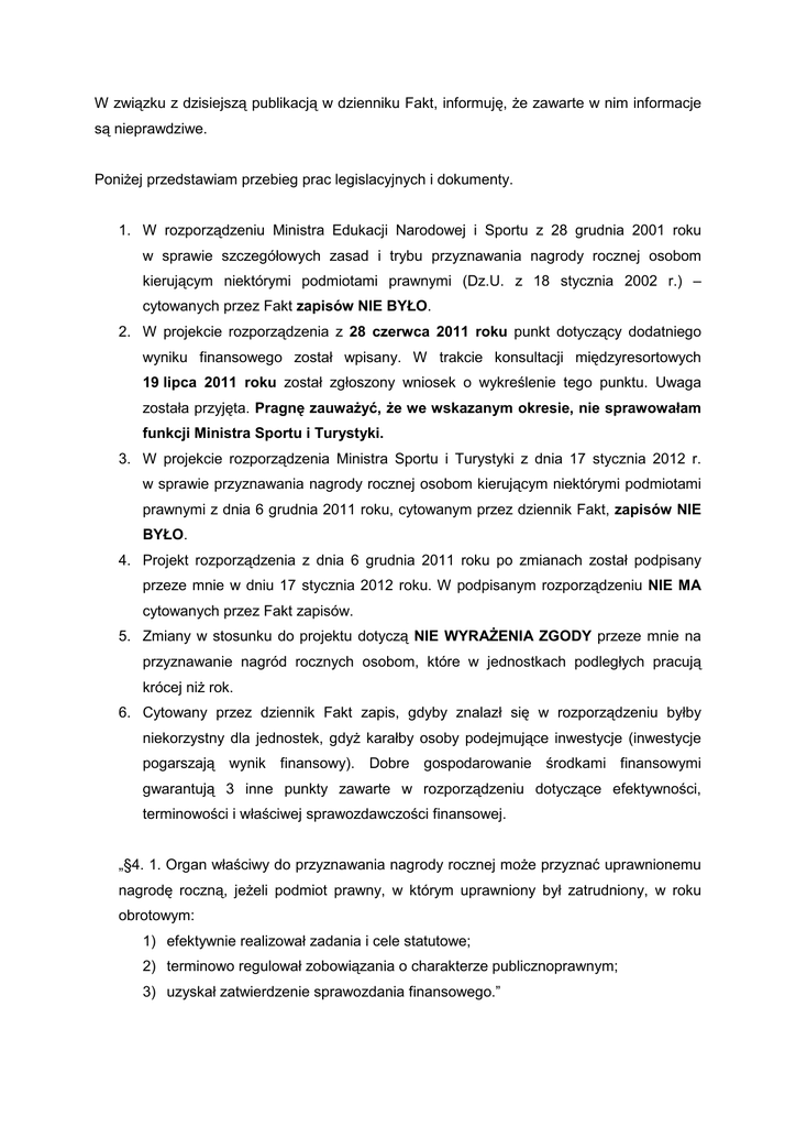 W związku z dzisiejszą publikacją w dzienniku Fakt, informuję, że zawarte w nim informacje są nieprawdziwe. Poniżej przedstawiam przebieg prac legislacyjnych i dokumenty. 1. W rozporządzeniu Ministra Edukacji Narodowej i Sportu z 28 grudnia 2001 roku w sprawie szczegółowych zasad i trybu przyznawania nagrody rocznej osobom kierującym niektórymi podmiotami prawnymi (Dz.U. z 18 stycznia 2002 r.) – cytowanych przez Fakt zapisów NIE BYŁO. 2. W projekcie rozporządzenia z 28 czerwca 2011 roku punkt dotyczący dodatniego wyniku finansowego został wpisany. W trakcie konsultacji międzyresortowych 19 lipca 2011 roku został zgłoszony wniosek o wykreślenie tego punktu. Uwaga została przyjęta. Pragnę zauważyć, że we wskazanym okresie, nie sprawowałam funkcji Ministra Sportu i Turystyki. 3. W projekcie rozporządzenia Ministra Sportu i Turystyki z dnia 17 stycznia 2012 r. w sprawie przyznawania nagrody rocznej osobom kierującym niektórymi podmiotami prawnymi z dnia 6 grudnia 2011 roku, cytowanym przez dziennik Fakt, zapisów NIE BYŁO. 4. Projekt rozporządzenia z dnia 6 grudnia 2011 roku po zmianach został podpisany przeze mnie w dniu 17 stycznia 2012 roku. W podpisanym rozporządzeniu NIE MA cytowanych przez Fakt zapisów. 5. Zmiany w stosunku do projektu dotyczą NIE WYRAŻENIA ZGODY przeze mnie na przyznawanie nagród rocznych osobom, które w jednostkach podległych pracują krócej niż rok. 6. Cytowany przez dziennik Fakt zapis, gdyby znalazł się w rozporządzeniu byłby niekorzystny dla jednostek, gdyż karałby osoby podejmujące inwestycje (inwestycje pogarszają wynik finansowy). Dobre gospodarowanie środkami finansowymi gwarantują 3 inne punkty zawarte w rozporządzeniu dotyczące efektywności, terminowości i właściwej sprawozdawczości finansowej. „§4. 1. Organ właściwy do przyznawania nagrody rocznej może przyznać uprawnionemu nagrodę roczną, jeżeli podmiot prawny, w którym uprawniony był zatrudniony, w roku obrotowym: 1) efektywnie realizował zadania i cele statutowe; 2) terminowo regulował zobowiązania o charakterze publicznoprawnym; 3) uzyskał zatwierdzenie sprawozdania finansowego.”