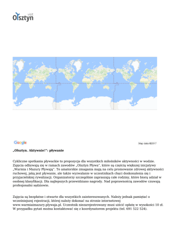 „Olsztyn. Aktywnie!”: pływanie Cykliczne spotkania pływackie to propozycja dla wszystkich miłośników aktywności w wodzie. Zajęcia odbywają się w ramach zawodów „Olsztyn Pływa”, które są częścią większej inicjatywy „Warmia i Mazury Pływają”. Te amatorskie zmagania mają na celu promowanie zdrowej aktywności ruchowej, jaką jest pływanie, ale także wyzwalanie w uczestnikach chęci doskonalenia się i przyjacielskiej rywalizacji. Organizatorzy szczególnie zapraszają całe rodziny, które biorą udział w osobnej klasyfikacji. Dla najlepszych przewidziano nagrody. Nad poprawnością zawodów czuwają profesjonalni sędziowie. Zajęcia są bezpłatne i otwarte dla wszystkich zainteresowanych. Należy jednak pamiętać o wcześniejszej rejestracji, której należy dokonać na stronie internetowej www.warmiaimazury.plywaja.pl. Uczestnik niezarejestrowany musi uiścić opłatę w wysokości 10 zł. W przypadku pytań można kontaktować się z koordynatorem projektu (tel. 691 522 524). Zajęcia odbywają się w ramach „Olsztyn. Aktywnie!”. To coroczna, trwająca od wiosny do jesieni akcja, organizowana z myślą o mieszkańcach miasta i odwiedzających je gościach. Promuje ona aktywny i zdrowy tryb życia, umożliwiając wszystkim chętnym udział w licznych zajęciach sportowych i rekreacyjnych. Szerszy opis akcji. 1)Pływalnia Uniwersytecka, (2014-04-05 07:00-2014-04-05 07:00) 2)Pływalnia Uniwersytecka, (2014-05-10 07:00-2014-05-10 07:00) 3)Pływalnia Uniwersytecka, (2014-10-04 07:00-2014-10-04 07:00) 4)Pływalnia Uniwersytecka, (2014-11-08 07:00-2014-11-08 07:00) 5)Pływalnia Uniwersytecka, (2014-12-06 07:00-2014-12-06 07:00) www.visit.olsztyn.eu