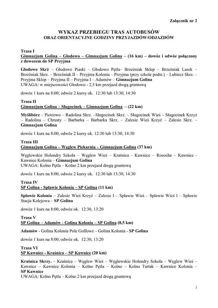 Załącznik nr 2 WYKAZ PRZEBIEGU TRAS AUTOBUSÓW ORAZ ORIENTACYJNE GODZINY PRZYJAZDÓW/ODJAZDÓW Trasa I Gimnazjum Golina – Głodowo – Gimnazjum Golina – (16 km) – dowóz i odwóz połączony z dowozem do SP Przyjma Głodowo Skrż – Głodowo Piaski – Głodowo Pętla– Brzeźniak Sklep – Brzeźniak Lasek – Brzeźniak Skrz. – Brzeźniak II – Przyjma Kolonia – Przyjma (przy szkole podst.) – Lubiecz Skrz. – Przyjma Sklep – Przyjma II – Przyjma I – Adamów – Gimnazjum Golina UWAGA: w miejscowości Głodowo - 2,5 km przejazd drogą gruntową dowóz 1 kurs na 8:00; odwóz 2 kursy ok. 12:30 lub 13:30, 14:30 Trasa II Gimnazjum Golina – Sługocinek – Gimnazjum Golina – (22 km) Myślibórz – Piotrowo – Radolina Skrz. –Sługocinek Skrz. – Sługocinek Wieś – Sługocinek Krzyż – Radolina – Chrusty – Barbarka – Barbarka Skrz. – Zalesie Wieś Krzyż – Zalesie Skrz. – Gimnazjum Golina dowóz 1 kurs na 8:00, odwóz 2 kursy ok. 12:30 lub 13:30, 14:30 Trasa III Gimnazjum Golina – Węglew Piekarnia – Gimnazjum Golina (37 km) Węglewskie Holendry Szkoła – Węglew Wieś – Kraśnica - Kawnice – Rosocha – Kawnice Kawnice Kolonia – Gimnazjum Golina UWAGA: Kolno Pętla – Kolno 2 km przejazd drogą gruntową dowóz 1 kurs na 8:00, odwóz 2 kursy ok. 12:30 lub 13:30, 14:30 Trasa IV SP Golina - Spławie Kolonia – SP Golina (11 km) Spławie Kolonia – Zalesie Wieś Krzyż – Zalesie I – Spławie Wieś – Spławie Wieś I – Spławie Stacja Kolejowa – SP Golina dowóz 1 kurs na 8:00, odwóz ok. 12:30, 13:20 Trasa V SP Golina – Adamów - Golina Kolonia – SP Golina (8,5 km) Adamów - Golina Kolonia Pole Golfowe – Golina Kolonia - SP Golina dowóz 1 kurs na 8:00, odwóz ok. 12:30, 13:20 Trasa VI SP Kawnice - Kraśnica – SP Kawnice (20 km) Kraśnica Skrzy. – Kraśnica – Węglew Wieś – Węglewskie Holendry Szkoła – Węglew Wieś – Kawnice – Kawnice Kolonia – Kolno Pętla – Kolno – Kolno Tartak – Kawnice Kolonia – SP Kawnice UWAGA: Kolno Pętla – Kolno 2 km przejazd drogą gruntową 1 dowóz 2 kursy na 7:30, 10:45 lub 11:45, odwóz 2 kursy ok. 12:35 lub 13:30, 16:00 Trasa VII SP Kawnice - Rosocha – SP Kawnice (12 km) Rosocha Krzyż – Rosocha Skrz. – Głodowo – Głodowo Pętla – Głodowo Piaski – Kawnice Tory – Szkoła Kawnice UWAGA: w miejscowości Głodowo - 2,5 km przejazd drogą gruntową dowóz 2 kursy na 7:30, 10:45 lub 11:45, odwóz 2 kursy ok. 12:35 lub 13:30, 16:00 Zamawiający nie dopuszcza połączenia trasy VI i VII na dowóz uczniów do szkoły w Kawnicach Odwóz dodatkowy gimnazjum klasa sportowa (odwóz po zajęciach w dwóch kierunkach) Trasa VIII (około 15 uczniów) (28 km) Klasa sportowa Gimnazjum – Adamów –– Brzeźniak – Głodowo – Rosocha – Kawnice – Węglew – Węglewskie Holendry - Kraśnica 1 odwóz ok. godz. 15:30 Tarasa IX (około 15 uczniów) (38 km) Klasa sportowa Gimnazjum – Spławie – Barbarka – Chrusty – Radolina – Sługocinek – Myslibórz – Golina – Golina Kolonia – Kolno 1 odwóz ok. godz. 15:30 UWAGA: 1. DOWÓZ: SP Kawnice – początek zajęć 7:30 – 2 autobusy (jadą później na dowóz do SP Golina) SP Golina – początek zajęć 8:00 - 2 autobusy Gimnazjum w Golinie - początek zajęć 8:00 – 3 autobusy dowóz z 3 kierunków Kawnice, Przyjma, Radolina 2. Ustalone godziny oraz przebieg tras przyjazdów i odjazdów uczniów mogą ulec zmianie od w zależności od zmiany rozkładu zajęć lekcyjnych w poszczególnych placówkach. 2 ZESTAWIENIE liczba kilometrów do przejechania w okresie od 01.01.2017 r. do 30.06.2017 r. Trasa Trasa I (połączony z dowozem do SP Przyjma) Głodowo - Brzeźniak - Przyjma – Lubiecz - Adamów – Gimnazjum Golina Trasa II Sługocinek – Radolina - Myślibórz – Chrusty - Zalesie - Gimnazjum Golina Trasa III Kraśnica - Węlewskie Holędry Węglew - Kawnice - Rosocha Kawnice - Kolno - Golina Kolonia Gimnazjum Golina Trasa IV Barbarka - Spławie – SP Golina Trasa V Adamów - Golina Kolonia – SP Golina Trasa VI Kraśnica – Węglewskie Hol. - Kolno SP Kawnice Trasa VII Rosocha Krzyż – Głodowo - SP Kawnice Trasa VIII – klasa sportowa (odwóz po zajęciach) ok. 15 uczniów Spławie - Barb. - Chrusty - Radolina Sługocinek - Myslibórz - Golina Golina Kolonia - Kolno - Gimnazjum Trasa IX – klasa sportowa (odwóz po zajęciach) ok. 15 uczniów Adamów - Przyjma - Lubiecz Brzeźniak - Głodowo - rosocha Kawnice - Kraśnica - Gimnazjum RAZEM Liczba Długoś Liczb Maksymal Planowa uczniów ć tras a na liczba na liczba w km kursó km do dni ww przejenauki ciągu chania w szkolnej dnia ciągu dnia Razem maksymalna liczba km do przejechania w ciągu roku szkolnego 45 gim. + 25 SP Przyjma 16 3 48 105 5040,00 50 22 3 66 105 6930,00 45 37 3 111 105 11655,00 45 11 3 33 105 3465,00 40 8,5 3 25,5 105 2677,50 45 20 4 80 105 8400,00 45 12 4 48 105 5040,00 28 1 28 105 2940,00 38 1 38 105 2964,00 217,50 30,00 542,50 x 49111,50 340,00 3