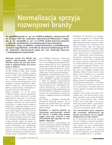 forum Opinie wyrażane w rubryce Forum są osobistymi przemyśleniami autorów Normalizacja sprzyja rozwojowi branży przy Zakładzie Rozwoju Technicznej Ochrony Mienia Techom, a pamiętajmy, że Normalizacyjna Komisja Problemowa (dzisiaj KT) nr 52 ds. Systemów Alarmowych powstała przy PKN dopiero dwa lata później. Komitet jest prowadzony od początku, na mocy umowy z PKN przez Stowarzyszenie Polalarm. Klasyfikacja central alarmowych w normach europejskich, opracowywanych przez CENELEC, pojawiła się dopiero w kilka lat później (wprowadzona w normie PN-E-08390-3:1998), lecz nie było powiązania ich z klasyfikacją systemów alarmowych, co w prosty sposób prezentował załącznik krajowy do PN-93/E-08390-14. Dlatego też nie było podstaw do formalnego wycofania tej normy z polskiego systemu normalizacyjnego. Pan Stefan J. Siudalski wielokrotnie krytykował Załącznik krajowy, ale ta krytyka nie przerodziala się w projekt rozwiązania, które ten Załącznik mogłoby zastąpić. blication). W zależności od charakteru normy następuje to w okresie kilku miesięcy, zwykle sześciu od daty opublikowania informacji o normie w dzienniku urzędowym UE. Ponieważ przeważnie w takim czasie nie zdąży się przygotować normy w j. polskim (albo takie wprowadzenie przekracza możliwości, tak jest m.in. w przypadku licznych i obszernych norm telekomunikacyjnych), wprowadza się ją metodą uznaniową. Norma taka, oznakowana po swoim numerze symbolem (U) lub za tytułem skrótem oryg., jest dostępna w języku oryginału (zwykle w angielskim) z polską stroną wprowadzającą. Jest ona oficjalnie przyjęta jako aktualna Polska Norma. Jeżeli temat takiej normy pokrywa się z tematem normy istniejącej i ta okazuje się sprzeczna, to jest wycofywana z polskiego systemu normalizacyjnego. Na marginesie informacja – wycofanie normy wcale nie oznacza, że nie można z niej korzystać, wszystko zależy od umowy między stronami zamawiający – dostawca. Opisana wyżej unijna procedura obowiązuje nas i jest powszechnie stosowana. Zgodnie z nią norma EN 501311 była wprowadzona jako PN-EN 50131-1 już w roku 2002, a po jej nowelizacji w CEN w 2006 r., wprowadzona jako PN-EN 50131-1:2007, z jednoczesnym wycofaniem wersji z 2002 r. Podobno w innych krajach są stosowane powszechnie normy EN 50131, a Polska jako jedyna ciągle trwa przy starych z serii PN-E-08390, jak sugeruje S.J. Siudalski. Dlaczego? Nie jest prawdą to stwierdzenie. Po ustanowieniu przez CEN lub CENELEC normy europejskie EN jest ona wprowadzana do polskiego systemu normalizacyjnego w wymaganym dla tego etapu okresie, tzw. DOP (date of pu- Czy rzeczywiście przy zamawianiu systemów alarmowych nie można powoływać się na angielskojęzyczną wersję normy? Po to wprowadza się normy europejskie do polskiego systemu normalizacyjnego uznaniowo, aby z nich korzystać, właśnie np. przy zamówieniach publicznych. Zgodnie z art. 5 Ustawy o normalizacji jedynie w przepisach prawnych mogą być powoływane PN po ich opublikowaniu w j. polskim. Po opublikowaniu w „sa” nr 4/2008 artykułu o stanie prac KT nr 52 przy PKN ds. Systemów Alarmowych Włamania i Napadu, p. S.J. Siudalski w „sa” nr 5/2008 zadał autorom pytania z zakresu działalności normalizacyjnej tego Komitetu. Redakcja, chcąc przybliżyć zainteresowanym Czytelnikom poruszane zagadnienia, zwróciła się do przewodniczącego KT 52 ds. Systemów alarmowych, pana dr. inż. Andrzeja Ryczera z następującymi pytaniami: Dlaczego norma EN 08390 (jej polski odpowiednik PN-93/E-08390), która nie jest już stosowana w żadnym kraju, jest stosowana w Polsce? Chodzi raczej o normę międzynarodową IEC 60839-1-4:1989, która została przetłumaczona na j. polski i ustanowiona w 1993 r. jako PN-93/E-08390-14 Systemy alarmowe – Wymagania ogólne – Zasady stosowania. Norma ta, oprócz wiernie przetłumaczonej treści oryginału, została uzupełniona załącznikiem krajowym, precyzującym jej główne postanowienia, czyli zasady stosowania systemów alarmowych. Należy pamiętać, że 15 lat temu, w okresie dużego wzrostu zapotrzebowania na systemy alarmowe i podaży najprostszych systemów, w tym produkowanych przez nowo powstałe firmy polskiego rzemiosła, nie było żadnych wytycznych, co takie systemy mogą zabezpieczać. Załącznik krajowy do tej normy wprowadzając klasyfikację systemów, dawał ogólne wytyczne w tym zakresie. Było to na tamte czasy pionierskie opracowanie nie tylko w skali kraju, gdyż nie było żadnych wzorców z zagranicy dotyczących klasyfikacji systemów. Z tego powodu mogło się zdarzyć, że niektóre postanowienia były ujęte może niezbyt precyzyjnie, nie uwzględniały pewnych cech urządzeń wówczas nieznanych, ale był to bardzo potrzebny dokument odniesienia. Załącznik opracowała grupa specjalistów skupiona nr 6, LISTOPAD – GRUDZIEŃ 2008 12 Czy w Polsce w związku z niewycofaniem normy PN-E-08390 są dostępne urządzenia gorszej jakości niż w innych krajach? Postęp techniczny i konkurencja powodują, że wszystkie oferowane urządzenia alarmowe zwykle z naddatkiem spełniają wymagania norm. Można nawet bez ryzyka stwierdzić, że technika często wyprzedza normalizację. Dlatego zrzucanie odpowiedzialności na normy o złą jakość urządzeń jest możliwe tylko przez osoby niewprowadzone w branżę. Ponadto należy zauważyć, że poza normami zharmonizowanymi z dyrektywami europejskimi stosowanie norm jest dobrowolne, w związku z tym zamawiający wcale nie ma obowiązku powoływać się na normę np. w zakresie właściwości funkcjonalnych urządzeń alarmowych. Kto personalnie jest odpowiedzialny za brak tłumaczenia najnowszej wersji arkusza normy EN 50131-1? Najnowsza część normy EN 50131-1 jest w Polsce wprowadzony metodą uznaniową PN-EN 50131-1(U) i można z niej od 2002 r. korzystać. Natomiast dostępność do wersji polskiej zależy od możliwości pozyskania przez KT 52 funduszy z bud