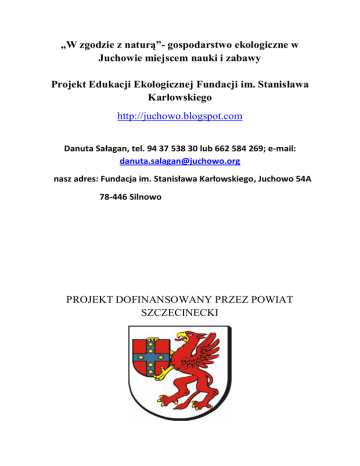 „W zgodzie z naturą”- gospodarstwo ekologiczne w Juchowie miejscem nauki i zabawy Projekt Edukacji Ekologicznej Fundacji im. Stanisława Karłowskiego http://juchowo.blogspot.com Danuta Sałagan, tel. 94 37 538 30 lub 662 584 269; e-mail: [email protected] nasz adres: Fundacja im. Stanisława Karłowskiego, Juchowo 54A 78-446 Silnowo PROJEKT DOFINANSOWANY PRZEZ POWIAT SZCZECINECKI „W zgodzie z naturą”- gospodarstwo ekologiczne w Juchowie miejscem nauki i zabawy Projekt Edukacji Ekologicznej Fundacji im. Stanisława Karłowskiego http://juchowo.blogspot.com Projekt dofinansowany przez powiat szczecinecki Projekt dofinansowany przez powiat szczecinecki Projekt Edukacji Ekologicznej Fundacji im. Stanisława Karłowskiego „W zgodzie z naturą” - program wizyty w gospodarstwie ekologicznym w Juchowie: 1. 9.30 - 9.35 przyjazd dzieci do gospodarstwa, krótkie przywitanie; 2. 9.35 – 10.35 zwiedzanie obór dla krów oraz cielętnika – „Świat wokół mleka”; 3. 10.35 – 12.00 wyjście na łąkę w poszukiwaniu naturalnych pomocników gospodarstwa*; 4. 12.00 – 12.30 zwiedzanie suszarni zbóż – „Świat wokół ziarna”; poznajemy zboża uprawiane w naszym gospodarstwie; 5. 12.30 – 13.30 zajęcia w Klubie „Koniczynka” – „Od ziarna do chleba”: · rozpoznawanie zbóż i produktów zbożowych - quizy i zabawy, · pieczenie podpłomyków, · zajęcia plastyczne: impresje dzieci z wizyty w gospodarstwie, · opowieść o zbożu. 6. 13.30 - 14.30 ognisko i zabawy na świeżym powietrzu; 7. 14.30 – powrót dzieci do domu. * alternatywnie do pkt. 3 programu: wycieczka przyrodnicza do lasu w poszukiwaniu zwiastunów wiosny lub jesieni, stosownie do pory roku Proszę pamiętać: I. Dzieci powinny mieć kalosze lub inne stabilne obuwie, obuwie na zmianę, odzież przeciwdeszczową oraz prowiant na ognisko. II. Dzieci będą piły mleko od krów z naszej hodowli. Prosimy o wcześniejsze sprawdzenie, które dzieci nie mogą pić mleka ze względów zdrowotnych. III. Koszt pobytu dziecka w gospodarstwie wynosi 15,00 zł. Fundacja im. Stanisława Karłowskiego wspiera ekologiczną edukację dzieci i młodzieży, dlatego też pokrywa część kosztów, dzięki czemu ostateczny koszt wynosi 5,00 zł. IV. Istnieje możliwość negocjacji opłat oraz uwzględnienia Państwa życzeń odnośnie programu wizyty w gospodarstwie. V.Osoby prowadzące spotkanie z dziećmi: Anna Białkowska, Katharina Huisman, Danuta Sałagan. VI. Zgłoszenia grup oraz kontakt merytoryczny: Danuta Sałagan, tel. 94 37 538 30 lub 662 584 269; e-mail: [email protected] nasz adres: Fundacja im. Stanisława Karłowskiego Juchowo 54A 78-446 Silnowo Informacje na temat naszego programu edukacyjnego znajdziecie Państwo również na stronach naszego blogu: http://juchowo.blogspot.com