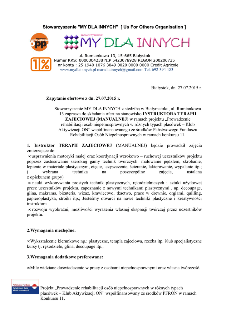 Stowarzyszenie "MY DLA INNYCH" [ Us For Others Organisation ] ul. Rumiankowa 13, 15-665 Białystok Numer KRS: 0000304238 NIP 5423078928 REGON 200206735 nr konta : 25 1940 1076 3049 0020 0000 0000 Credit Agricole www.mydlainnych.pl [email protected] Tel. 692-394-183 Białystok, dn. 27.07.2015 r. Zapytanie ofertowe z dn. 27.07.2015 r. Stowarzyszenie MY DLA INNYCH z siedzibą w Białymstoku, ul. Rumiankowa 13 zaprasza do składania ofert na stanowisko INSTRUKTORA TERAPII ZAJECIOWEJ (MANUALNEJ) w ramach projektu „Prowadzenie rehabilitacji osób niepełnosprawnych w różnych typach placówek – Klub Aktywizacji ON” współfinansowanego ze środków Państwowego Funduszu Rehabilitacji Osób Niepełnosprawnych w ramach konkursu 11. 1. Instruktor TERAPII ZAJECIOWEJ (MANUALNEJ) będzie prowadził zajęcia zmierzające do: • usprawnienia motoryki małej oraz koordynacji wzrokowo – ruchowej uczestników projektu poprzez zastosowanie szerokiej gamy technik twórczych: malowanie pędzlem, skrobanie, lepienie w materiale plastycznym, cięcie, czyszczenie, ścieranie, lakierowanie, wypalanie itp.; ustalana ( wybrana technika na poszczególne zajęcia, z opiekunem grupy) • nauki wykonywania prostych technik plastycznych, rękodzielniczych i sztuki użytkowej przez uczestników projektu, zapoznanie z nowymi technikami plastycznymi , np. decoupage, glina, makrama, biżuteria, wizaż, krawiectwo, tkactwo, prace w drewnie, orgiami, quilling, papieroplastyka, stroiki itp.; Jesteśmy otwarci na nowe techniki plastyczne i kreatywności instruktora. • rozwoju wyobraźni, możliwości wyrażenia własnej ekspresji twórczej przez uczestników projektu. 2.Wymagania niezbędne: • Wykształcenie kierunkowe np.: plastyczne, terapia zajeciowa, rzeźba itp. i/lub specjalistyczne kursy tj. rękodzieło, glina, decoupage itp.; 3.Wymagania dodatkowe preferowane: • Mile widziane doświadczenie w pracy z osobami niepełnosprawnymi oraz własna twórczość. Projekt „Prowadzenie rehabilitacji osób niepełnosprawnych w różnych typach placówek – Klub Aktywizacji ON” współfinansowany ze środków PFRON w ramach Konkursu 11. 4.Wymagane dokumenty: • Wypełniony i podpisany formularz ofertowy wraz załącznikami tj.: a. Kopia dokumentu/ów potwierdzającego/ych kwalifikacje, b. CV wraz z oświadczeniem oferenta o wyrażeniu zgody na przetwarzanie danych osobowych do celów naboru. c. W przypadku spełnienia wymagań dodatkowych – kopia dokumentu/ów potwierdzającego/ych doświadczenie w pracy z osobami niepełnosprawnymi intelektualnie. 5. Forma, termin i miejsce składania dokumentów: • Oferty należy składać na załączonym do niniejszego zapytania formularzu ofertowym wraz z załącznikami • Termin: do dnia 02.08.2016r., • Sposób, miejsce: skan/kopię podpisanych dokumentów należy przesłać drogą elektroniczną na adres [email protected] lub dostarczyć osobiście do siedziby stowarzyszenia: STOWARZYSZENIE „MY DLA INNYCH” 15 – 665 Białystok, ul. Rumiankowa 13 (wejście z tyłu budynku szkoły) 6. Warunki świadczenia zlecenia: • zajęcia grupowe z osobami niepełnosprawnymi intelektualnie, jednorazowe zajecia trwają 2 godziny, w zajęciach uczestniczą kobiety i mężczyźni, wsparcie opiekuna oraz asystentów osób niepełnosprawnych, • Forma umowy: umowa zlecenie na ustaloną wspólnie liczbę godzin, , 40 zł brutto/h, • Miejsce świadczenia zlecenia: siedziba Stowarzyszenia „MY DLA INNYCH”, w godzinach popołudniowych: 16.30-18-30 (preferowane poniedziałki) Oferenci spełniający niezbędne wymagania zostaną powiadomieni telefonicznie o terminie dalszej rekrutacji. Dokumenty, które wpłyną niekompletne lub po upływie wskazanego terminu nie będą rozpatrywane. Złożone aplikacje nie podlegają zwrotowi. Białystok, 27 lipca 2015 r. Projekt „Prowadzenie rehabilitacji osób niepełnosprawnych w różnych typach placówek – Klub Aktywizacji ON” współfinansowany ze środków PFRON w ramach Konkursu 11.