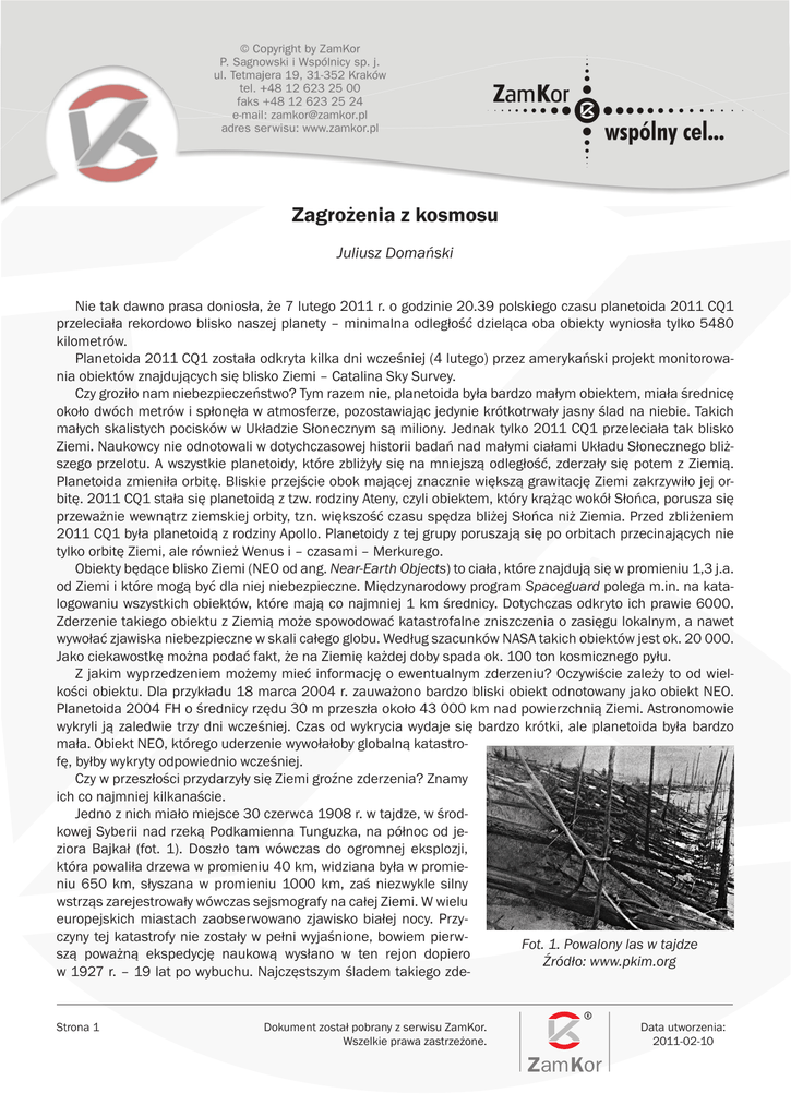 Zagrożenia z kosmosu Juliusz Domański Nie tak dawno prasa doniosła, że 7 lutego 2011 r. o godzinie 20.39 polskiego czasu planetoida 2011 CQ1 przeleciała rekordowo blisko naszej planety – minimalna odległość dzieląca oba obiekty wyniosła tylko 5480 kilometrów. Planetoida 2011 CQ1 została odkryta kilka dni wcześniej (4 lutego) przez amerykański projekt monitorowania obiektów znajdujących się blisko Ziemi – Catalina Sky Survey. Czy groziło nam niebezpieczeństwo? Tym razem nie, planetoida była bardzo małym obiektem, miała średnicę około dwóch metrów i spłonęła w atmosferze, pozostawiając jedynie krótkotrwały jasny ślad na niebie. Takich małych skalistych pocisków w Układzie Słonecznym są miliony. Jednak tylko 2011 CQ1 przeleciała tak blisko Ziemi. Naukowcy nie odnotowali w dotychczasowej historii badań nad małymi ciałami Układu Słonecznego bliższego przelotu. A wszystkie planetoidy, które zbliżyły się na mniejszą odległość, zderzały się potem z Ziemią. Planetoida zmieniła orbitę. Bliskie przejście obok mającej znacznie większą grawitację Ziemi zakrzywiło jej orbitę. 2011 CQ1 stała się planetoidą z tzw. rodziny Ateny, czyli obiektem, który krążąc wokół Słońca, porusza się przeważnie wewnątrz ziemskiej orbity, tzn. większość czasu spędza bliżej Słońca niż Ziemia. Przed zbliżeniem 2011 CQ1 była planetoidą z rodziny Apollo. Planetoidy z tej grupy poruszają się po orbitach przecinających nie tylko orbitę Ziemi, ale również Wenus i – czasami – Merkurego. Obiekty będące blisko Ziemi (NEO od ang. Near-Earth Objects) to ciała, które znajdują się w promieniu 1,3 j.a. od Ziemi i które mogą być dla niej niebezpieczne. Międzynarodowy program Spaceguard polega m.in. na katalogowaniu wszystkich obiektów, które mają co najmniej 1 km średnicy. Dotychczas odkryto ich prawie 6000. Zderzenie takiego obiektu z Ziemią może spowodować katastrofalne zniszczenia o zasięgu lokalnym, a nawet wywołać zjawiska niebezpieczne w skali całego globu. Według szacunków NASA takich obiektów jest ok. 20 000. Jako ciekawostkę można podać fakt, że na Ziemię każdej doby spada ok. 100 ton kosmicznego pyłu. Z jakim wyprzedzeniem możemy mieć informację o ewentualnym zderzeniu? Oczywiście zależy to od wielkości obiektu. Dla przykładu 18 marca 2004 r. zauważono bardzo bliski obiekt odnotowany jako obiekt NEO. Planetoida 2004 FH o średnicy rzędu 30 m przeszła około 43 000 km nad powierzchnią Ziemi. Astronomowie wykryli ją zaledwie trzy dni wcześniej. Czas od wykrycia wydaje się bardzo krótki, ale planetoida była bardzo mała. Obiekt NEO, którego uderzenie wywołałoby globalną katastrofę, byłby wykryty odpowiednio wcześniej. Czy w przeszłości przydarzyły się Ziemi groźne zderzenia? Znamy ich co najmniej kilkanaście. Jedno z nich miało miejsce 30 czerwca 1908 r. w tajdze, w środkowej Syberii nad rzeką Podkamienna Tunguzka, na północ od jeziora Bajkał (fot. 1). Doszło tam wówczas do ogromnej eksplozji, która powaliła drzewa w promieniu 40 km, widziana była w promieniu 650 km, słyszana w promieniu 1000 km, zaś niezwykle silny wstrząs zarejestrowały wówczas sejsmografy na całej Ziemi. W wielu europejskich miastach zaobserwowano zjawisko białej nocy. Przyczyny tej katastrofy nie zostały w pełni wyjaśnione, bowiem pierwFot. 1. Powalony las w tajdze szą poważną ekspedycję naukową wysłano w ten rejon dopiero Źródło: www.pkim.org w 1927 r. – 19 lat po wybuchu. Najczęstszym śladem takiego zde- Strona 1 Dokument został pobrany z serwisu ZamKor. Wszelkie prawa zastrzeżone. Data utworzenia: 2011-02-10 Zam Kor rzenia jest krater uderzeniowy – owalne zagłębienie (lub zniekształcenie) na powierzchni Ziemi lub innego ciała niebieskiego. Dobrze znany jest krater w Arizonie (fot. 2). Zderzenie miało miejsce ok. 50 000 lat temu. Krater ma ok. 1,5 kilometra średnicy. Fot. 2. Krater w Arizonie Źródło: www.en.wikipedia.org Szacuje się, że uderzający obiekt miał średnicę 150 m i masę 300 000 ton. Największy zachowany fragment, który można oglądać w centrum dla zwiedzających, waży 750 kg. Były to jednak stosunkowo niewielkie kolizje powodujące jedynie lokalne zniszczenia. Na Ziemi do tej pory odkryto około 160 dużych kraterów. Najstarszy z nich to Vredefort w Afryce Południowej o średnicy 180 km, liczący około 2,5 miliarda lat. Największy (prawdopodobny) znaleziony na Ziemi krater leży pod lądolodem Antarktydy, mierzy ponad 500 km średnicy i ma 250 milionów lat. Planetoida, która wybiła ten krater, miała przypuszczalnie 40 km średnicy i spowodowała zarówno wielkie wymieranie z przełomu permu i triasu, jak i przyczyniła się do rozpadu superkontynentu Gondwany. Innym przypuszczalnym kraterem o podobnej średnicy jest krater Śiwa u zachodnich wybrzeży Indii, związany z wymieraniem kredowym. Jak widać, poważniejsze katastrofy, przynajmniej w czasie ostatniego miliarda lat (wiek Ziemi ocenia się na ok. 4,5 miliarda lat), nie przytrafiały się naszej planecie zbyt często. Inaczej było z pewnością we wczesnym okresie jej istnienia. Świadczy o tym m.in. wygląd Księżyca (fot. 3) i Merkurego, globów, na których erozja i inne Fot. 3. Kratery procesy nie zacierały śladów zderzeń. na Księżycu Kometa D/Shoemaker-Levy odkryta 24 marca 1993 r. przez Carolyn i Euge- Źródło: Henseling Robert ne’a Shoemmakerów i Davida Levy’ego została przechwycona przez oddziaływanie grawitacyjne Jowisza i na pewien czas stała się jego satelitą, obiegając wraz z nim Słońce. Podczas przejścia komety przez punkt położony najbliżej Jowisza, pod wpływem silnego pola grawitacyjnego kometa rozpadła się na wiele części. Przy kolejnym powrocie – 16 lipca 1994 r. – pozostałości te upadły na powierzchnię Jowisza, co zaobserwowali astronomowie zarówno za pomocą instrumentów na Ziemi, jak i kamer zainstalo