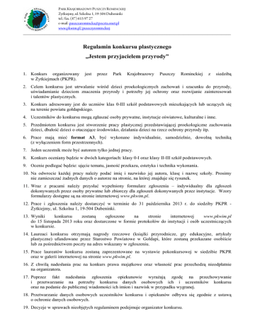 PARK KRAJOBRAZOWY PUSZCZY ROMINCKIEJ Żytkiejmy, ul. Szkolna 1, 19-504 Dubeninki tel./fax. (87) 615 97 27 e-mail: [email protected] www.pkwim.pl/puszczyrominckiej ________________________________________________________________________________________ Regulamin konkursu plastycznego „Jestem przyjacielem przyrody” 1. Konkurs organizowany w Żytkiejmach (PKPR). jest przez Park Krajobrazowy Puszczy Rominckiej z siedzibą 2. Celem konkursu jest utrwalanie wśród dzieci proekologicznych zachowań i szacunku do przyrody, uświadamianie dzieciom znaczenia przyrody i potrzeby jej ochrony oraz rozwijanie zainteresowań i talentów plastycznych. 3. Konkurs adresowany jest do uczniów klas 0-III szkół podstawowych mieszkających lub uczących się na terenie powiatu gołdapskiego. 4. Uczestników do konkursu mogą zgłaszać osoby prywatne, instytucje oświatowe, kulturalne i inne. 5. Przedmiotem konkursu jest stworzenie pracy plastycznej przedstawiającej proekologiczne zachowania dzieci, dbałość dzieci o otaczające środowisko, działania dzieci na rzecz ochrony przyrody itp. 6. Prace mają mieć format A3, być wykonane indywidualnie, samodzielnie, dowolną techniką (z wyłączeniem form przestrzennych). 7. Jeden uczestnik może być autorem tylko jednej pracy. 8. Konkurs oceniany będzie w dwóch kategoriach: klasy 0-I oraz klasy II-III szkół podstawowych. 9. Ocenie podlegać będzie: ujęcie tematu, jasność przekazu, estetyka i technika wykonania. 10. Na odwrocie każdej pracy należy podać imię i nazwisko jej autora, klasę i nazwę szkoły. Prosimy nie zamieszczać żadnych danych o autorze na stronie, na której znajduje się rysunek. 11. Wraz z pracami należy przysłać wypełniony formularz zgłoszenia – indywidualny dla zgłoszeń dokonywanych przez osoby prywatne lub zbiorczy dla zgłoszeń dokonywanych przez instytucje. Wzory formularzy dostępne są na stronie internetowej www.pkwim.pl. 12. Prace i zgłoszenia należy dostarczyć w terminie do 31 października 2013 r. do siedziby PKPR Żytkiejmy, ul. Szkolna 1, 19-504 Dubeninki. 13. Wyniki konkursu zostaną ogłoszone na stronie internetowej www.pkwim.pl do 15 listopada 2013 roku oraz dostarczone w formie protokołów do instytucji i osób uczestniczących w konkursie. 14. Laureaci konkursu otrzymają nagrody rzeczowe (książki przyrodnicze, gry edukacyjne, artykuły plastyczne) ufundowane przez Starostwo Powiatowe w Gołdapi, które zostaną przekazane osobiście lub za pośrednictwem poczty na adres wskazany w zgłoszeniu. 15. Prace laureatów konkursu zostaną zaprezentowane na wystawie pokonkursowej w siedzibie PKPR oraz w galerii internetowej na stronie www.pkwim.pl. 16. Z chwilą nadesłania prac na konkurs prawa majątkowe oraz własność prac przechodzą nieodpłatnie na organizatora. 17. Poprzez fakt nadesłania zgłoszenia opiekunowie wyrażają zgodę na przechowywanie i przetwarzanie na potrzeby konkursu danych osobowych ich i uczestników konkursu oraz na podanie do publicznej wiadomości ich imion i nazwisk w przypadku wygranej. 18. Przetwarzanie danych osobowych uczestników konkursu i opiekunów odbywa się zgodnie z ustawą o ochronie danych osobowych. 19. Decyzje w sprawach nieobjętych regulaminem podejmuje organizator konkursu.