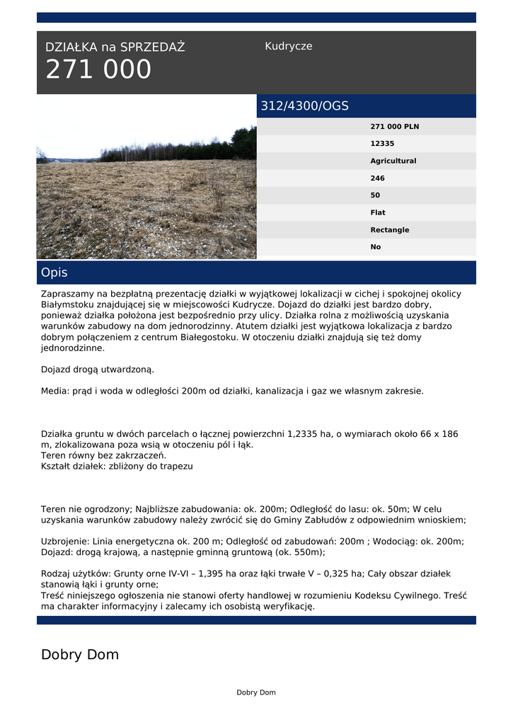 DZIAŁKA na SPRZEDAŻ Kudrycze 271 000 312/4300/OGS 271 000 PLN 12335 Agricultural 246 50 Flat Rectangle No Opis Zapraszamy na bezpłatną prezentację działki w wyjątkowej lokalizacji w cichej i spokojnej okolicy Białymstoku znajdującej się w miejscowości Kudrycze. Dojazd do działki jest bardzo dobry, ponieważ działka położona jest bezpośrednio przy ulicy. Działka rolna z możliwością uzyskania warunków zabudowy na dom jednorodzinny. Atutem działki jest wyjątkowa lokalizacja z bardzo dobrym połączeniem z centrum Białegostoku. W otoczeniu działki znajdują się też domy jednorodzinne. Dojazd drogą utwardzoną. Media: prąd i woda w odległości 200m od działki, kanalizacja i gaz we własnym zakresie. Działka gruntu w dwóch parcelach o łącznej powierzchni 1,2335 ha, o wymiarach około 66 x 186 m, zlokalizowana poza wsią w otoczeniu pól i łąk. Teren równy bez zakrzaczeń. Kształt działek: zbliżony do trapezu Teren nie ogrodzony; Najbliższe zabudowania: ok. 200m; Odległość do lasu: ok. 50m; W celu uzyskania warunków zabudowy należy zwrócić się do Gminy Zabłudów z odpowiednim wnioskiem; Uzbrojenie: Linia energetyczna ok. 200 m; Odległość od zabudowań: 200m ; Wodociąg: ok. 200m; Dojazd: drogą krajową, a następnie gminną gruntową (ok. 550m); Rodzaj użytków: Grunty orne IV-VI – 1,395 ha oraz łąki trwałe V – 0,325 ha; Cały obszar działek stanowią łąki i grunty orne; Treść niniejszego ogłoszenia nie stanowi oferty handlowej w rozumieniu Kodeksu Cywilnego. Treść ma charakter informacyjny i zalecamy ich osobistą weryfikację. Dobry Dom Dobry Dom tel. 690 692 915 email: [email protected] Dobry Dom Powered by TCPDF (www.tcpdf.org)