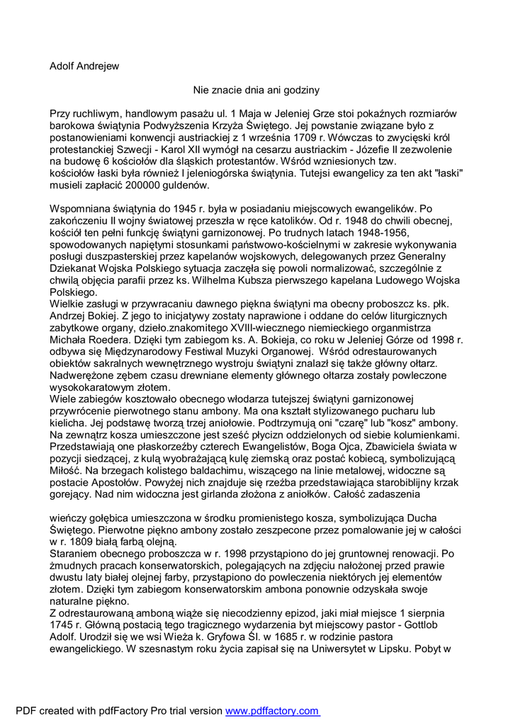 Adolf Andrejew Nie znacie dnia ani godziny Przy ruchliwym, handlowym pasażu ul. 1 Maja w Jeleniej Grze stoi pokaźnych rozmiarów barokowa świątynia Podwyższenia Krzyża Świętego. Jej powstanie związane było z postanowieniami konwencji austriackiej z 1 września 1709 r. Wówczas to zwycięski król protestanckiej Szwecji - Karol XII wymógł na cesarzu austriackim - Józefie II zezwolenie na budowę 6 kościołów dla śląskich protestantów. Wśród wzniesionych tzw. kościołów łaski była również I jeleniogórska świątynia. Tutejsi ewangelicy za ten akt "łaski" musieli zapłacić 200000 guldenów. Wspomniana świątynia do 1945 r. była w posiadaniu miejscowych ewangelików. Po zakończeniu II wojny światowej przeszła w ręce katolików. Od r. 1948 do chwili obecnej, kościół ten pełni funkcję świątyni garnizonowej. Po trudnych latach 1948-1956, spowodowanych napiętymi stosunkami państwowo-kościelnymi w zakresie wykonywania posługi duszpasterskiej przez kapelanów wojskowych, delegowanych przez Generalny Dziekanat Wojska Polskiego sytuacja zaczęła się powoli normalizować, szczególnie z chwilą objęcia parafii przez ks. Wilhelma Kubsza pierwszego kapelana Ludowego Wojska Polskiego. Wielkie zasługi w przywracaniu dawnego piękna świątyni ma obecny proboszcz ks. płk. Andrzej Bokiej. Z jego to inicjatywy zostaty naprawione i oddane do celów liturgicznych zabytkowe organy, dzieło.znakomitego XVIII-wiecznego niemieckiego organmistrza Michała Roedera. Dzięki tym zabiegom ks. A. Bokieja, co roku w Jeleniej Górze od 1998 r. odbywa się Międzynarodowy Festiwal Muzyki Organowej. Wśród odrestaurowanych obiektów sakralnych wewnętrznego wystroju świątyni znalazł się także główny ołtarz. Nadwerężone zębem czasu drewniane elementy głównego ołtarza zostały powleczone wysokokaratowym złotem. Wiele zabiegów kosztowało obecnego włodarza tutejszej świątyni garnizonowej przywrócenie pierwotnego stanu ambony. Ma ona kształt stylizowanego pucharu lub kielicha. Jej podstawę tworzą trzej aniołowie. Podtrzymują oni "czarę" lub "kosz" ambony. Na zewnątrz kosza umieszczone jest sześć płycizn oddzielonych od siebie kolumienkami. Przedstawiają one płaskorzeźby czterech Ewangelistów, Boga Ojca, Zbawiciela świata w pozycji siedzącej, z kulą wyobrażającą kulę ziemską oraz postać kobiecą, symbolizującą Miłość. Na brzegach kolistego baldachimu, wiszącego na linie metalowej, widoczne są postacie Apostołów. Powyżej nich znajduje się rzeźba przedstawiająca starobiblijny krzak gorejący. Nad nim widoczna jest girlanda złożona z aniołków. Całość zadaszenia wieńczy gołębica umieszczona w środku promienistego kosza, symbolizująca Ducha Świętego. Pierwotne piękno ambony zostało zeszpecone przez pomalowanie jej w całości w r. 1809 białą farbą olejną. Staraniem obecnego proboszcza w r. 1998 przystąpiono do jej gruntownej renowacji. Po żmudnych pracach konserwatorskich, polegających na zdjęciu nałożonej przed prawie dwustu laty białej olejnej farby, przystąpiono do powleczenia niektórych jej elementów złotem. Dzięki tym zabiegom konserwatorskim ambona ponownie odzyskała swoje naturalne piękno. Z odrestaurowaną amboną wiąże się niecodzienny epizod, jaki miał miejsce 1 sierpnia 1745 r. Główną postacią tego tragicznego wydarzenia byt miejscowy pastor - Gottlob Adolf. Urodził się we wsi Wieża k. Gryfowa ŚI. w 1685 r. w rodzinie pastora ewangelickiego. W szesnastym roku życia zapisał się na Uniwersytet w Lipsku. Pobyt w PDF created with pdfFactory Pro trial version www.pdffactory.com lipskiej uczelni G. Adolf uwieńczył zdobyciem tytułu magistra. W roku 1713 młody wychowanek akademii lipskiej został zatrudniony w jeleniogórskim gimnazjum ewangelickim. Po siedmiu latach pracy z młodzieżą został powołany na stanowisko pastora w Gross Hennersdorfie k. Żytawy. W r. 1726 otrzymał nominację na podobne stanowisko w Jeleniej Górze. Miejscowe kroniki określają G. Adolfa jako duszpasterza odznaczającego się wielką żarliwością w przepowiadaniu Ewangelii i rozwijaniu ducha religijnego wśród powierzonych sobie wiernych. O jego zapale w pracy duszpasterskiej mogły świadczyć układane przez niego teksty pieśni religijnych, związane z tematyką Starego i Nowego Testamentu. W celebrowaniu wszelkich nabożeństw, a w szczególności w głoszeniu Słowa Bożego, G. Adolf starał się ukazywać wiernym obowiązki, jakie spoczywają na uczniach Boskiego Mistrza. Temu celowi służyły liczne kazania, które wygłaszał na tematy związane ze Starym i Nowym Testamentem. Jedno z takich kazań G. Adolf wygłosił w siódmą niedzielę po Zesłaniu Ducha Świętego tj. 1 sierpnia 1745 r. Za temat rozważań przyjął sprawę wiecznego zbawienia człowieka. Wygłosił je podczas popołudniowego nabożeństwa, o godz. 14.45. Słoneczna, sierpniowa pogoda nie zapowiadała jakichś nadzwyczajnych wydarzeń. Z ust kaznodziei płynęły napomnienia dla wiernych, że każdy z nas musi z wielką bojaźnią i trwogą pracować na własne zbawienie. Zwracając się w kornej prośbie do Wszechmogącego Boga, prosił Stwórcę o przemianę serc siłą rażenia pioruna. Wypowiadając te słowa w swym zapale krasomówczym, G. Adolf nie spodziewał się, że zostanie w tak dramatycznych okolicznościach odwołany do wieczności przez dawcę wszelkiego życia. Nie przeczuwał, że będzie to jego ostatnie kazanie w życiu. Podczas homilii nad Jelenią Górę nasunęły się ciemne, kłębiaste, deszczowe chmury. Miasto spowiły nieprzeniknione ciemności. Wnętrze świątyni ogarnęły nocne mroki. Wkrótce rozszalała się straszna nawałnica. Towarzyszyły jej liczne wyładowania atmosferyczne. Wszędzie słychać byty odgłosy uderzających piorunów. Jeden z nich uderzył w wieżę kościoła. Dostał się do wnętrza świątyni po nieizolowanych metalowych przedmiotach i ozdobach znajd