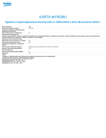 Nazwadostawcy Beko Model(identyfikatormodelu) FSE1072 Kategoriaurządzeniachłodniczegodla gospodarstwdomowych - Klasaefektywnościenergetycznej A+ OznakowanieekologiczneUE - Zużycieenergii189kWhrocznienapodstawiewynikówtestuprzeprowadzonegownormalnychwarunkachwcyklu24godzinnym.Rzeczywistezużycieenergiizależyod sposobuużytkowaniaurządzeniaimiejsca,wktórymsięonoznajduje. Pojemnośćnettochłodziarki[litry] - Pojemnośćnettozamrażarki(***)*[litry] 85 Systembezszronowy(NoFrost) Nie Temperaturaprojektowa"pozostałych komór" - Czaswzrostutemperatury[godz.] Bezpiecznyczasprzechowywania13godzinbezzasilania Zdolnośćzamrażania[kg/24godz.] 10,5 Klasaklimatyczna* - Poziomemitowanegohałasu[dB(A)] 42 Zabudowa Nie Uwagi *Zgodniezzadeklarowanąklasaklimatycznąurządzenieprzeznaczonejestdoużytkowania wtemperaturachotoczeniazpodanegoponiżejzakresu: Rozszerzonaumiarkowana(SN):od+10°Cdo+32°C Umiarkowana(N):od+16°Cdo+32°C Subtropikalna(ST):od+16°Cdo+38°C Tropikalna(T):od+16°Cdo+43°C