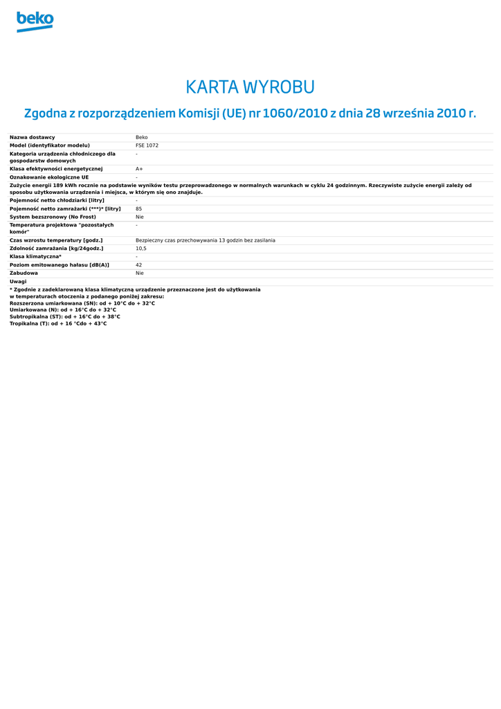 Nazwa dostawcy Beko Model (identyfikator modelu) FSE 1072