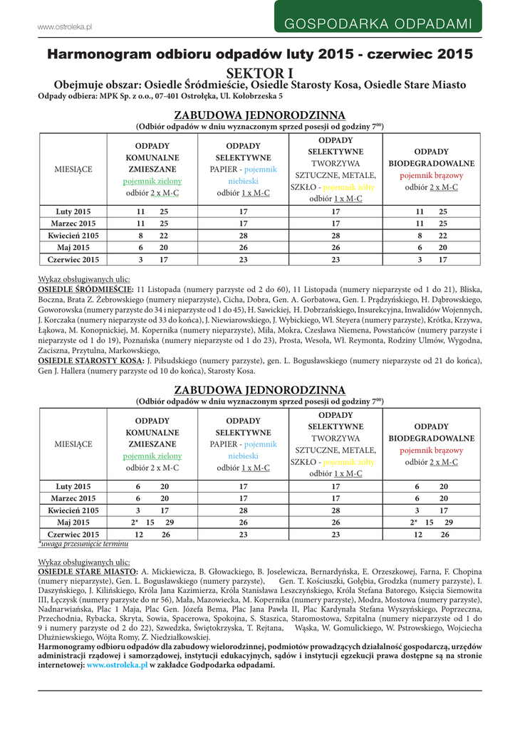 G O S P O D A RK A O D PA DAM I www.ostroleka.pl Harmonogram odbioru odpadów luty 2015 - czerwiec 2015 SEKTOR I Obejmuje obszar: Osiedle Śródmieście, Osiedle Starosty Kosa, Osiedle Stare Miasto Odpady odbiera: MPK Sp. z o.o., 07-401 Ostrołęka, Ul. Kołobrzeska 5 ZABUDOWA JEDNORODZINNA (Odbiór odpadów w dniu wyznaczonym sprzed posesji od godziny 700) MIESIĄCE Luty 2015 Marzec 2015 Kwiecień 2105 Maj 2015 Czerwiec 2015 ODPADY KOMUNALNE ZMIESZANE pojemnik zielony odbiór 2 x M-C 11 11 8 6 3 25 25 22 20 17 ODPADY SELEKTYWNE PAPIER - pojemnik niebieski odbiór 1 x M-C ODPADY SELEKTYWNE TWORZYWA SZTUCZNE, METALE, SZKŁO - pojemnik żółty odbiór 1 x M-C 17 17 28 26 23 17 17 28 26 23 ODPADY BIODEGRADOWALNE pojemnik brązowy odbiór 2 x M-C 11 11 8 6 3 25 25 22 20 17 Wykaz obsługiwanych ulic: OSIEDLE ŚRÓDMIEŚCIE: 11 Listopada (numery parzyste od 2 do 60), 11 Listopada (numery nieparzyste od 1 do 21), Bliska, Boczna, Brata Z. Żebrowskiego (numery nieparzyste), Cicha, Dobra, Gen. A. Gorbatowa, Gen. I. Prądzyńskiego, H. Dąbrowskiego, Goworowska (numery parzyste do 34 i nieparzyste od 1 do 45), H. Sawickiej, H. Dobrzańskiego, Insurekcyjna, Inwalidów Wojennych, J. Korczaka (numery nieparzyste od 33 do końca), J. Niewiarowskiego, J. Wybickiego, Wł. Steyera (numery parzyste), Krótka, Krzywa, Łąkowa, M. Konopnickiej, M. Kopernika (numery nieparzyste), Miła, Mokra, Czesława Niemena, Powstańców (numery parzyste i nieparzyste od 1 do 19), Poznańska (numery nieparzyste od 1 do 23), Prosta, Wesoła, Wł. Reymonta, Rodziny Ulmów, Wygodna, Zaciszna, Przytulna, Markowskiego, OSIEDLE STAROSTY KOSA: J. Piłsudskiego (numery parzyste), gen. L. Bogusławskiego (numery nieparzyste od 21 do końca), Gen J. Hallera (numery parzyste od 10 do końca), Starosty Kosa. ZABUDOWA JEDNORODZINNA (Odbiór odpadów w dniu wyznaczonym sprzed posesji od godziny 700) MIESIĄCE ODPADY KOMUNALNE ZMIESZANE pojemnik zielony odbiór 2 x M-C Luty 2015 6 20 Marzec 2015 6 20 Kwiecień 2105 3 17 Maj 2015 2* 15 29 Czerwiec 2015 12 26 *uwaga przesunięcie terminu ODPADY SELEKTYWNE PAPIER - pojemnik niebieski odbiór 1 x M-C ODPADY SELEKTYWNE TWORZYWA SZTUCZNE, METALE, SZKŁO - pojemnik żółty odbiór 1 x M-C ODPADY BIODEGRADOWALNE pojemnik brązowy odbiór 2 x M-C 17 17 28 26 23 17 17 28 26 23 6 20 6 20 3 17 2* 15 29 12 26 Wykaz obsługiwanych ulic: OSIEDLE STARE MIASTO: A. Mickiewicza, B. Głowackiego, B. Joselewicza, Bernardyńska, E. Orzeszkowej, Farna, F. Chopina (numery nieparzyste), Gen. L. Bogusławskiego (numery parzyste), Gen. T. Kościuszki, Gołębia, Grodzka (numery parzyste), I. Daszyńskiego, J. Kilińskiego, Króla Jana Kazimierza, Króla Stanisława Leszczyńskiego, Króla Stefana Batorego, Księcia Siemowita III, Łęczysk (numery parzyste do nr 56), Mała, Mazowiecka, M. Kopernika (numery parzyste), Modra, Mostowa (numery parzyste), Nadnarwiańska, Plac 1 Maja, Plac Gen. Józefa Bema, Plac Jana Pawła II, Plac Kardynała Stefana Wyszyńskiego, Poprzeczna, Przechodnia, Rybacka, Skryta, Sowia, Spacerowa, Spokojna, S. Staszica, Staromostowa, Szpitalna (numery nieparzyste od 1 do 9 i numery parzyste od 2 do 22), Szwedzka, Świętokrzyska, T. Rejtana, Wąska, W. Gomulickiego, W. Pstrowskiego, Wojciecha Dłużniewskiego, Wójta Romy, Z. Niedziałkowskiej. Harmonogramy odbioru odpadów dla zabudowy wielorodzinnej, podmiotów prowadzących działalność gospodarczą, urzędów administracji rządowej i samorządowej, instytucji edukacyjnych, sądów i instytucji egzekucji prawa dostępne są na stronie internetowej: www.ostroleka.pl w zakładce Godpodarka odpadami. GO SP O DARKA ODPADA M I www.ostroleka.pl Harmonogram odbioru odpadów luty 2015 - czerwiec 2015 SEKTOR II Obejmuje obszar: Osiedle Bursztynowe, Osiedle Łęczysk, Osiedle Pomian, Osiedle Sienkiewicza, Osiedle Leśne, Osiedle Łazek Odpady odbiera: KONSORCJUM: 1. STAUBACH SP. Z O.O., 00-102 Warszawa, ul. Marszałkowska 111, 2. MS-EKO SP. Z O.O. 18-416 Zbójna, Jurki 64 ZABUDOWA JEDNORODZINNA (Odbiór odpadów w dniu wyznaczonym sprzed posesji od godziny 700) MIESIĄCE ODPADY KOMUNALNE ODPADY SELEKTYWNE ODPADY SELEKTYWNE ZMIESZANE PAPIER - pojemnik TWORZYWA SZTUCZNE, pojemnik zielony niebieski METALE, SZKŁO - pojemnik żółty odbiór 2 x M-C odbiór 1 x M-C odbiór 1 x M-C Luty 2015 Marzec 2015 Kwiecień 2105 Maj 2015 Czerwiec 2015 * uwaga przesunięcie terminu 12 12 9 7 3* 26 26 23 21 18 23 23 20 18 15 ODPADY BIODEGRADOWALNE pojemnik brązowy odbiór 2 x M-C 23 23 20 18 15 12 12 9 7 3* 26 26 23 21 18 Wykaz obsługiwanych ulic: CAŁY SEKTOR OSIEDLE LEŚNE: Akacjowa, Brzozowa, Bukowa, Dębowa, Grabowa, Jabłoniowa, Jałowcowa, Jarzębinowa, Jesionowa, Jodłowa, Kasztanowa, Klonowa, Leszczynowa, Leśna, Lipowa, Ogródkowa, Olszynowa, Pogodna, Sobótkowa, Sosnowa, Świerkowa, Topolowa, Warszawska, Wiązowa, Wierzbowa OSIEDLE ŁAZEK: S. Brzóski, Bitwy pod Ostrołęką, Działkowa, Fortowa, Gościniec Mazurski, Millenium, Obozowa, Okopowa, Orła Bielika, Otok, J.K. Ordona, Z. Padlewskiego, G. Pajewskiego, K. Piotrowskiego, Pamięci Narodowej, Redutowa, A. Spiro, L. Staniszewskiego, Słoneczna, Stacha Konwy, Z. Sierakowskiego, Szańcowa, Sztabowa, Sztandarowa OSIEDLE SIENKIEWICZA: 6 Września, S. Jaracza, J. Kędzierskiego, J. Krasickiego, J. Korczaka, Kosynierów, M. Kasprzaka, H. Modrzejewskiej, Nowa, S. Okrzei, Powstańców, W. Reymonta, F. Stefczyka, P. Wysockiego, Wilcza, OSIEDLE POMIAN: Chemiczna, Goworowska, Agrestowa, A. Bednarczyka „Adama”, Boh. Monte Casino, Błękitna, Brzoskwiniowa, M. Dziemieszkiewicza „Roja”, Ekologiczna, Jeżynowa, Jęczmienna, Kolorowa, Lazurowa, Łubinowa, Malinowa, Miodowa, Morelowa, Owsiana, Pomian, Pomarańczowa, Sadowa, I. Sendlerowej, Siewna, Srebrna, Sybiraków, Tatarakowa, Tęczowa, Turkusowa, Wiśniowa, Zbożowa, Złota, Żniwna, Żytnia OSIEDLE ŁĘCZYSK: Z. Czarnego, F. Chopina, S. Czarnieckiego, Gospodarcza, Grodzka, Juranda ze Spychowa, W. Jagiełły, Kmicica, Łęczysk /numery nieparzyst