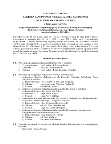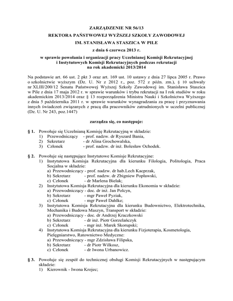 ZARZĄDZENIE NR 56/13 REKTORA PAŃSTWOWEJ WYŻSZEJ SZKOŁY ZAWODOWEJ IM. STANISŁAWA STASZICA W PILE z dnia 6 czerwca 2013 r. w sprawie powołania i organizacji pracy Uczelnianej Komisji Rekrutacyjnej i Instytutowych Komisji Rekrutacyjnych podczas rekrutacji na rok akademicki 2013/2014 Na podstawie art. 66 ust. 2 pkt 3 oraz art. 169 ust. 10 ustawy z dnia 27 lipca 2005 r. Prawo o szkolnictwie wyższym (Dz. U. Nr z 2012 r., poz. 572 z późn. zm.), § 10 uchwały nr XLIII/200/12 Senatu Państwowej Wyższej Szkoły Zawodowej im. Stanisława Staszica w Pile z dnia 17 maja 2012 r. w sprawie warunków i trybu rekrutacji na I rok studiów w roku akademickim 2013/2014 oraz § 13 rozporządzenia Ministra Nauki i Szkolnictwa Wyższego z dnia 5 października 2011 r. w sprawie warunków wynagradzania za pracę i przyznawania innych świadczeń związanych z pracą dla pracowników zatrudnionych w uczelni publicznej (Dz. U. Nr 243, poz.1447) zarządza się, co następuje: § 1. Powołuje się Uczelnianą Komisję Rekrutacyjną w składzie: 1) Przewodniczący - prof. nadzw. dr Ryszard Bania, 2) Sekretarz - dr Alina Grochowalska, 3) Członek - prof. nadzw. dr inż. Bolesław Ochodek. § 2. Powołuje się następujące Instytutowe Komisje Rekrutacyjne: 1) Instytutowa Komisja Rekrutacyjna dla kierunku Filologia, Politologia, Praca Socjalna w składzie: a) Przewodniczący - prof. nadzw. dr hab.Lech Kacprzak, b) Sekretarz - prof. nadzw. dr Zbigniew Popławski, c) Członek - dr Marlena Bielak; 2) Instytutowa Komisja Rekrutacyjna dla kierunku Ekonomia w składzie: a) Przewodniczący - doc. dr inż. Jan Polcyn, b) Sekretarz - mgr Paweł Pyziak, c) Członek - mgr Paweł Dahlke; 3) Instytutowa Komisja Rekrutacyjna dla kierunku Budownictwo, Elektrotechnika, Mechanika i Budowa Maszyn, Transport w składzie: a) Przewodniczący - doc. dr Andrzej Kraczkowski b) Sekretarz - dr inż. Piotr Gorzelańczyk c) Członek - mgr inż. Marek Skorupski; 4) Instytutowa Komisja Rekrutacyjna dla kierunku Fizjoterapia, Kosmetologia, Pielęgniarstwo, Ratownictwo Medyczne: a) Przewodniczący - mgr Zdzisława Filipska, b) Sekretarz - dr Piotr Wilkosz, c) Członek - dr Iwona Urbanowicz. § 3. Powołuje się zespół do technicznej obsługi Komisji Rekrutacyjnych w następującym składzie: 1) Kierownik - Iwona Krojec; 2) Członkowie: a) Instytut Humanistyczny: Renata Herba, Joanna Han, Anna Garlicka, b) Instytut Ekonomiczny: Jolanta Michalska, Lucyna Szuster, c) Instytut Politechniczny: Aneta Wawszkiewicz-Prus, Małgorzata Głyżewska, Katarzyna Szuster, d) Instytut Ochrony Zdrowia: Hanna Basarewska, Magdalena Kasprowicz, Marta Burda, e) Uczelniana Komisja Rekrutacyjna: Magdalena Ochwat, f) nadzór nad programem e-Rekrut: Marcin Ślawski, oraz Paulina Andrejczuk, Monika Pająk. § 4. 1. Za pracę w komisjach nauczycielom akademickim przyznaje się wynagrodzenie według poniższych stawek: 1) Uczelniana Komisja Rekrutacyjna: a) Przewodniczący Komisji - 1300 zł, b) Sekretarz Komisji - 1100 zł, c) Członek - 1100 zł; 2) Instytutowa Komisja Rekrutacyjna: a) Przewodniczący Komisji - 1100 zł, b) Sekretarz Komisji - 1000 zł, c) Członek - 1000 zł. 2. Stawki określone w ust. 1 dotyczą całego procesu rekrutacji. § 5. Za pracę w zespole technicznej obsługi komisji rekrutacyjnej członkom zespołu przysługuje wynagrodzenie w formie zwiększonej premii. § 6. Postępowanie kwalifikacyjne należy przeprowadzić w dniu 19 sierpnia 2013 r. na studia stacjonarne oraz w dniu 23 września 2013 r. na studia niestacjonarne, przestrzegając zasad określonych w uchwale nr XLIII/200/12 Senatu Państwowej Wyższej Szkoły Zawodowej im. Stanisława Staszica w Pile z dnia 17 maja 2012 r. w sprawie warunków i trybu rekrutacji na I rok studiów w roku akademickim 2013/2014. § 7. Nadzór nad przygotowaniem i przeprowadzeniem rekrutacji na rok akademicki 2013/2014 powierza się Prorektorowi ds. Dydaktyki i Studentów. § 8. W przypadku konieczności przeprowadzenia dodatkowej rekrutacji składy komisji rekrutacyjnych pozostają bez zmian. § 9. Decyzję o przeprowadzeniu dodatkowej rekrutacji podejmuje Rektor. § 10. Wykonanie zarządzenia powierza się Prorektorowi ds. Dydaktyki i Studentów. § 11. Zarządzenie wchodzi w życie z dniem podpisania. Rektor Państwowej Wyższej Szkoły Zawodowej im. Stanisława Staszica w Pile prof. dr hab. Adam Marcinkowski
