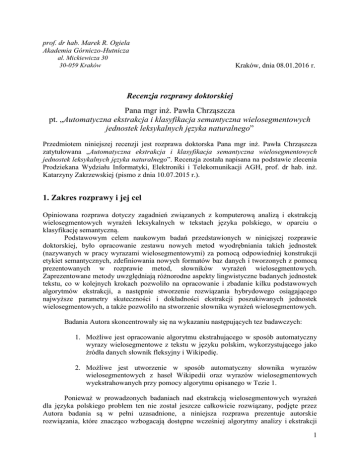 prof. dr hab. Marek R. Ogiela Akademia Górniczo-Hutnicza al. Mickiewicza 30 30-059 Kraków Kraków, dnia 08.01.2016 r. Recenzja rozprawy doktorskiej Pana mgr inż. Pawła Chrząszcza pt. „Automatyczna ekstrakcja i klasyfikacja semantyczna wielosegmentowych jednostek leksykalnych języka naturalnego” Przedmiotem niniejszej recenzji jest rozprawa doktorska Pana mgr inż. Pawła Chrząszcza zatytułowana „Automatyczna ekstrakcja i klasyfikacja semantyczna wielosegmentowych jednostek leksykalnych języka naturalnego”. Recenzja została napisana na podstawie zlecenia Prodziekana Wydziału Informatyki, Elektroniki i Telekomunikacji AGH, prof. dr hab. inż. Katarzyny Zakrzewskiej (pismo z dnia 10.07.2015 r.). 1. Zakres rozprawy i jej cel Opiniowana rozprawa dotyczy zagadnień związanych z komputerową analizą i ekstrakcją wielosegmentowych wyrażeń leksykalnych w tekstach języka polskiego, w oparciu o klasyfikację semantyczną. Podstawowym celem naukowym badań przedstawionych w niniejszej rozprawie doktorskiej, było opracowanie zestawu nowych metod wyodrębniania takich jednostek (nazywanych w pracy wyrazami wielosegmentowymi) za pomocą odpowiedniej konstrukcji etykiet semantycznych, zdefiniowania nowych formatów baz danych i tworzonych z pomocą prezentowanych w rozprawie metod, słowników wyrażeń wielosegmentowych. Zaprezentowane metody uwzględniają różnorodne aspekty lingwistyczne badanych jednostek tekstu, co w kolejnych krokach pozwoliło na opracowanie i zbadanie kilku podstawowych algorytmów ekstrakcji, a następnie stworzenie rozwiązania hybrydowego osiągającego najwyższe parametry skuteczności i dokładności ekstrakcji poszukiwanych jednostek wielosegmentowych, a także pozwoliło na stworzenie słownika wyrażeń wielosegmentowych. Badania Autora skoncentrowały się na wykazaniu następujących tez badawczych: 1. Możliwe jest opracowanie algorytmu ekstrahującego w sposób automatyczny wyrazy wielosegmentowe z tekstu w języku polskim, wykorzystującego jako źródła danych słownik fleksyjny i Wikipedię. 2. Możliwe jest utworzenie w sposób automatyczny słownika wyrazów wielosegmentowych z haseł Wikipedii oraz wyrazów wielosegmentowych wyekstrahowanych przy pomocy algorytmu opisanego w Tezie 1. Ponieważ w prowadzonych badaniach nad ekstrakcją wielosegmentowych wyrażeń dla języka polskiego problem ten nie został jeszcze całkowicie rozwiązany, podjęte przez Autora badania są w pełni uzasadnione, a niniejsza rozprawa prezentuje autorskie rozwiązania, które znacząco wzbogacają dostępne wcześniej algorytmy analizy i ekstrakcji 1 jednostek wielosegmentowych. Przeprowadzone badania pozwoliły stwierdzić, z jaką˛ dokładnością można wydzielić poszukiwane jednostki w zasobach Wikipedii, ale także z nieuporządkowanych tekstów języka polskiego bez użycia wcześniej „otagowanych” zbiorów treningowych. Ważną częścią realizowanej tematyki badawczej były praktyczne implementacje i testy algorytmów pozwalające dokonywać ekstrakcji jednostek wielosegmentowych, które w rezultacie pozwoliły na zdefiniowanie najbardziej skutecznej metody będącej połączeniem metod bazowych i uzyskującej wysokie procentowe wskaźniki precyzji i pełności ekstrakcji. Opracowane algorytmy, jako nowatorskie stały się także punktem odniesienia do dalszych badań w tym zakresie i pozwalają na utworzenie brakujących zasobów zawierających jednostki wielosegmentowe dla języka polskiego. Po zapoznaniu się z rozprawą można nabrać pewności, że zastosowanie autorskich rozwiązań opisanych w pracy do analizy i ekstrakcji wyrażeń wielosegmentowych znacząco wzbogaca wcześniej znane metody lingwistyki komputerowej wykorzystywane do podobnych zadań. Opracowane algorytmy stanowią doskonałe narzędzia pozwalające na automatyczną ekstrakcję takich jednostek w obszernych repozytoriach internetowych lub bazach danych zawierających teksty języka polskiego. 2. Forma realizacji i układ rozprawy Rozprawa doktorska jest obszernym opracowaniem składającym się ze 170 stron zawierającym 13 rozdziałów w tym podsumowanie i dodatek oraz na końcu bibliografię. Rozdziały 1-3 to wstęp do pracy, który zawiera wprowadzenie do zagadnień związanych z określeniem wielosegmentowych jednostek leksykalnych oraz przedstawia tezy pracy, a także rozdział dotyczący stanu badań z zakresu podjętej tematyki, i rozdział opisujący narzędzia słownikowe opracowane na użytek prowadzonych badań. Rozdziały 4-10 są poświęcone na prezentację metodologii badawczej oraz autorskich rozwiązań zaproponowanych na użytek ekstrakcji wyrażeń wielosegmentowych w różnych zasobach lingwistycznych, oraz przy użyciu różnych metod badawczych. Doktorant prezentuje w tych rozdziałach kolejne zadania ekstrakcji oraz uzyskane rezultaty dzięki zastosowaniu kolejno definiowanych algorytmów ekstrakcji. Rozdział 11 prezentuje kierunki dalszych badań i możliwości rozwoju zaprezentowanych technik, natomiast rozdział 12 jest podsumowaniem dysertacji pokazującym, w jaki sposób zostały wykazane początkowe tezy pracy oraz prezentuje wszystkie osiągnięcia Autora w trakcie prowadzonych badań. Ostatni rozdział 13 jest dodatkiem prezentującym funkcjonalność opracowanych procedur i kody źródłowe implementowanych procedur. 3. Oryginalne osiągnięcia badawcze Za najważniejsze, oryginalne osiągnięcia Autora, przedstawione w recenzowanej rozprawie, uważam: 1. Porównanie możliwości i skuteczności ekstrakcji jednostek wielosegmentowych z zasobów Wikipedii i Wikisłownika i wykazanie większej użyteczności tekstów Wikipedii do prowadzenia skutecznej ekstrakcji takich jednostek. 2 2. Adaptacja wcześniej opracowanego algorytmu ekstrakcji etykiet semantycznych, dla haseł Wikipedii, który uzyskał ponad 94% dokładność ekstrakcji etykiet semantycznych. 3. Zaproponowanie obszernej metodologii ekstrakcji wyrażeń wielosegmentowy