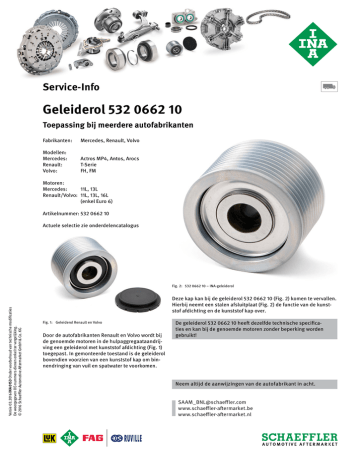 Service-Info Geleiderol 532 0662 10 Toepassing bij meerdere autofabrikanten Fabrikanten: Mercedes, Renault, Volvo Modellen: Mercedes: Actros MP4, Antos, Arocs Renault:T-Serie Volvo: FH, FM Motoren: Mercedes: 11L, 13L Renault/Volvo: 11L, 13L, 16L (enkel Euro 6) Artikelnummer:532 0662 10 Actuele selectie zie onderdelencatalogus Versie 03.2016 INA 0153 Onder voorbehoud van technische modificaties De weergegeven OE-nummers dienen enkel ter vergelijking. © 2016 Schaeffler Automotive Aftermarket GmbH & Co. KG Fig. 2: 532 0662 10 – INA-geleiderol Deze kap kan bij de geleiderol 532 0662 10 (Fig. 2) komen te vervallen. Hierbij neemt een stalen afsluitplaat (Fig. 2) de functie van de kunststof afdichting en de kunststof kap over. Fig. 1: Geleiderol Renault en Volvo Door de autofabrikanten Renault en Volvo wordt bij de genoemde motoren in de hulpaggregaataandrijving een geleiderol met kunststof afdichting (Fig. 1) toegepast. In gemonteerde toestand is de geleiderol bovendien voorzien van een kunststof kap om binnendringing van vuil en spatwater te voorkomen. De geleiderol 532 0662 10 heeft dezelfde technische specificaties en kan bij de genoemde motoren zonder beperking worden gebruikt! Neem altijd de aanwijzingen van de autofabrikant in acht. [email protected] www.schaeffler-aftermarket.be www.schaeffler-aftermarket.nl
