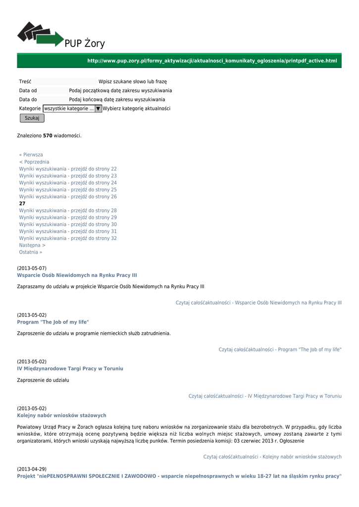 PUP Żory http://www.pup.zory.pl/formy_aktywizacji/aktualnosci_komunikaty_ogloszenia/printpdf_active.html Treść Wpisz szukane słowo lub frazę Data od Podaj początkową datę zakresu wyszukiwania Data do Podaj końcową datę zakresu wyszukiwania Kategorie wszystkie kategorie ... ▼ Wybierz kategorię aktualności Szukaj Znaleziono 570 wiadomości. « Pierwsza < Poprzednia Wyniki wyszukiwania - przejdź do strony 22 Wyniki wyszukiwania - przejdź do strony 23 Wyniki wyszukiwania - przejdź do strony 24 Wyniki wyszukiwania - przejdź do strony 25 Wyniki wyszukiwania - przejdź do strony 26 27 Wyniki wyszukiwania - przejdź do strony 28 Wyniki wyszukiwania - przejdź do strony 29 Wyniki wyszukiwania - przejdź do strony 30 Wyniki wyszukiwania - przejdź do strony 31 Wyniki wyszukiwania - przejdź do strony 32 Następna > Ostatnia » (2013-05-07) Wsparcie Osób Niewidomych na Rynku Pracy III Zapraszamy do udziału w projekcie Wsparcie Osób Niewidomych na Rynku Pracy III Czytaj całośćaktualności - Wsparcie Osób Niewidomych na Rynku Pracy III (2013-05-02) Program "The Job of my life" Zaproszenie do udziału w programie niemieckich służb zatrudnienia. Czytaj całośćaktualności - Program "The Job of my life" (2013-05-02) IV Międzynarodowe Targi Pracy w Toruniu Zaproszenie do udziału Czytaj całośćaktualności - IV Międzynarodowe Targi Pracy w Toruniu (2013-05-02) Kolejny nabór wniosków stażowych Powiatowy Urząd Pracy w Żorach ogłasza kolejną turę naboru wniosków na zorganizowanie stażu dla bezrobotnych. W przypadku, gdy liczba wniosków, które otrzymają ocenę pozytywną będzie większa niż liczba wolnych miejsc stażowych, umowy zostaną zawarte z tymi organizatorami, których wnioski uzyskają najwyższą liczbę punków. Termin posiedzenia komisji: 03 czerwiec 2013 r. Ogłoszenie Czytaj całośćaktualności - Kolejny nabór wniosków stażowych (2013-04-29) Projekt "niePEŁNOSPRAWNI SPOŁECZNIE I ZAWODOWO - wsparcie niepełnosprawnych w wieku 18-27 lat na śląskim rynku pracy" Katolickie Centrum Edukacji Młodzieży KANA zaprasza do udziału w projekcie Czytaj całośćaktualności - Projekt "niePEŁNOSPRAWNI SPOŁECZNIE I ZAWODOWO - wsparcie niepełnosprawnych w wieku 18-27 lat na śląskim rynku pracy" (2013-04-26) www.timmp.pl Rozpoczął się nabór na cykl SPECJALISTYCZNYCH SZKOLEŃ PRAKTYCZNYCH dla pracowników lub właścicieli mikro i małych przedsiębiorstw Czytaj całośćaktualności - www.timmp.pl (2013-04-23) Pośrednik Pracy W dniu 23.04.2013 r. Powiatowy Urząd Pracy w Żorach ogłasza nabór na stanowisko Pośrednik Pracy. Czytaj całośćaktualności - Pośrednik Pracy (2013-04-19) Orientacja zawodowa w Gimnazjum Żorski urząd pracy nawiązał współpracę z kolejną szkołą. Jest nią Gimnazjum nr 4 na osiedlu Księcia Władysława. Czytaj całośćaktualności - Orientacja zawodowa w Gimnazjum (2013-04-18) Przedszkolaki w PUP Żory. Dnia 15.04.2013 Powiatowy Urząd Pracy w Żorach gościł dzieci z Przedszkola nr 23 im. Lucyny Krzemienieckiej w Żorach. Czytaj całośćaktualności - Przedszkolaki w PUP Żory. (2013-04-16) TARGI PRACY 2013 Czytaj całośćaktualności - TARGI PRACY 2013 « Pierwsza < Poprzednia Wyniki wyszukiwania - przejdź do strony 22 Wyniki wyszukiwania - przejdź do strony 23 Wyniki wyszukiwania - przejdź do strony 24 Wyniki wyszukiwania - przejdź do strony 25 Wyniki wyszukiwania - przejdź do strony 26 27 Wyniki wyszukiwania - przejdź do strony 28 Wyniki wyszukiwania - przejdź do strony 29 Wyniki wyszukiwania - przejdź do strony 30 Wyniki wyszukiwania - przejdź do strony 31 Wyniki wyszukiwania - przejdź do strony 32 Następna > Ostatnia »