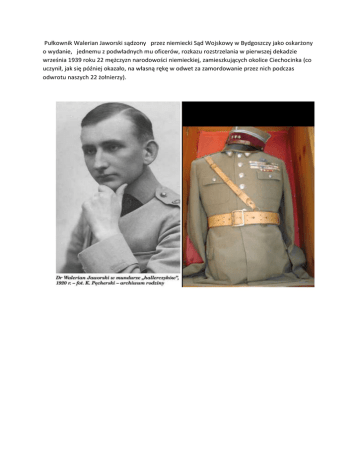 Pułkownik Walerian Jaworski sądzony przez niemiecki Sąd Wojskowy w Bydgoszczy jako oskarżony o wydanie, jednemu z podwładnych mu oficerów, rozkazu rozstrzelania w pierwszej dekadzie września 1939 roku 22 mężczyzn narodowości niemieckiej, zamieszkujących okolice Ciechocinka (co uczynił, jak się później okazało, na własną rękę w odwet za zamordowanie przez nich podczas odwrotu naszych 22 żołnierzy).