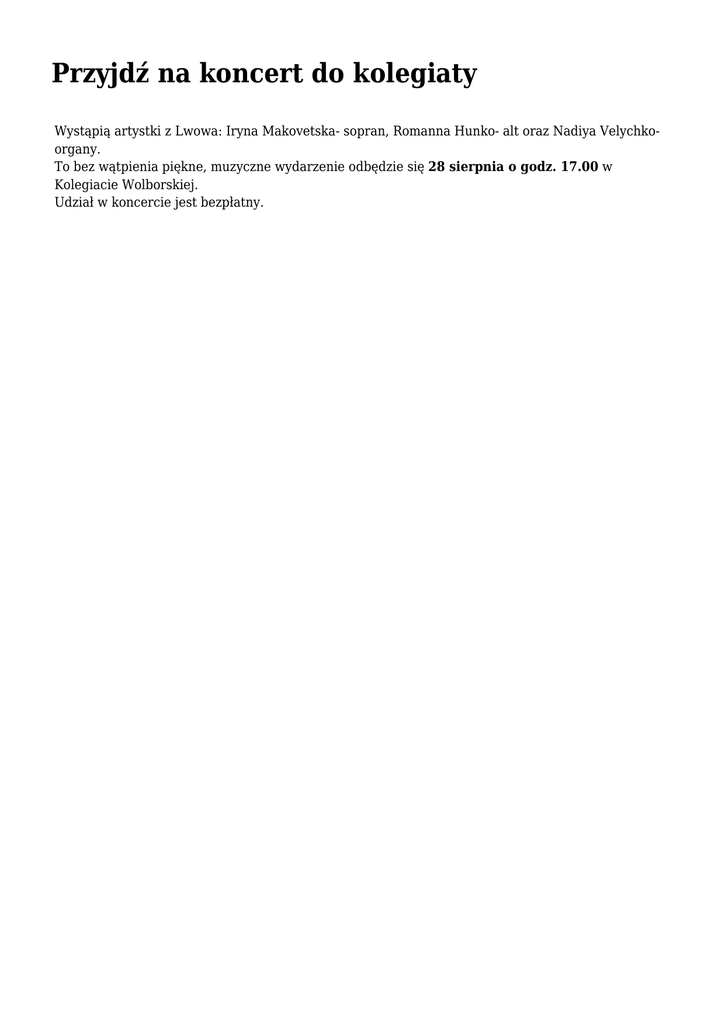 Przyjdź na koncert do kolegiaty Wystąpią artystki z Lwowa: Iryna Makovetska- sopran, Romanna Hunko- alt oraz Nadiya Velychkoorgany. To bez wątpienia piękne, muzyczne wydarzenie odbędzie się 28 sierpnia o godz. 17.00 w Kolegiacie Wolborskiej. Udział w koncercie jest bezpłatny.