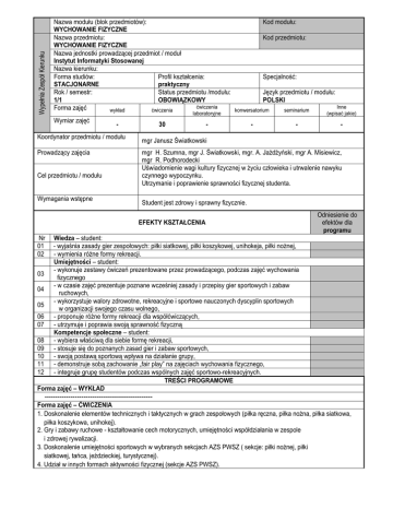 Wypełnia Zespół Kierunku Nazwa modułu (blok przedmiotów): Kod modułu: WYCHOWANIE FIZYCZNE Nazwa przedmiotu: Kod przedmiotu: WYCHOWANIE FIZYCZNE Nazwa jednostki prowadzącej przedmiot / moduł Instytut Informatyki Stosowanej Nazwa kierunku: Forma studiów: Profil kształcenia: Specjalność: STACJONARNE praktyczny Rok / semestr: Status przedmiotu /modułu: Język przedmiotu / modułu: 1/1 OBOWIĄZKOWY POLSKI ćwiczenia Inne Forma zajęć wykład ćwiczenia konwersatorium seminarium laboratoryjne (wpisać jakie) Wymiar zajęć - Koordynator przedmiotu / modułu Prowadzący zajęcia Cel przedmiotu / modułu Wymagania wstępne 30 - - - - mgr Janusz Światkowski mgr H. Szumna, mgr J. Światkowski, mgr. A. Jażdżyński, mgr A. Misiewicz, mgr R. Podhorodecki Uświadomienie wagi kultury fizycznej w życiu człowieka i utrwalenie nawyku czynnego wypoczynku. Utrzymanie i poprawienie sprawności fizycznej studenta. Student jest zdrowy i sprawny fizycznie. EFEKTY KSZTAŁCENIA Odniesienie do efektów dla programu Nr 01 02 Wiedza – student: - wyjaśnia zasady gier zespołowych: piłki siatkowej, piłki koszykowej, unihokeja, piłki nożnej, - wymienia różne formy rekreacji. Umiejętności – student: - wykonuje zestawy ćwiczeń prezentowane przez prowadzącego, podczas zajęć wychowania 03 fizycznego - w czasie zajęć prezentuje poznane wcześniej zasady i przepisy gier sportowych i zabaw 04 ruchowych, - wykorzystuje walory zdrowotne, rekreacyjne i sportowe nauczonych dyscyplin sportowych 05 w organizacji swojego czasu wolnego, 06 - proponuje różne formy rekreacji dla współćwiczących, 07 - utrzymuje i poprawia swoją sprawność fizyczną Kompetencje społeczne – student: 08 - wybiera właściwą dla siebie formę rekreacji, 09 - stosuje się do poznanych zasad gier i zabaw sportowych, 10 - swoją postawą sportową wpływa na działanie grupy, 11 - demonstruje sobą zachowanie „fair play” na zajęciach wychowania fizycznego, 12 - integruje grupę studentów podczas wspólnych zajęć sportowo-rekreacyjnych. TREŚCI PROGRAMOWE Forma zajęć – WYKŁAD -------------------------------------------------Forma zajęć – ĆWICZENIA 1. Doskonalenie elementów technicznych i taktycznych w grach zespołowych (piłka ręczna, piłka nożna, piłka siatkowa, piłka koszykowa, unihokej). 2. Gry i zabawy ruchowe - kształtowanie cech motorycznych, umiejętności współdziałania w zespole i zdrowej rywalizacji. 3. Doskonalenie umiejętności sportowych w wybranych sekcjach AZS PWSZ ( sekcje: piłki nożnej, piłki siatkowej, tańca, jeździeckiej, turystycznej). 4. Udział w innych formach aktywności fizycznej (sekcje AZS PWSZ). Metody kształcenia METODY ZABAWOWA ŚCISŁA, ZADANIOWA ŚCISŁA ZABAWOWA KLASYCZNA , ZABAWOWA NAŚLADOWCZA, GRA Metody weryfikacji efektów kształcenia Nr efektu kształcenia z sylabusa Ocena cząstkowa: aktywność na zajęciach, sportowe zachowanie „fair play” Ocena formująca: postępy w sprawności fizycznej, Literatura podstawowa Zaliczenie na ocenę: - postępy w sprawności fizycznej (50%) - obecność na zajęciach (20%) - aktywność na zajęciach (15%) - sportowe zachowanie „fair play” (15%) ------------------------------------------------------------ Literatura uzupełniająca ------------------------------------------------------------ Forma i warunki zaliczenia 03 - 12 03 - 07 NAKŁAD PRACY STUDENTA: Udział w wykładach Samodzielne studiowanie tematyki wykładów Udział w ćwiczeniach audytoryjnych i laboratoryjnych* Samodzielne przygotowywanie się do ćwiczeń* Przygotowanie projektu / eseju / itp. * Przygotowanie się do egzaminu / zaliczenia Udział w konsultacjach Inne ŁĄCZNY nakład pracy studenta w godz. Liczba punktów ECTS za przedmiot Obciążenie studenta związane z zajęciami praktycznymi* Obciążenie studenta na zajęciach wymagających bezpośredniego udziału nauczycieli akademickich Liczba godzin 30 30 12 ECTS 0 30 1 ECTS