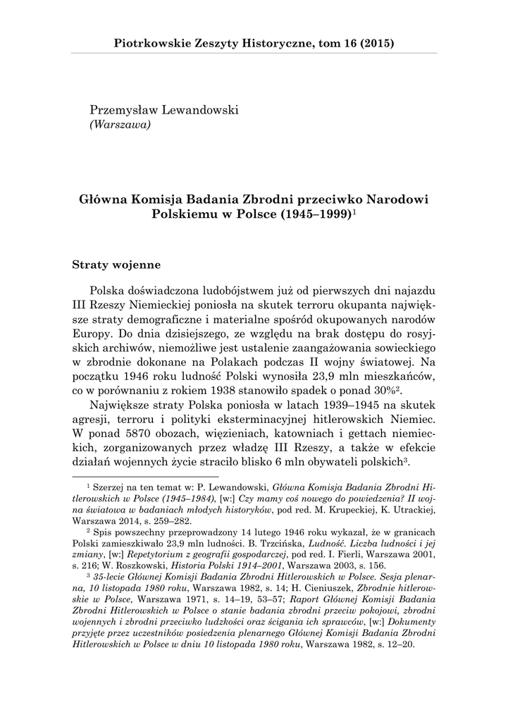 Piotrkowskie Zeszyty Historyczne, tom 16 (2015) Przemysław Lewandowski (Warszawa) Główna Komisja Badania Zbrodni przeciwko Narodowi Polskiemu w Polsce (1945–1999)1 Straty wojenne Polska doświadczona ludobójstwem już od pierwszych dni najazdu III Rzeszy Niemieckiej poniosła na skutek terroru okupanta największe straty demograficzne i materialne spośród okupowanych narodów Europy. Do dnia dzisiejszego, ze względu na brak dostępu do rosyjskich archiwów, niemożliwe jest ustalenie zaangażowania sowieckiego w zbrodnie dokonane na Polakach podczas II wojny światowej. Na początku 1946 roku ludność Polski wynosiła 23,9 mln mieszkańców, co w porównaniu z rokiem 1938 stanowiło spadek o ponad 30%2. Największe straty Polska poniosła w latach 1939–1945 na skutek agresji, terroru i polityki eksterminacyjnej hitlerowskich Niemiec. W ponad 5870 obozach, więzieniach, katowniach i gettach niemieckich, zorganizowanych przez władzę III Rzeszy, a także w efekcie działań wojennych życie straciło blisko 6 mln obywateli polskich3. Szerzej na ten temat w: P. Lewandowski, Główna Komisja Badania Zbrodni Hitlerowskich w Polsce (1945–1984), [w:] Czy mamy coś nowego do powiedzenia? II wojna światowa w badaniach młodych historyków, pod red. M. Krupeckiej, K. Utrackiej, Warszawa 2014, s. 259–282. 2 Spis powszechny przeprowadzony 14 lutego 1946 roku wykazał, że w granicach Polski zamieszkiwało 23,9 mln ludności. B. Trzcińska, Ludność. Liczba ludności i jej zmiany, [w:] Repetytorium z geografii gospodarczej, pod red. I. Fierli, Warszawa 2001, s. 216; W. Roszkowski, Historia Polski 1914–2001, Warszawa 2003, s. 156. 3 35-lecie Głównej Komisji Badania Zbrodni Hitlerowskich w Polsce. Sesja plenarna, 10 listopada 1980 roku, Warszawa 1982, s. 14; H. Cieniuszek, Zbrodnie hitlerowskie w Polsce, Warszawa 1971, s. 14–19, 53–57; Raport Głównej Komisji Badania Zbrodni Hitlerowskich w Polsce o stanie badania zbrodni przeciw pokojowi, zbrodni wojennych i zbrodni przeciwko ludzkości oraz ścigania ich sprawców, [w:] Dokumenty przyjęte przez uczestników posiedzenia plenarnego Głównej Komisji Badania Zbrodni Hitlerowskich w Polsce w dniu 10 listopada 1980 roku, Warszawa 1982, s. 12–20. 1 Przemysław Lewandowski Rozważając ogólny bilans strat ludnościowych Polski w okresie II wojny światowej, konieczne wydaje się przywołanie publikacji Biura Odszkodowań Wojennych działającego przy Prezydium Rady Ministrów z 1947 roku, gdzie pojawia się liczba 6 028 000 osób. Szef Biura Jerzy Osiecki przedstawił 17 grudnia 1946 roku trudności statystyków i demografów, jakie napotkali przy ustalaniu liczby polskich obywateli zabitych podczas wojny. Tymczasem aparatczyk Jakub Berman, pełniący wówczas funkcję podsekretarza stanu w Prezydium RN, stwierdził zdecydowanie: Ustalić liczbę zabitych na 6 mln ludzi4. Komunistyczna propaganda nie przez przypadek zawyżyła liczbę ofiar zamordowanych pod okupacją niemiecką. Chciała ukryć w ten sposób poległych, zamęczonych i deportowanych na Wschód przez Sowietów. Przecież w żadnym źródle jednoznacznie nie wykazano zbrodni NKWD, tych, którzy zginęli na Wschodzie, zwłaszcza w łagrach. Nie ujawniono także ofiar ludobójstwa, jakiego dopuścili się na Wołyniu i we wschodniej Galicji Ukraińcy. Listę ofiar niemieckich i ofiary represji pod okupacją niemiecką udało się ustalić dopiero przy realizacji Programu Straty Osobowe5 na liczbę 5,6–5,8 mln6. Po ataku ZSRS na Polskę 17 września 1939 roku, zajęciu i okupowaniu przez Armię Czerwoną wschodnich obszarów Rzeczypospolitej ustalono w porozumieniu z III Rzeszą, że ukształtowana zostanie linia graniczna przechodząca przez Polskę, a zarówno Polacy, jak i obywatele polscy innych narodowości zostali poddani brutalnym represjom aparatu przemocy ZSRS, których celem było złamanie społecznego morale i zdławienie w zarodku jakiejkolwiek konspiracji. Represje sowieckie wobec Polaków i obywateli polskich można podzielić na trzy zasadnicze grupy: represje dokonywane na jeńcach polskich w obozach sowieckiego Gułagu7, aresztowania na Kresach Wschodnich8 4 Szerzej na ten temat w: Ilu Polaków zginęło podczas II wojny światowej?, http://www.nto.pl/apps/pbcs.dll/article?AID=/20090828/REPORTAZ/545367516, [dostęp: 26 VIII 2014]; Prawie 6 mln Polaków zginęło w II wojnie światowej, http://wiadomosci.wp.pl/kat,1020231,title,Prawie-6-mln-Polakow-zginelo-w-II-wojnie-swiatowej,wid,11432099,wiadomosc.html?ticaid=113557, [dostęp: 26 VIII 2014]; Skala ludobójstwa na narodzie polskim 1944–1956, http://www.obiektywnie.com.pl/artykuly/skala-ludobojstwa-na-narodzie-polskim-1944-1956.html, [dostęp: 26 VIII 2014]. 5 Program „Straty osobowe i ofiary represji pod okupacją niemiecką”, http://www.straty.pl/, [dostęp: 05 II 2014]. 6 Polska 1939–1945. Straty osobowe i ofiary represji pod dwiema okupacjami, pod red. T. Szaroty, W. Materskiego, Instytut Pamięci Narodowej, Warszawa 2009. 7 Na temat sowieckich obozów więcej w: Indeks Represjonowanych, t. I–XIII, Warszawa 1999; Katyń. Dokumenty zbrodni, t. I–III, Warszawa 2001; S. Kalbarczyk, Wykaz łagrów sowieckich, miejsc przymusowej pracy obywateli polskich w latach 146 Główna Komisja Badania Zbrodni… oraz deportacje9. Ustalenie liczby polskich jeńców wojennych, którzy po agresji sowieckiej 17 września 1939 roku trafili do niewoli, mimo zdawałoby się znacznego dostępu do posowieckiej dokumentacji, wciąż jednak stanowi znaczny problem10. W momencie, gdy przystąpiono na mocy postanowienia Biura Politycznego Komitetu Centralnego Wszechzwiązkowej Komunistycznej Partii (bolszewików) z marca 1940 roku do realizacji decyzji o ludobójstwie, stan liczebny obozów specjalnych wynosił 14 736 osób11. Władze sowieckie dekretem z 12 sierpnia 1941 roku zarządziły amnestię. Najwyższa liczba obywateli polskich podlegających amnestii to 391 575 osób. Według stanu z 27 września 