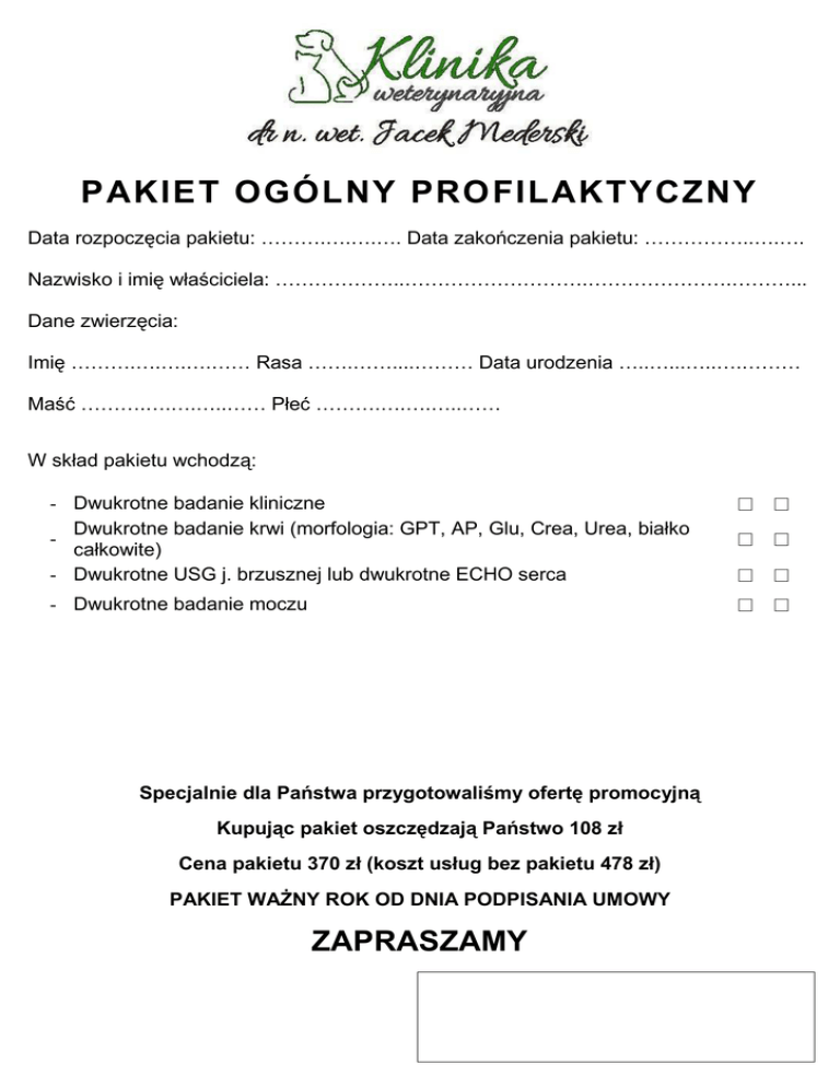 PAKIET OGÓLNY PROFILAKTYCZNY Data rozpoczęcia pakietu: ……….….….…. Data zakończenia pakietu: ……………..….…. Nazwisko i imię właściciela: ………………..……………………….………………….………... Dane zwierzęcia: Imię ……….….….….…… Rasa …….……....……… Data urodzenia …..…...…..….……… Maść ……….….….…..…… Płeć ……….….….…..…… W skład pakietu wchodzą: - Dwukrotne badanie kliniczne Dwukrotne badanie krwi (morfologia: GPT, AP, Glu, Crea, Urea, białko całkowite) - Dwukrotne USG j. brzusznej lub dwukrotne ECHO serca - Dwukrotne badanie moczu Specjalnie dla Państwa przygotowaliśmy ofertę promocyjną Kupując pakiet oszczędzają Państwo 108 zł Cena pakietu 370 zł (koszt usług bez pakietu 478 zł) PAKIET WAŻNY ROK OD DNIA PODPISANIA UMOWY ZAPRASZAMY