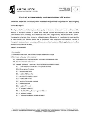 Physically and geometrically nonnon-linear structures – FE solution. Lecturer: Krzysztof Woznica (Ecole Nationale Supérieure d’Ingénieures de Bourges) Course description: Development of numerical analysis and computing of structures for industry needs push forward the analysis of structures beyond its elastic limits into the physical and geometric non linear domains. Afterwards the short summary of mechanics of solid in the range of large displacements the elastic – viscoplastics behaviour of the structures will be introduced. Discussion of hypotheses of decomposition of partly elastic and inelastic strain will be presented. The comparison of numerical variants of viscoplastic laws developed nowadays will be performed and problems of their applications in the finite element method will be recalled. Syllabus of the lecture 1. Introduction 2. Summary of the solids mechanics in larges deformation range 3. Non linear behaviour of the material 3.1. Decomposition of the stain tensor into elastic and inelastic part 3.2. Non-linear elastic behaviour 3.3. Inelastic behaviour – summary of constitutive viscoplastic models 3.3.1 Formulation of constitutive viscoplastic models 3.3.2. Examples of models 3.3.3 Model of Perzyna 3.3.4 Model of Chaboche 3.3.5 Model of Bodner – Partom 3.3.6 Model of Aubertin 3.3.7 Model of Lehmann-Imatani 3.3.8 Model of Miller 3.3.9 Model of Krempl 3.3.10 Model of Tanimura 3.3.11 Model of Krieg, Swearengen and Jones 3.3.12 Model of Walker 3.3.13 Model of Korhonen, Hannula and Li Projekt „Centrum Studiów Zaawansowanych - rozwój interdyscyplinarnych studiów doktoranckich na Politechnice Gdańskiej w obszarach kluczowych w kontekście celów Strategii Europa 2020” jest współfinansowany przez Unię Europejską w ramach Europejskiego Funduszu Społecznego 3.3.14 Model of Freed-Verrilli 3.4. Conclusions 4. Analysis of structures by the FE method 4.1. Equation of motion 4.1.1. Equation of motion and the FE method 4.1.1.1. Direct approach 4.1.1.2. Incremental approach 4.1.2. Integration methods of the equation of motion 4.1.2.1. Method of centered difference 4.2. Constituting laws integration 5. Experimentation and computing – validation of the model TERMINY WYKLADÓW Data Dzień tygodnia Godzina Sala 2014-03-18 Wt 15.00-18.00 GG 467F 2014-03-20 Cz 15.00-18.00 GG 467F 2014-03-25 Wt 15.00-18.00 GG 467F 2014-03-27 Cz 15.00-18.00 GG 467F Projekt „Centrum Studiów Zaawansowanych - rozwój interdyscyplinarnych studiów doktoranckich na Politechnice Gdańskiej w obszarach kluczowych w kontekście celów Strategii Europa 2020” jest współfinansowany przez Unię Europejską w ramach Europejskiego Funduszu Społecznego