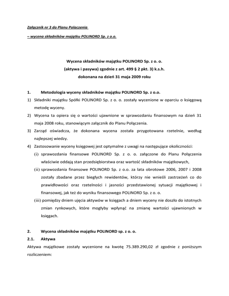 Załącznik nr 3 do Planu Polaczenia – wycena składników majątku POLINORD Sp. z o.o. Wycena składników majątku POLINORD Sp. z o. o. (aktywa i pasywa) zgodnie z art. 499 § 2 pkt. 3) k.s.h. dokonana na dzieo 31 maja 2009 roku 1. Metodologia wyceny składników majątku POLINORD Sp. z o.o. 1) Składniki majątku Spółki POLINORD Sp. z o. o. zostały wycenione w oparciu o księgową metodę wyceny. 2) Wycena ta opiera się o wartości ujawnione w sprawozdaniu finansowym na dzieo 31 maja 2008 roku, stanowiącym załącznik do Planu Połączenia. 3) Zarząd oświadcza, że dokonana wycena została przygotowana rzetelnie, według najlepszej wiedzy. 4) Zastosowanie wyceny księgowej jest optymalne z uwagi na następujące okoliczności: (i) sprawozdania finansowe POLINORD Sp. z o. o. załączone do Planu Połączenia właściwie oddają stan przedsiębiorstwa oraz wartośd składników majątkowych, (ii) sprawozdania finansowe POLINORD Sp. z o.o. za lata obrotowe 2006, 2007 i 2008 zostały zbadane przez biegłych rewidentów, którzy nie wnieśli zastrzeżeo co do prawidłowości oraz rzetelności i jasności przedstawionej sytuacji majątkowej i finansowej, jak też do wyniku finansowego POLINORD Sp. z o. o. (iii) pomiędzy dniem ujęcia aktywów w księgach a dniem wyceny nie doszło do istotnych zmian rynkowych, które mogłyby wpłynąd na zmianę wartości ujawnionych w księgach. 2. Wycena składników majątku POLINORD sp. z o. o. 2.1. Aktywa Aktywa majątkowe zostały wycenione na kwotę 75.389.290,02 zł zgodnie z poniższym rozliczeniem: 1) Wartośd aktywów trwałych ustalona została na kwotę 32.579.544,21 zł. Aktywa trwałe stanowią: a) Wartości niematerialne i prawne o wartości 751.576,32 zł; b) Rzeczowe aktywa trwałe o wartości 31.827.967,89 zł, tj.: Środki trwałe – 31.577.133,89 zł, z czego: grunty (w tym prawo użytkowania wieczystego gruntu) – 788.050,00 zł; Budynki, lokale i obiekty inżynierii lądowej i wodnej – 13.909.225,03 zł; Urządzenia techniczne i maszyny – 16.387.105,20 zł; Środki transportu – 472 816,53 zł; Inne środki trwałe – 19 937,13 zł; Środki trwałe w budowie – 250.834,00 zł. c) Należności długoterminowe – 0,00 zł; d) Inwestycje długoterminowe – 0,00 zł; e) Długoterminowe rozliczenia międzyokresowe - 0,00 zł. 2) Wartośd aktywów obrotowych ustalona została na kwotę 42.809.745,81 zł. Aktywa obrotowe stanowią: a) Zapasy (towary) o wartości: 10.068.298,04 zł, b) Należności krótkoterminowe o wartości: 32.341.635,85 zł, tj.: Należności od jednostek powiązanych – 26.021.255,73 zł; Należności od jednostek innych niż powiązane – 6.320.410,12 zł, z czego: Z tytułu dostaw i usług, o okresie spłaty do 12 miesięcy – 1.172.878,44 zł; Z tytułu podatków, dotacji, ceł, ubezpieczeo społecznych i zdrowotnych oraz innych świadczeo – 5.115.300,32 zł; Inne – 32.231,36 zł; c) Inwestycje krótkoterminowe (krótkoterminowe aktywa finansowe) – 261.846,14 zł; d) Krótkoterminowe rozliczenia międzyokresowe – 137.965,78 zł. 2.2. Pasywa Spółki Pasywa POLINORD Sp. z o. o. kształtują się na poziomie 75.389.290,02 zł. Zobowiązania i rezerwy na zobowiązania wynoszą 58.565.459,52 zł zgodnie z poniższym rozliczeniem: 2 a) Rezerwy na zobowiązania – 83.962,40 zł.; b) Zobowiązania długoterminowe wobec jednostek innych niż powiązane (z tytułu kredytów i pożyczek) – 7.218.903,95 zł; c) Zobowiązania krótkoterminowe w wysokości 44.437.148,62 zł, z czego: Zobowiązania wobec jednostek powiązanych z tytułu dostaw i usług o okresie wymagalności do 12 miesięcy – 4.961.762,14 zł; Zobowiązania wobec jednostek innych niż powiązane – 39.475.386,48 zł; z czego: Kredyty i pożyczki – 14.028.739,65 zł; Z tytułu dostaw i usług o okresie wymagalności do 12 miesięcy – 21.276.651,53 zł; Z tytułu podatków, ceł, ubezpieczeo i innych świadczeo – 3.688.122,61 zł; Z tytułu wynagrodzeo – 433.204,12 zł; Inne – 48.668,57 zł; d) Rozliczenia międzyokresowe o wartości 6.825.444,55 zł. 3. Wartośd bilansowa majątku Różnica pomiędzy aktywami Spółki, a ciążącymi na Spółce zobowiązaniami stanowi wartości bilansową majątku POLINORD Sp. z o.o. i jak wynika z przedstawionego zestawienia wynosi ona 16.823.830,50 zł (słownie: szesnaście milionów osiemset dwadzieścia trzy tysiące osiemset trzydzieści złotych 50/100). Zarząd POLINORD Sp. z o. o. 3