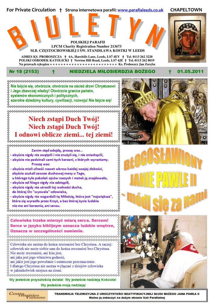 For Private Circulation † Strona internetowa parafii: www.parafialeeds.co.uk CHAPELTOWN POLSKIEJ PARAFII LPCM Charity Registration Number 213673 M.B. CZĘSTOCHOWSKIEJ I ŚW. STANISŁAWA KOSTKI W LEEDS ADRES KS. PROBOSZCZA † 6A, Harehills Lane, Leeds, LS7 4EY † Tel. 0113 262 3220 POLSKI OŚRODEK KATOLICKI † Newton Hill Road, Leeds, LS7 4JE † Tel. 0113 262 8019 Na prawach rękopisu + + + + + + + + + + + + + + + + + + + + + + + + + Ks. Proboszcz Jan Zaręba Nr 18 (2153) † NIEDZIELA MIŁOSIERDZIA BOŻEGO † 01.05.2011 PORZĄDEK MSZY ŚWIĘTYCH I NABOŻEŃSTW NIEDZIELA, 1 MAJA 2011; 2 WIELKANOCNA - MIŁOSIERDZIA BOŻEGO; HARROGATE 9:30 – Za śp. rodziców + Stanisława, + Katarzynę Szkoda i brata + Adolfa – int. pp Fletcher 10:30 – NABOŻEŃSTWO DO MIŁOSIERDZIA BOŻEGO 11.00 – Do Miłosierdzia Bożego z dziękczynieniem za ogłoszenie Błogosławionym Kościoła Świętego Jana Pawła II 11.00 – Do Miłosierdzia Bożego za wstawiennictwem Bł. Jana Pawła II z prośbą o Błogosławieństwo Boże dla Ojczyzny naszej Polski i wszystkich Polaków żyjących na emigracji aby zachowali skarb wiary świętej – dar int. Koła Żywego Różańca 16.30 – Do Miłosierdzia Bożego z prośbą o szczęśliwą podróż do Polski i powrót dla rodziny pp. Ćwiklińskich 19.00 – Do Miłosierdzia Bożego z prośbą o szczęśliwe rozwiązanie dla koleżanki Anny i zdrowie dla dziecka i mamy – dar intencji od scholii Pierwszego Dnia Tygodnia PONIEDZIAŁEK, 2 MAJA 2011; UROCZYSTOŚĆ ŚW. WOJCIECHA; 10.00 – Za śp. rodziców + Wandę i + Józefa Kujawiak w 5. rocznicę śmierci mamy – dar intencji od syna i córki z rodzinami 10:00 – Za śp. + Stanisława Ejsmond, + Teresę, + Marię, + Czesława Dolatów, + Jadwigę i + Bolesława Ginell, + Bolesława Wolińskiego oraz + Katarzynę Ważną – dar intencjod p. Heleny Monist 10:30 – NABOŻEŃSTWO MAJOWE WTOREK, 3 MAJA 2011; UROCZYSTOŚĆ NMP KRÓLOWEJ POLSKI; 10:00 – Za śp. + Józefa Lewandowskiego – dar intencji od p. Ewy Stasiuk z rodziną 10:30 – NABOŻEŃSTWO MAJOWE DO KRÓLOWEJ POLSKI 19:00 – Za śp. + Wojciecha Epstein – dar intencji od pani Barbary Malach z rodziną 19:30 – NABOŻEŃSTWO MAJOWE DO KRÓLOWEJ POLSKI ŚRODA, 4 MAJA 2011; Wspomnienie św. Floriana; 10:30 – NABOŻEŃSTWO MAJOWE 11:00 – Za śp. + Zofię i + Stanisława Chodor, + Rozalię, + Ludwika i + Stefana Korzępa oraz + Wandę Biedka 19:00 – Za śp. przyjaciela + Michała Kozaka tragicznie zmarłego w Polsce – intencja żałobna na uczestnictwo w pogrzebie w Polsce – dar od Marcina i Martyny Wójcik CZWARTEK, 5 MAJA 2011; Dzień powszedni; 10.00 – Za śp. + Weronikę Mikłaszewicz i + Julię Jentas, + Marię i + Józefa Sońko oraz + Bolesława Wolińskiego – dar intencji od p. Marii Osolińskiej 10:30 – NABOŻEŃSTWO MAJOWE PIĄTEK, 6 MAJA 2011; Święto św. Apostołów Filipa i Jakuba – I miesiąca ku czci NSPJ; 10.00 – Za śp. męża + Bogusława Piesiewicza – dar intencji od żony Alicji 10:30 – NABOŻEŃSTWO DO NSPJ 19.00 – Do NSPJ z prośbą o Błogosławieństwo Boże, potrzebne łaski i zdrowie dla mamy Danuty z okazji urodzin – dar intencji od córki Małgorzaty z rodziną 19:30 – NABOŻEŃSTWO MAJOWE SOBOTA, 7 MAJA 2011; Dzień powszedni; 8.30 – Za śp. rodziców + Jadwigę i + Czesława Kucewiczów – intencji od pp. D.J. Kucewicz 14:00 – CHRZEST – Oliwia Amelia GOMUŁA III NIEDZIELA WIELKANOCNA 18:00 – NABOŻEŃSTWO MAJOWE 18.30 – Za śp. męża + Stanisława Szymańskiego z okazji imienin – int. od żony Lusi z rodziną NIEDZIELA, 8 MAJA 2011; 3 WIELKANOCNA; 9:30 – Za śp. Ks. + Stanisława Kluza i Ks. + Czesława Rachotę – int. od pani Elżbiety Druś 10:30 – NABOŻEŃSTWO MAJOWE 11.00 – Do Miłosierdzia Bożego za wstawiennictwem NMP Królowej Polski i Bł. Jana Pawła II z prośbą o Błogosławieństwo Boże dla Ojczyzny naszej Polski i Polaków żyjących na emigracji, aby zachowali skarb wiary świętej – int. Polskiej Szkoły Sobotnie w Leeds 11:00 – CHRZEST – Alan Krzysztof TOMASZEWSKI PONTEFRACT 16.00 – Za śp. tatę + Terry Palmer – dar intencji od syna Janusza 19.00 – Do Miłosierdzia Bożego z prośbą o Błogosławieństwo Boże i łaskę zdrowia dla pani Stanisławy Pióro – dar intencji od pani Marii Sawosz OGŁOSZENIA DUSZPASTERSKIE * DZIŚ NIEDZIELA MIŁOSIERDZIA BOŻEGO - Śmierć i zmartwychwstanie Chrystusa najdobitniej przekonują nas o tym, że Bóg jest Miłością, że potrafi jedynie kochać i przebaczać. Jakże więc nie dziękować za wielki dar miłosierdzia, za łaskę sakramentu pokuty!? Jako Kościół, napełnieni paschalną radością, mamy teraz tylko jedno zadanie: głosić i uobecniać miłosierdzie Boga, objawione w Jezusie Chrystusie, który cierpiał za grzeszny świat, prawdziwie zmartwychwstał i żywy jest pośród nas. Warto w tym miejscu przypomnieć słowa Bł. Ojca Świętego Jana Pawła II: „Trzeba przekazywać światu ogień miłosierdzia. W miłosierdziu Boga świat znajdzie pokój, a człowiek szczęście! To zadanie powierzam wam, drodzy bracia i siostry, Kościołowi w Krakowie i w Polsce oraz wszystkim czcicielom Bożego miłosierdzia, którzy tutaj przybywać będą z Polski i z całego świata. Bądźcie świadkami miłosierdzia!” (Łagiewniki, 2002 r.). * NABOŻEŃSTWO DO MIŁOSIERDZIA BOŻEGO - dzisiaj przed Sumą o godz. 10:30. * ZMIANA TAJEMNIC ŻYWEGO RÓŻAŃCA - dzisiejszej niedzieli po Sumie, * „JUŻ SIĘ ZBILIŻYŁ MIESIĄC MAJ…” Dzisiaj wkraczamy w maryjny maj! Codziennie będziemy gromadzić się wokół ołtarza na Eucharystii, po której będziemy odprawiali majowe nabożeństwo. To w szkole Maryi uczmy się całkowitego oddania Bogu i braciom. Zadbajmy o Jej wizerunki w naszych domach. Rodzinnie gromadźmy się przy nich na śpiewanie Litanii loretańskiej, pieśni maryjnych, różaniec czy wieczorny Apel. Nabożeństwa majowe wg porządku nabożeństw na str.2. * I-WSZY PIĄT